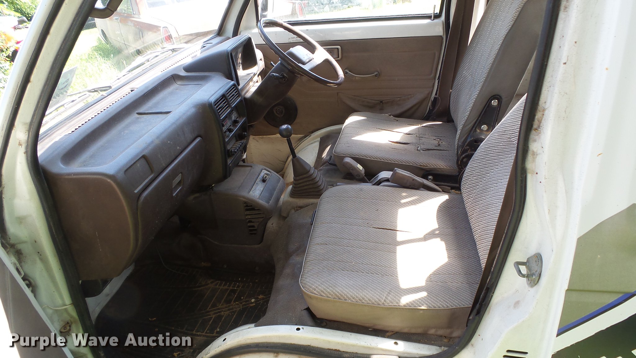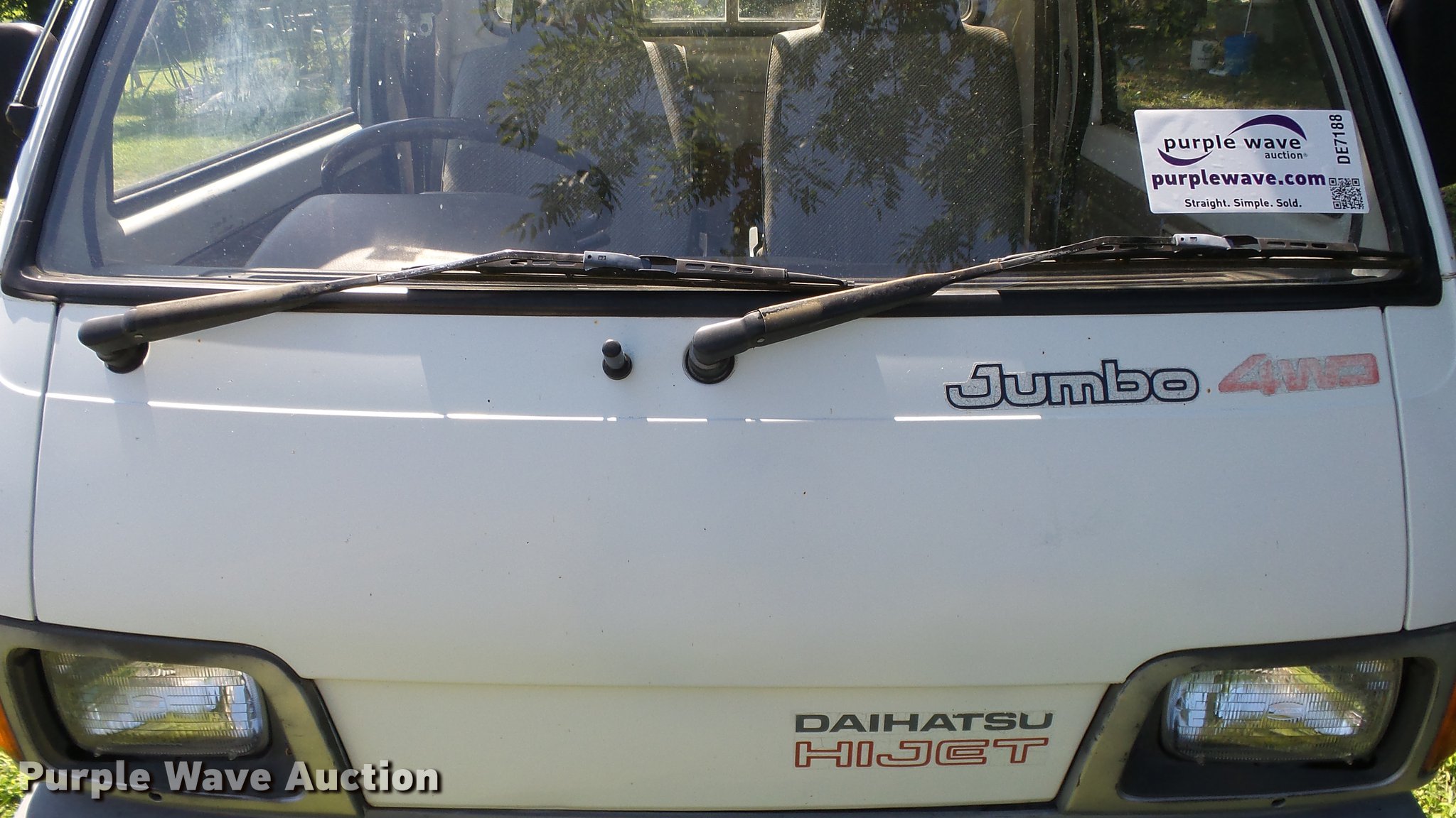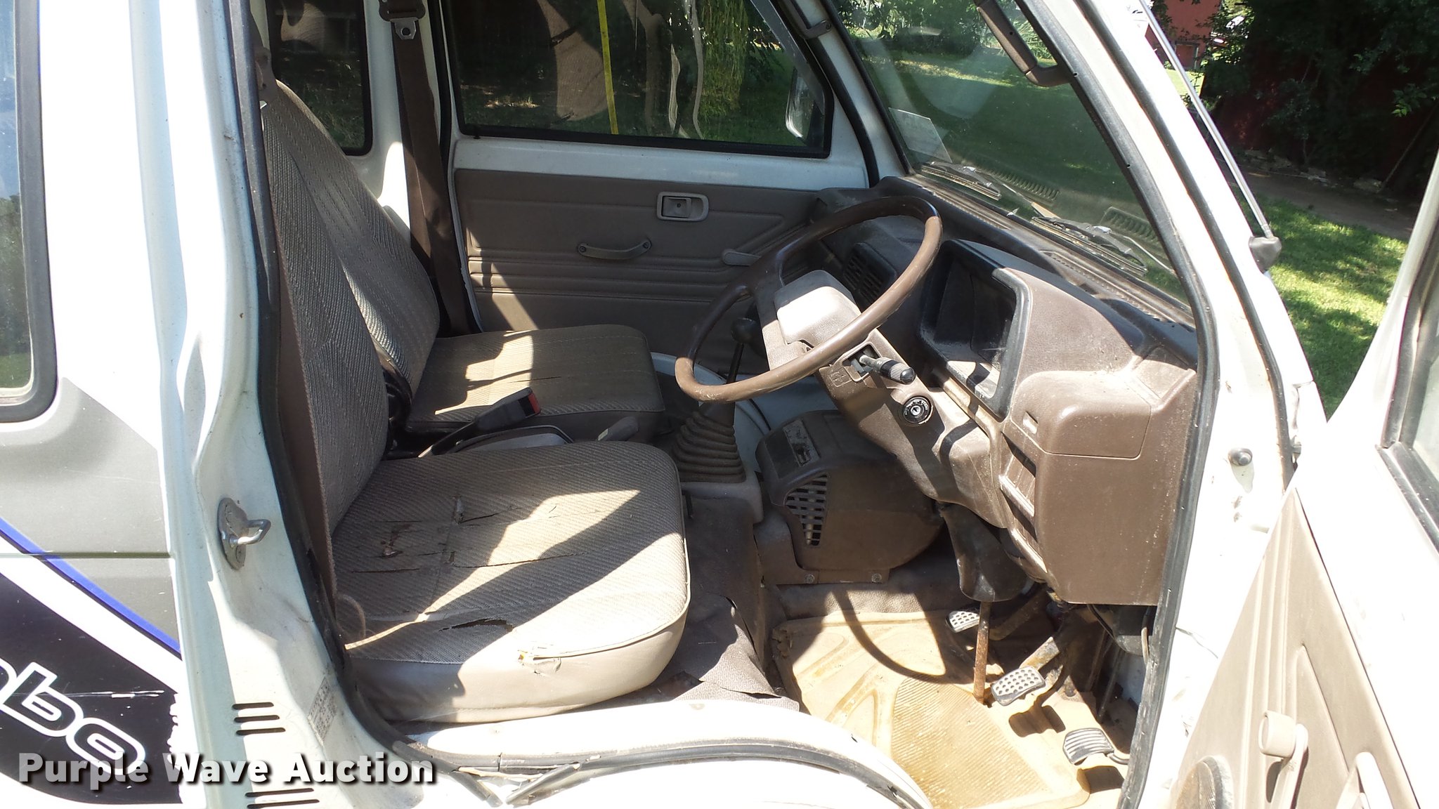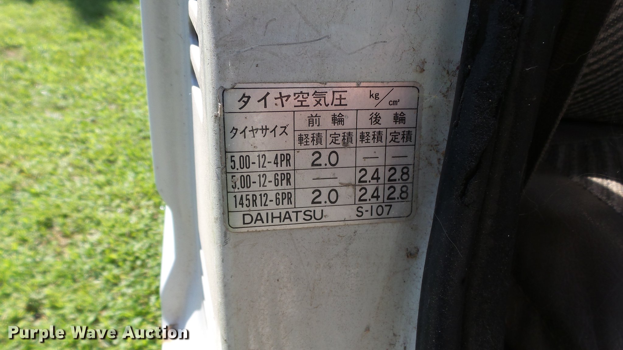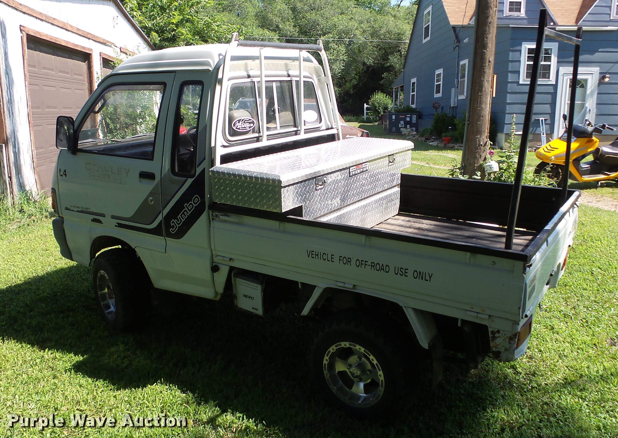 Purple Wave is selling a used Utility Vehicle in Kansas. This item is a 1991 Daihatsu HiJet mini truck with the following: 72,563 miles on odometer, Gas engine, Five speed manual transmission, Four wheel drive, Heat, AM/FM, Cloth interior, 66" x 54" bed, Toolbox, 23x8.00-12 tires