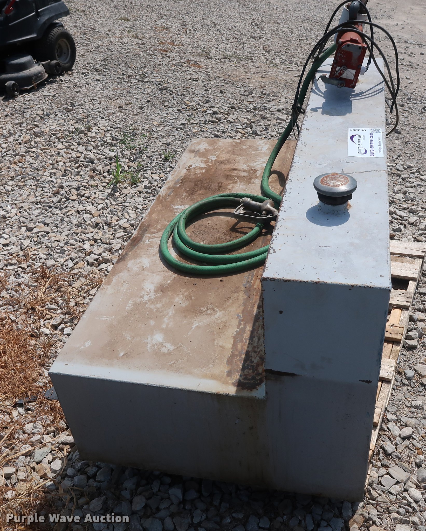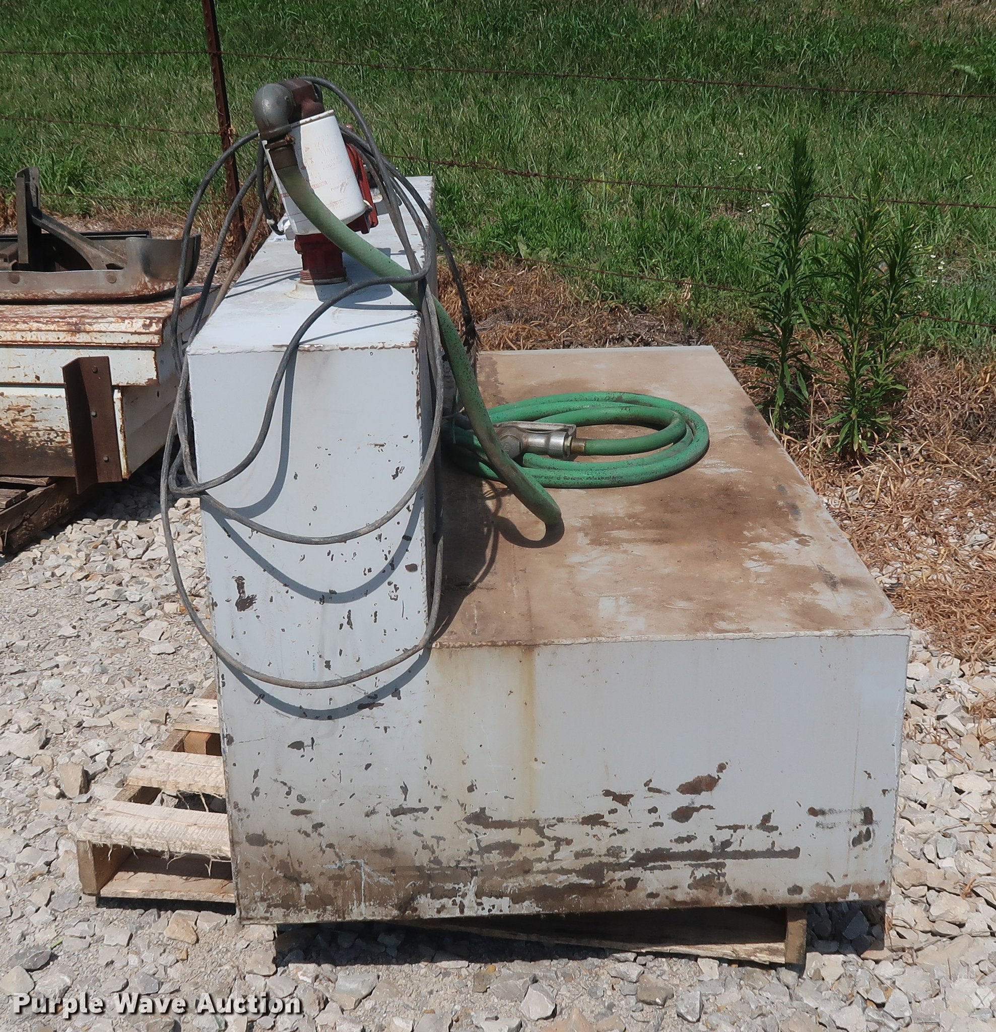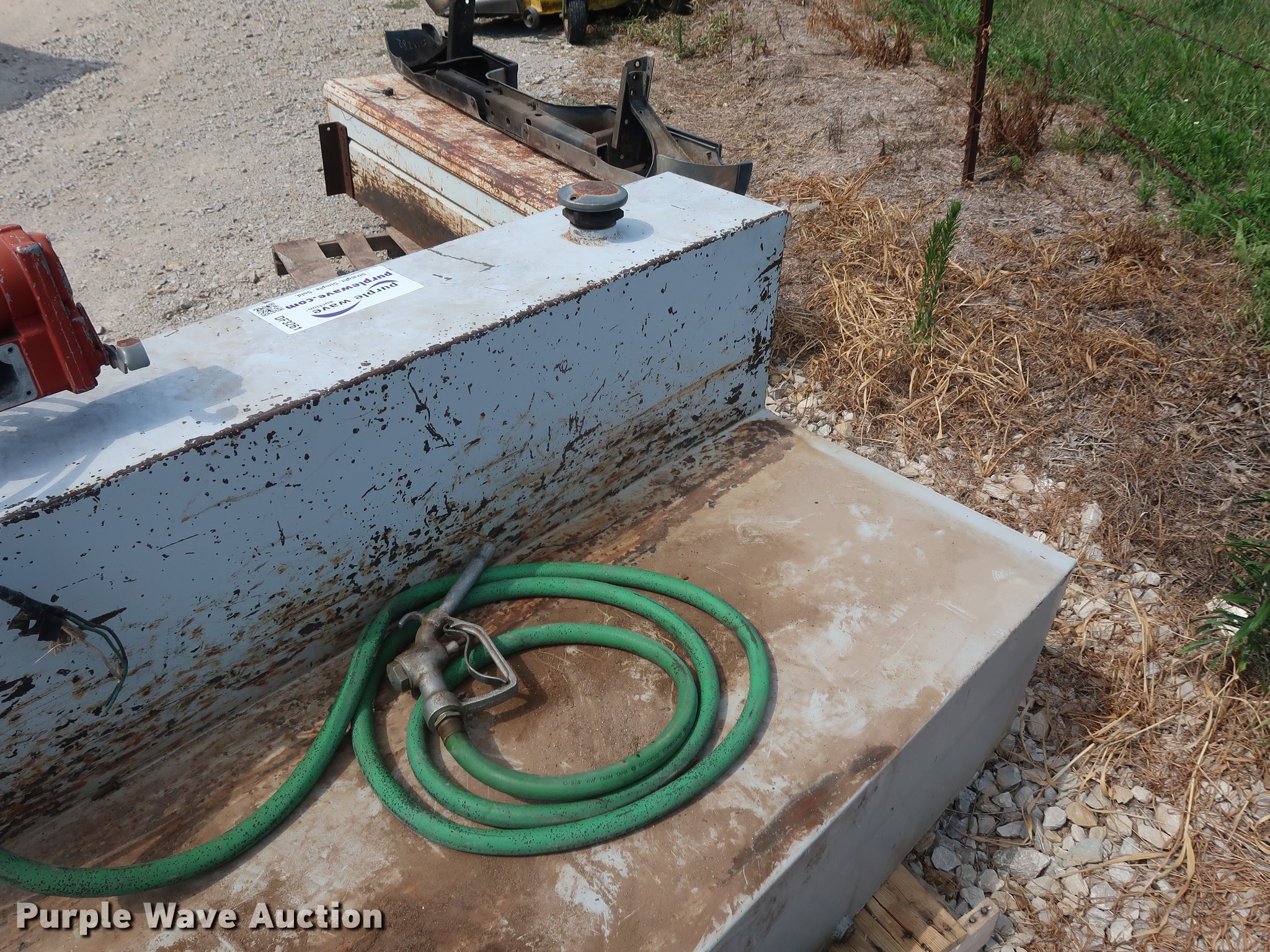 Purple Wave is selling a used Fuel and Lube in Missouri. This item is a L-shaped fuel tank with the following: 160 gallon capacity, 12V pump, Fuel hose