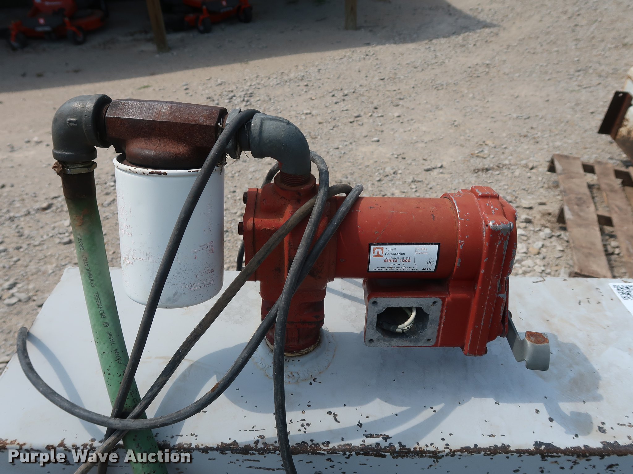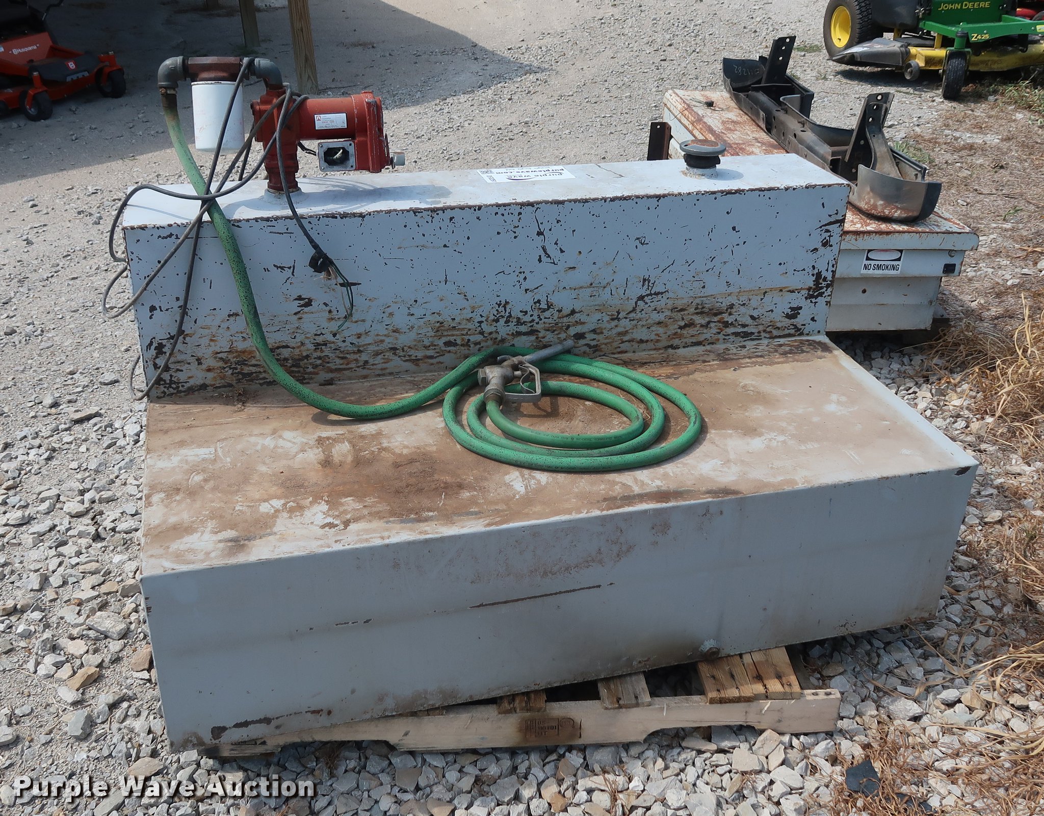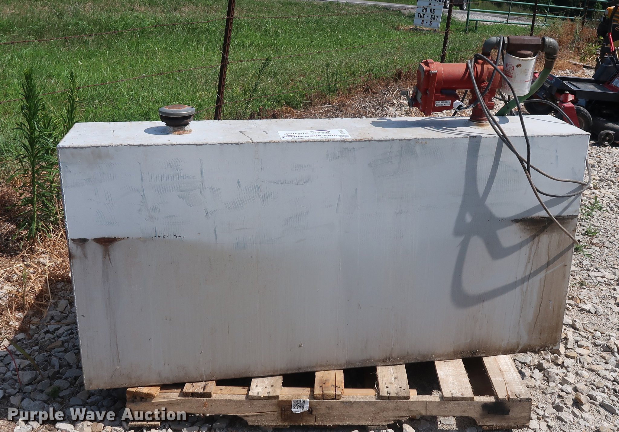 Purple Wave is selling a used Fuel and Lube in Missouri. This item is a L-shaped fuel tank with the following: 160 gallon capacity, 12V pump, Fuel hose