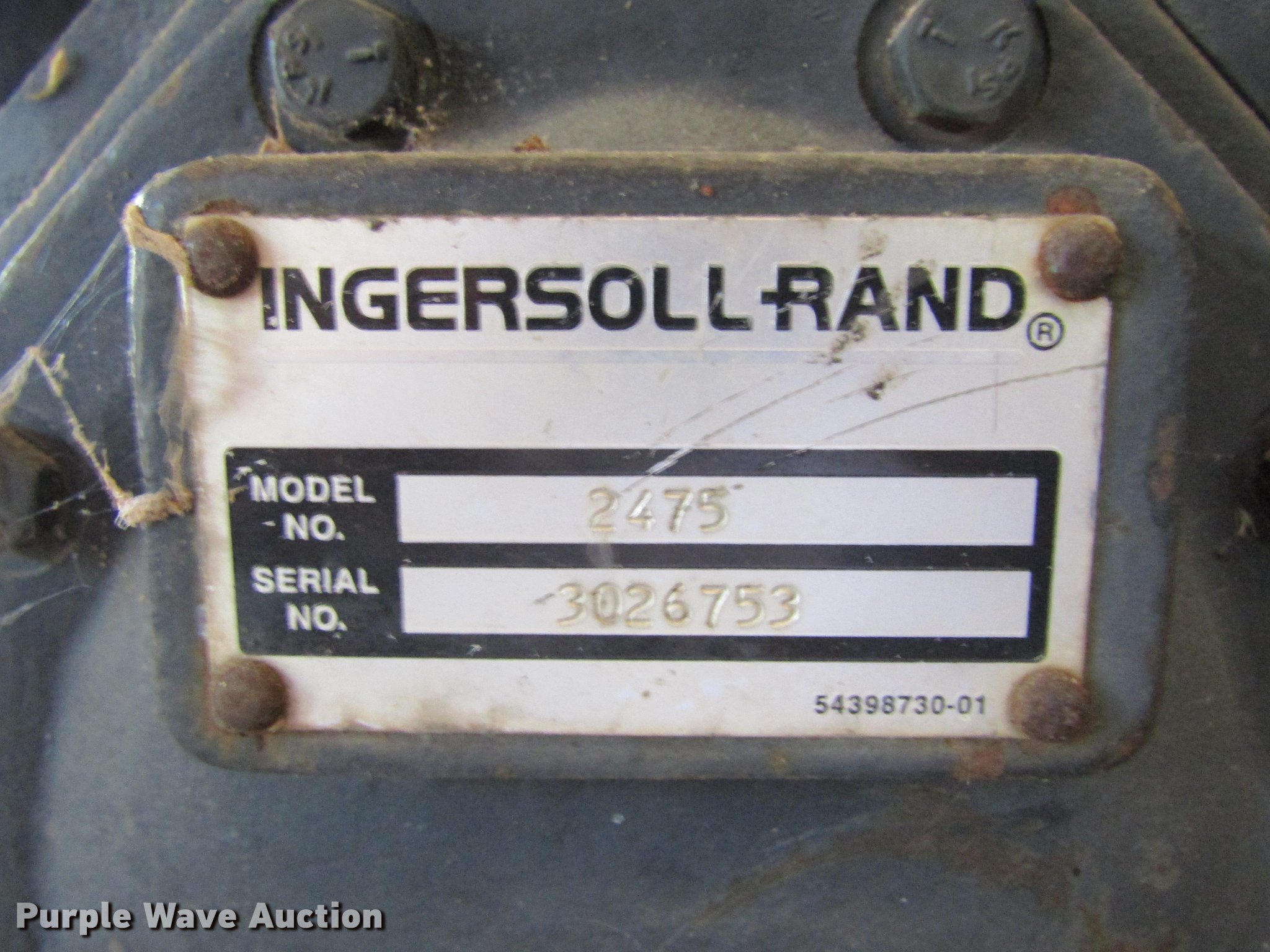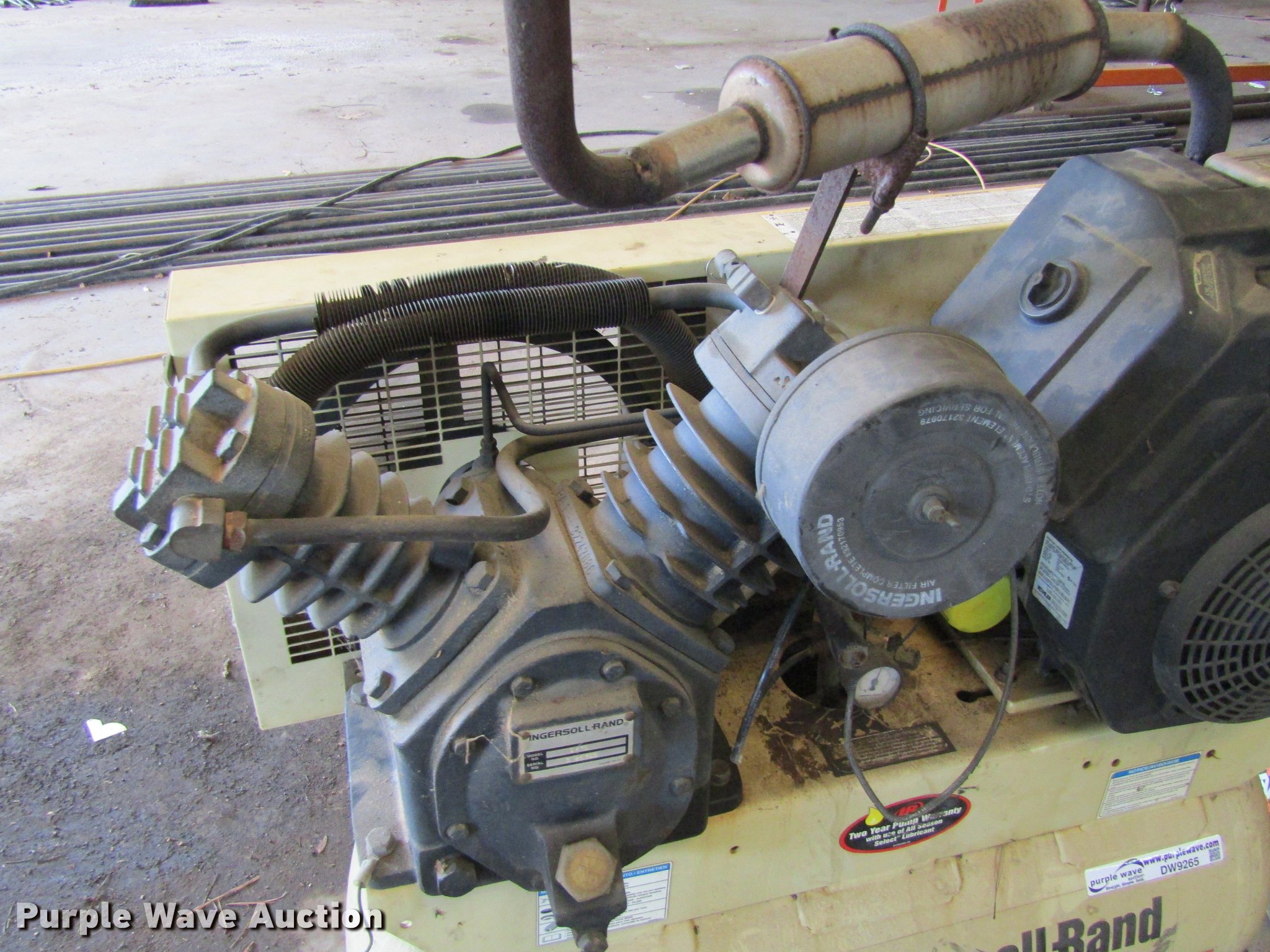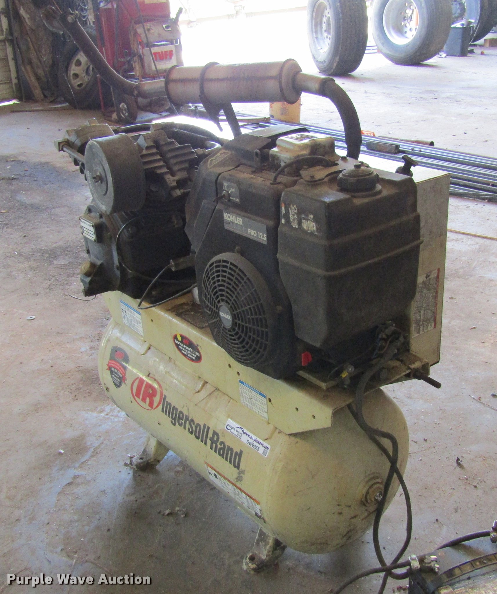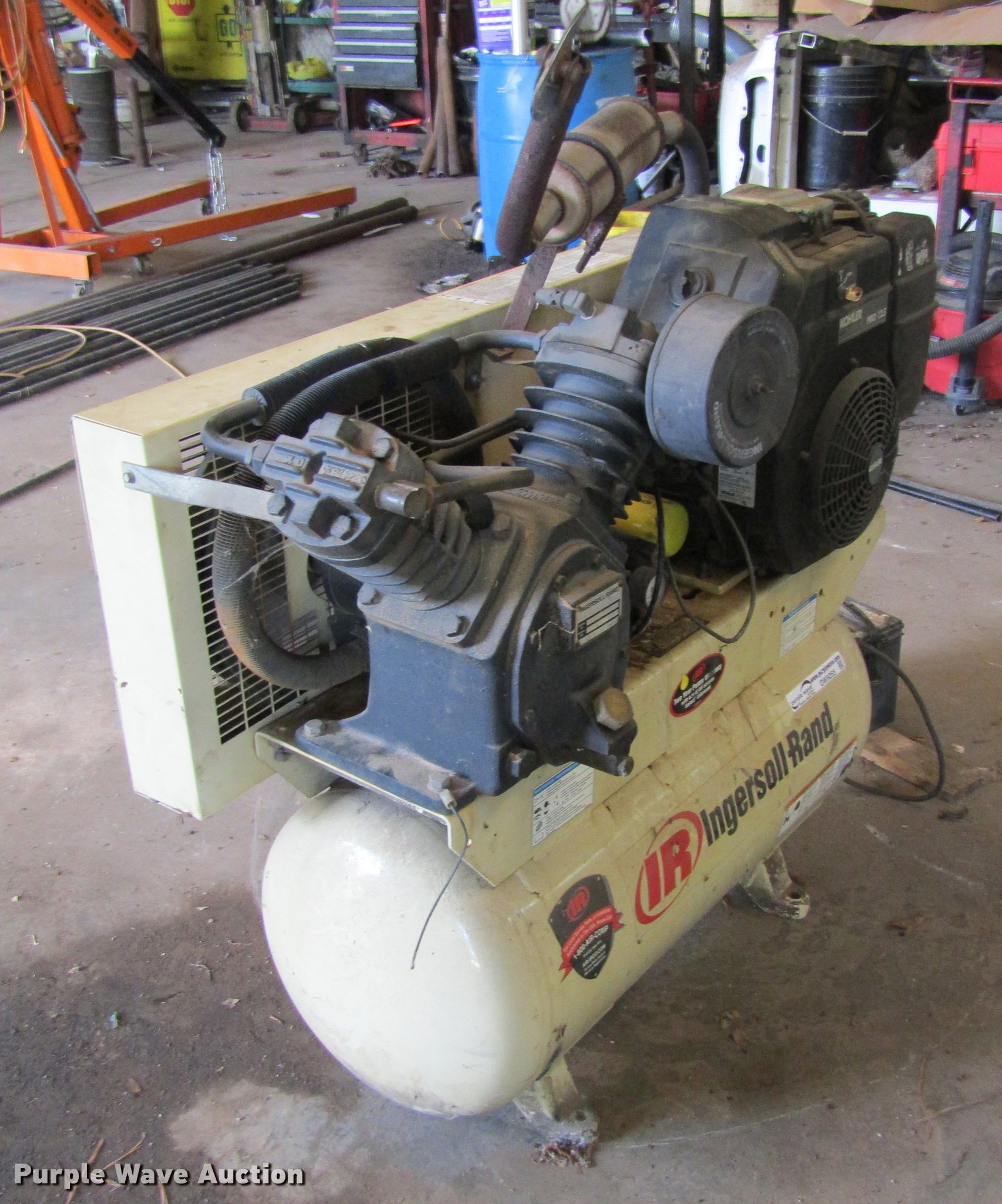 Purple Wave is selling a used Air Compressor in Texas. This item is a Ingersoll Rand 2475 air compressor with the following: Kohler Command Pro 12.5 two cylinder gas engine, 12.5 HP, Ingersoll Rand pump, 24 CFM, 175 psi, 30 gallon tank capacity, Skid mounted, Serial 3026753