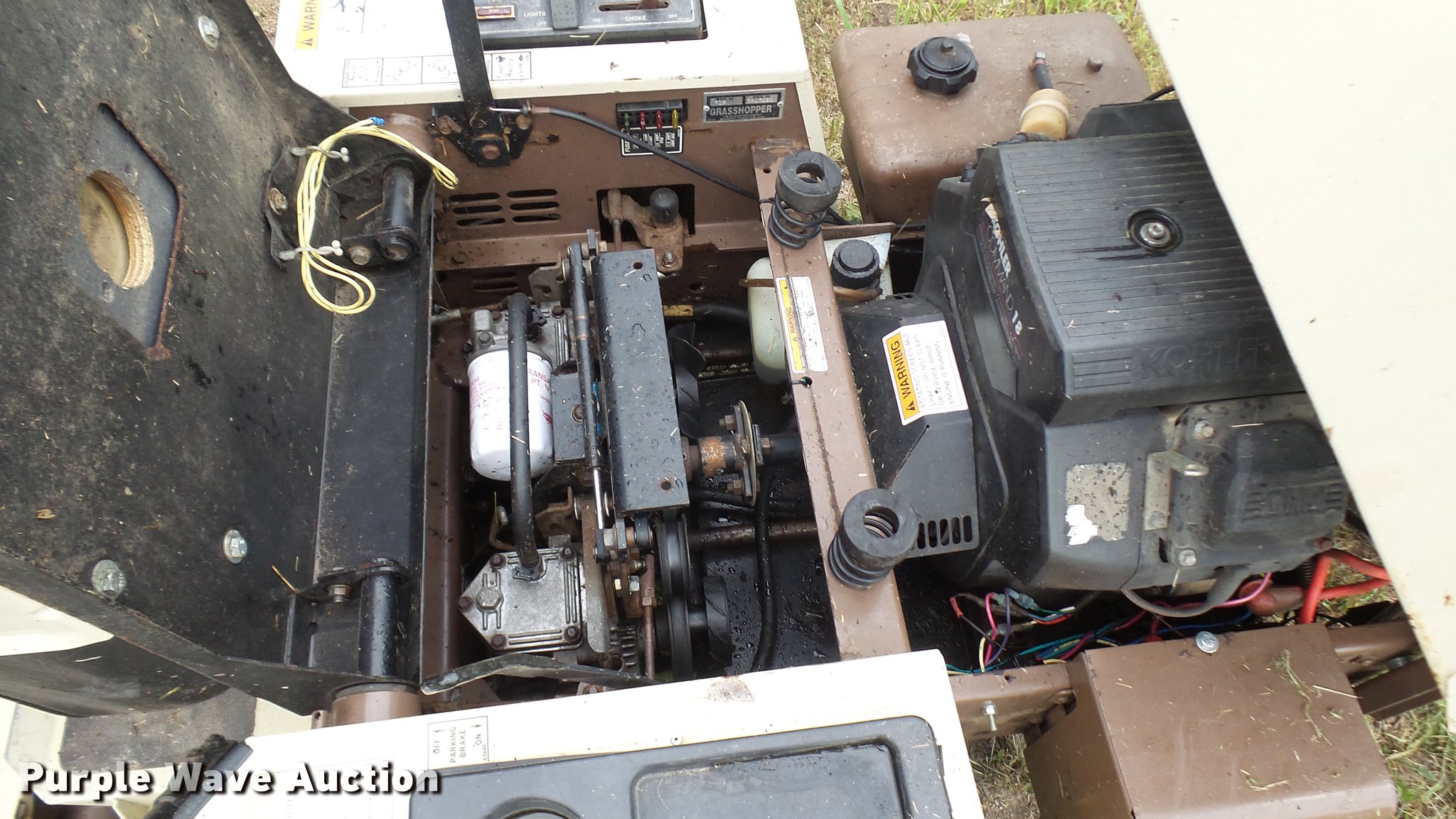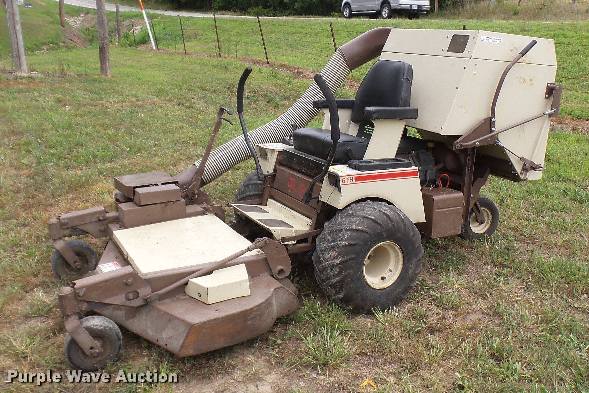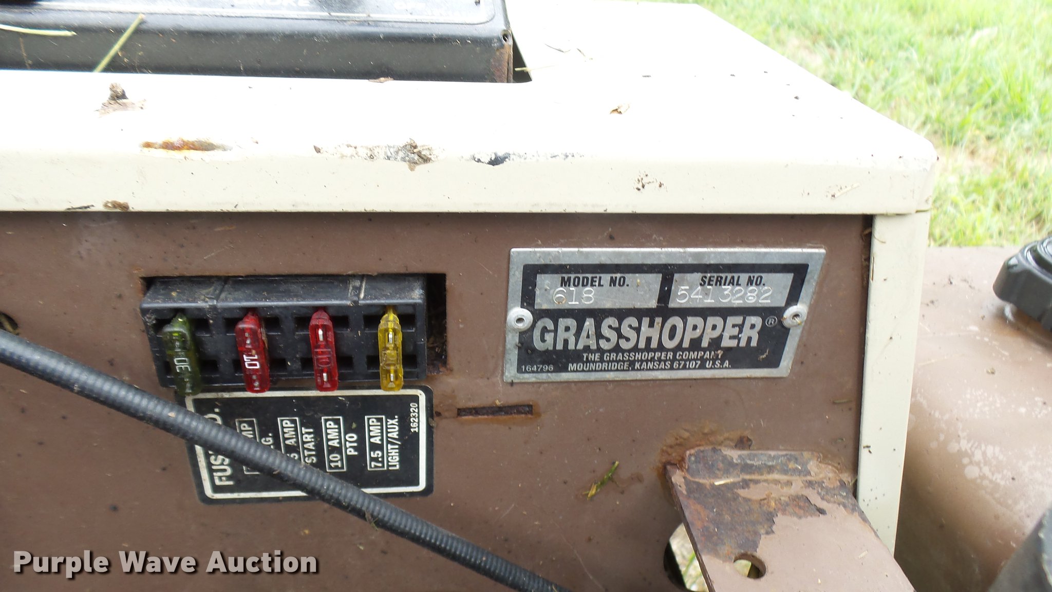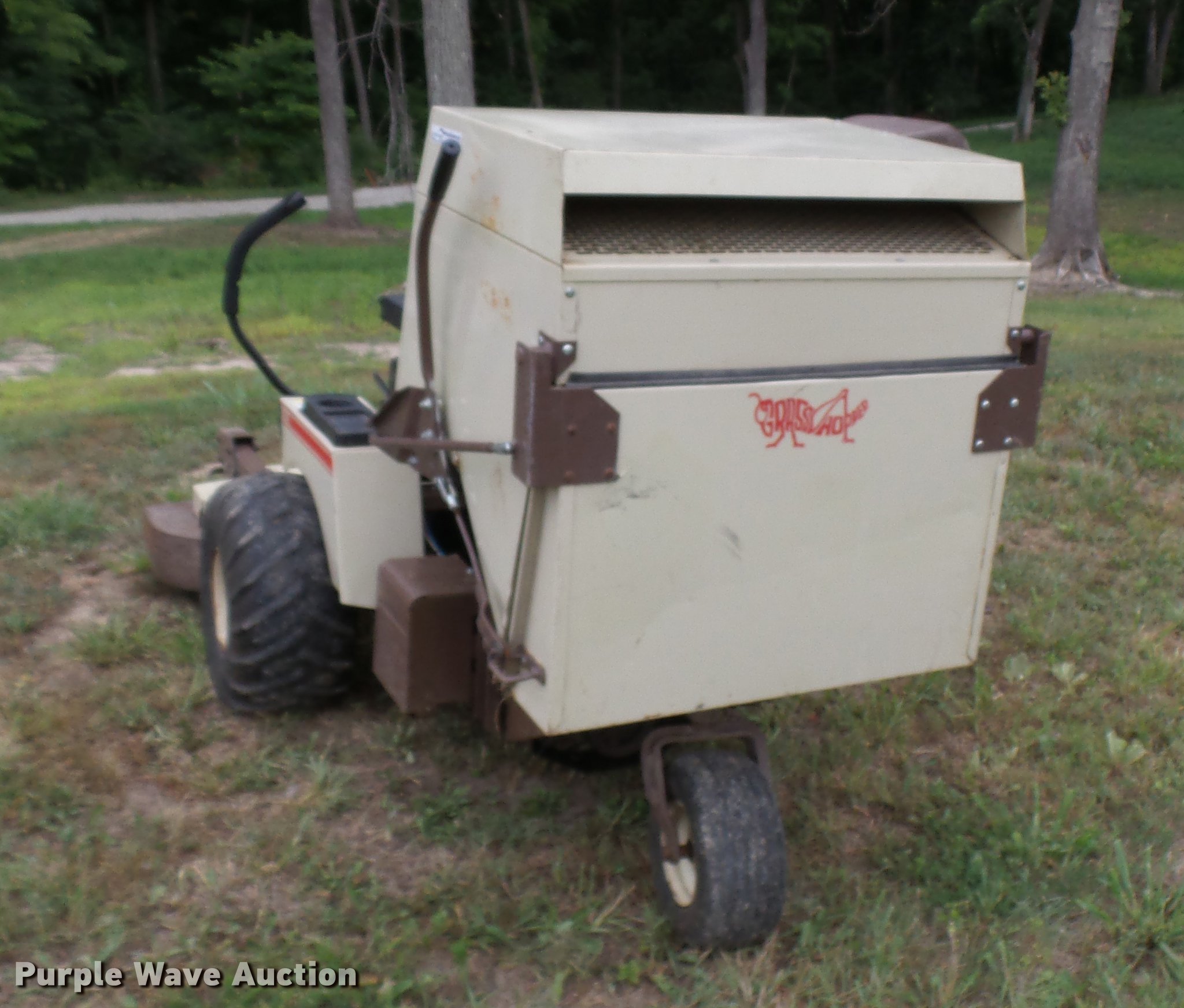 Purple Wave is selling a used Lawn Mower in Missouri. This item is a Grasshopper 618 ZTR lawn mower with the following: 417 hours on meter, 52" cut, Kohler 18 HP gas engine, Manual deck lift, Six position deck height, EZ-dump bagging system, Belt driven collection bagging system, 21-11-8 front tires, 13-6.5-6 rear tires, Serial 5413282