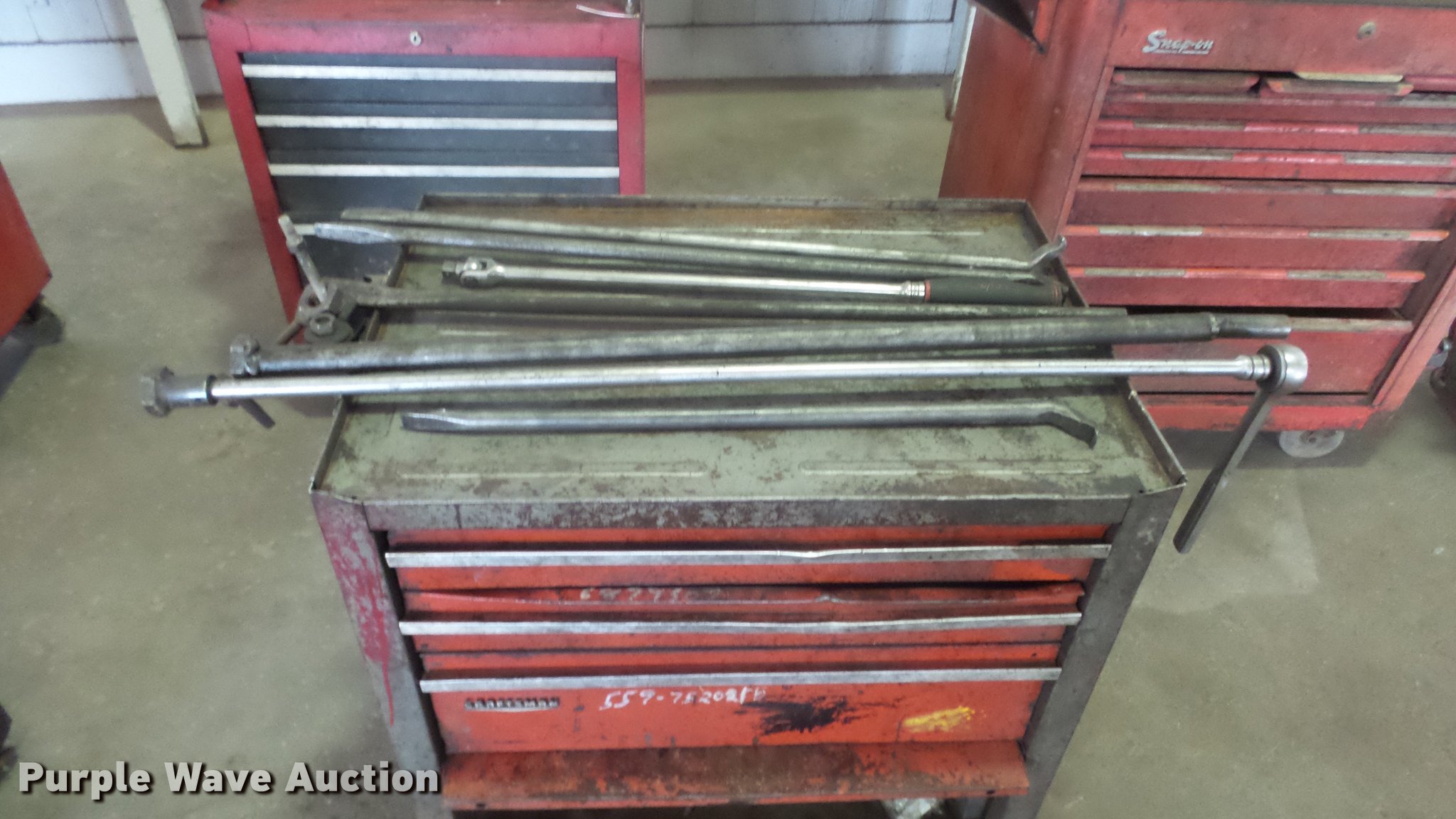 Purple Wave is selling a used Tools in Kansas. This item is a (5) toolboxes with the following: (2) Snap-On, (3) Craftsman, Assorted tools, Creeper
