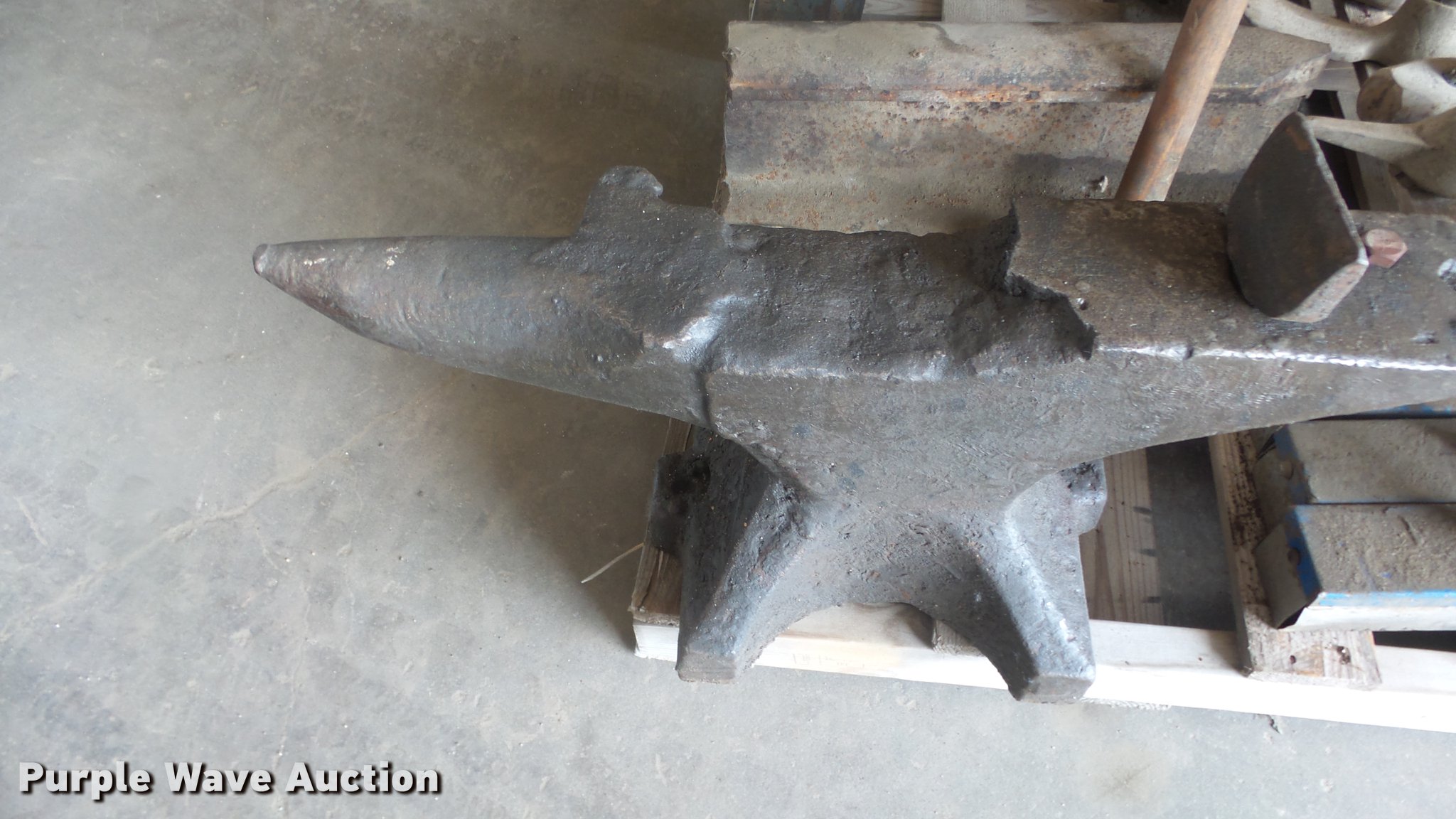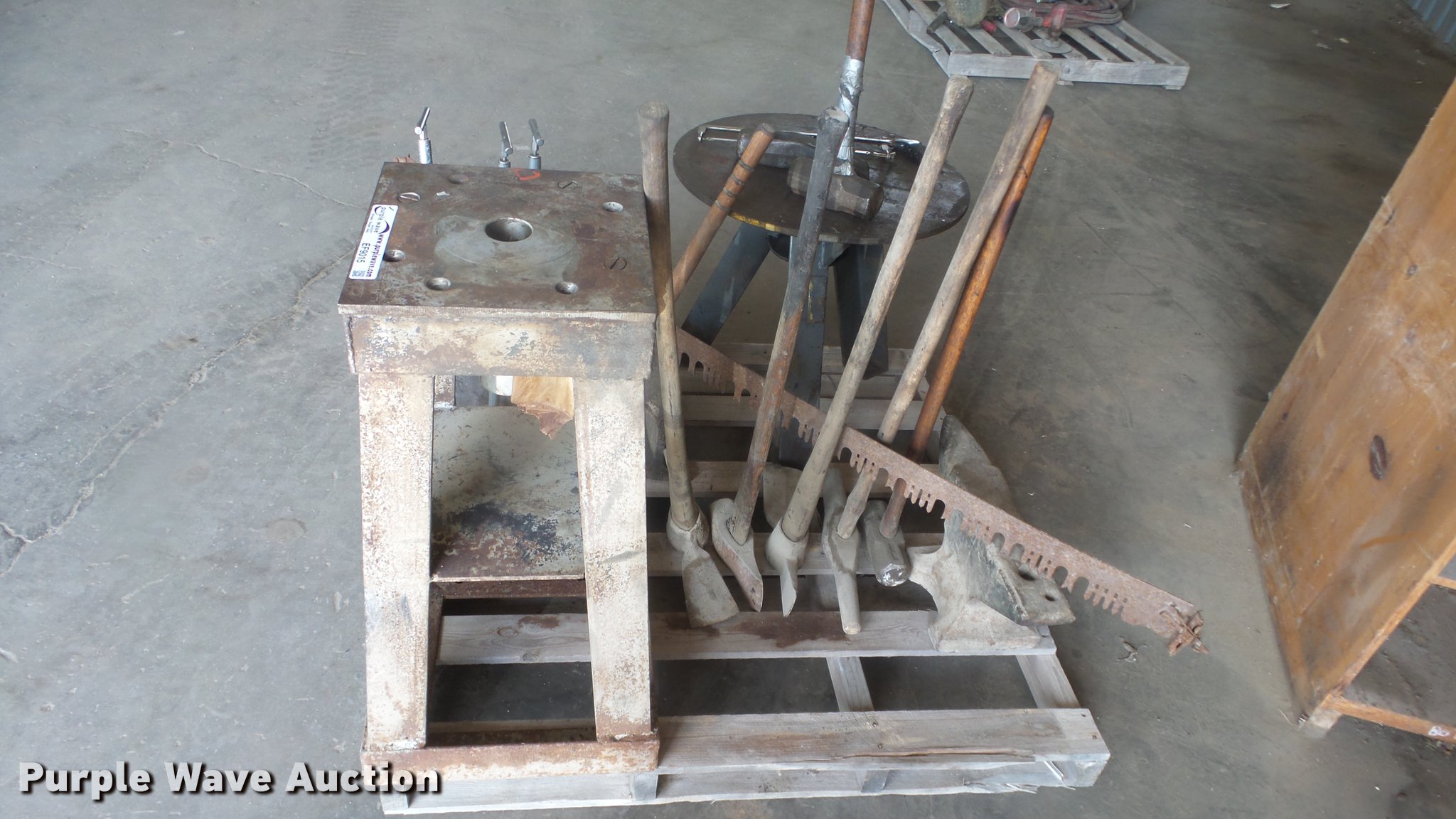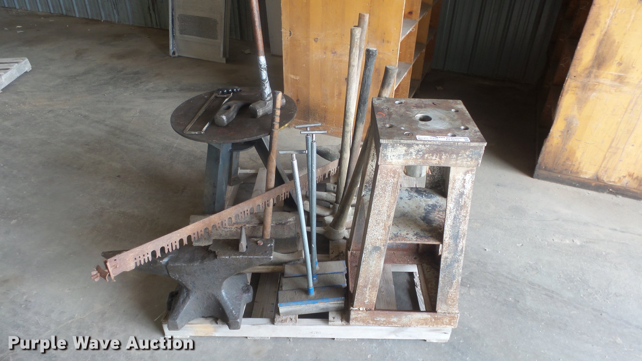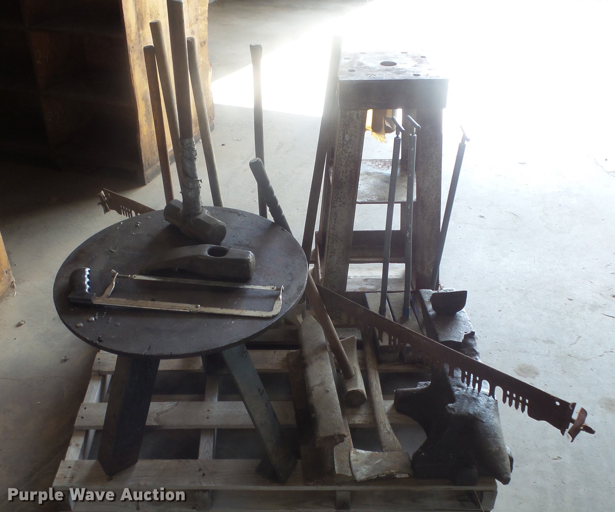 Purple Wave is selling a used Tools in Kansas. This item is a Tools with the following: (2) anvils, Saws, Sledge hammers, Benches and more