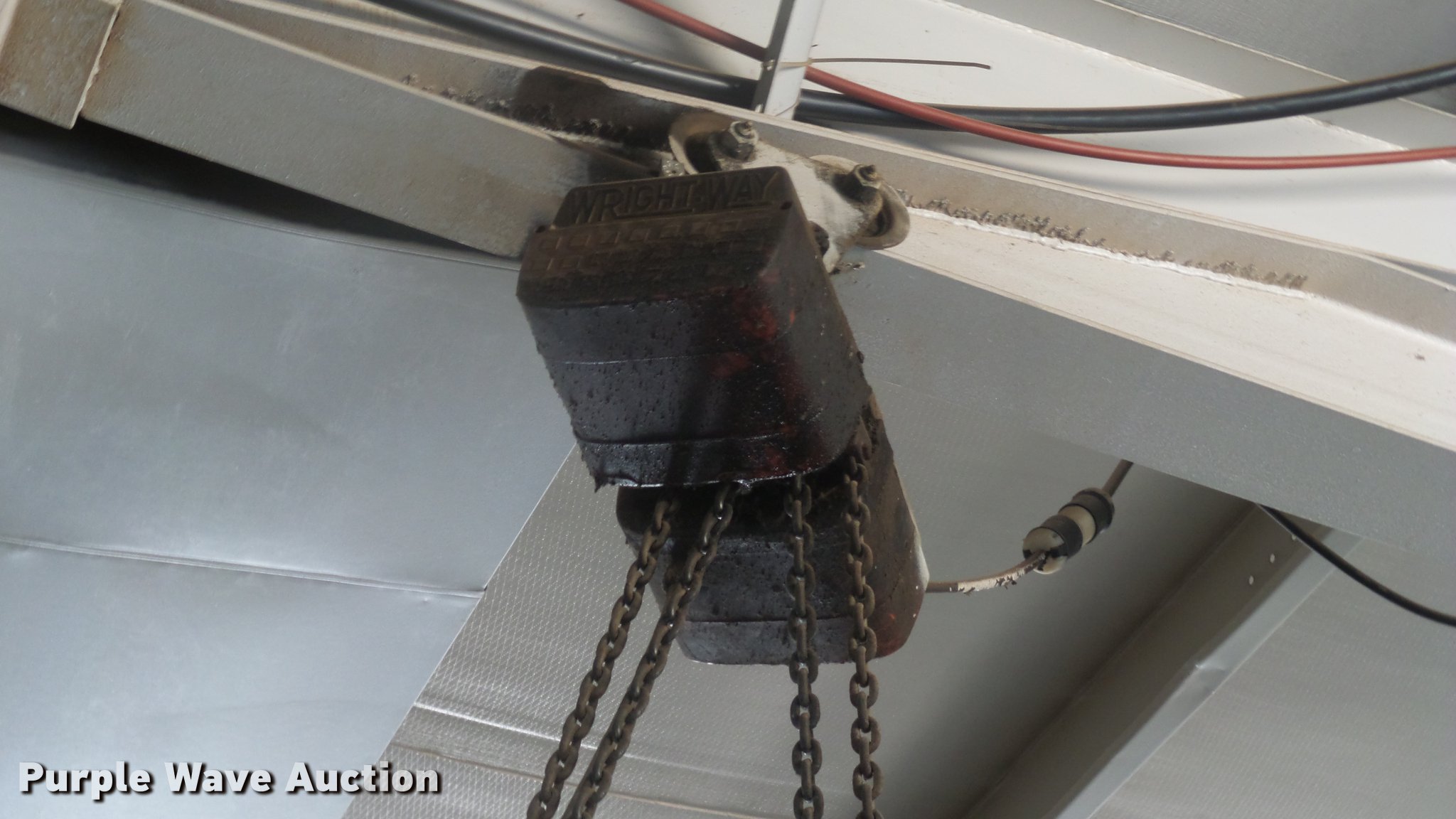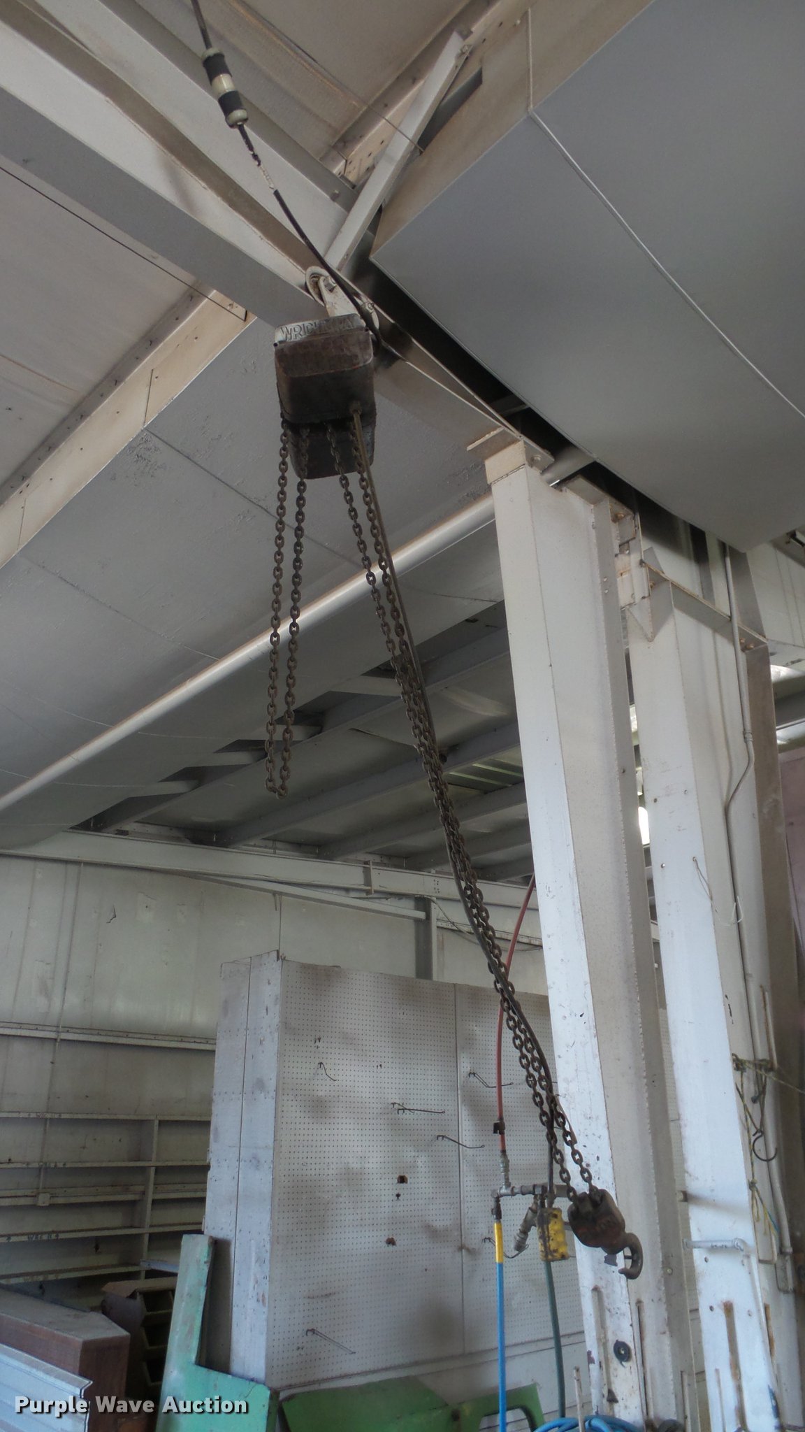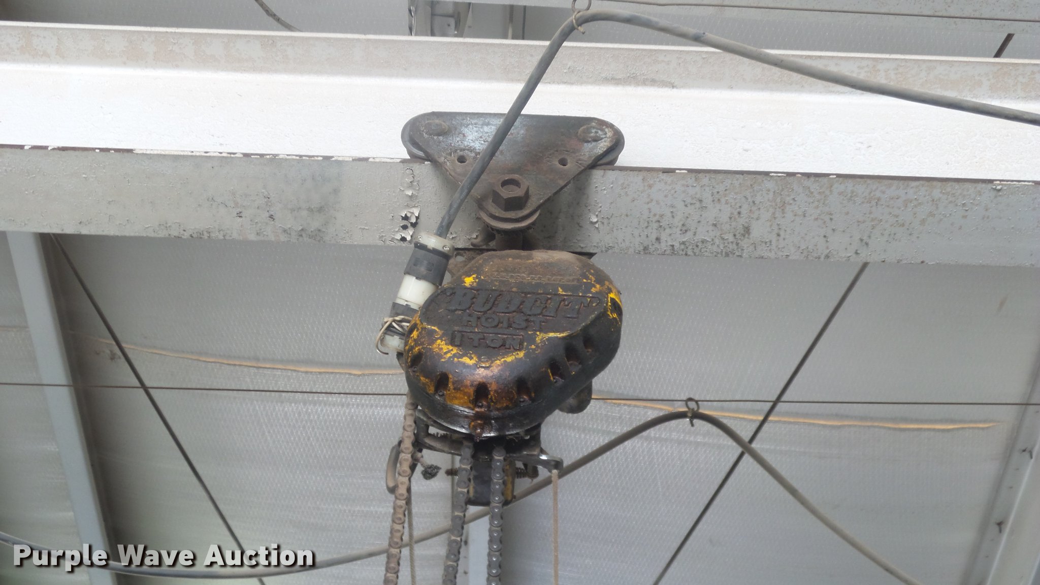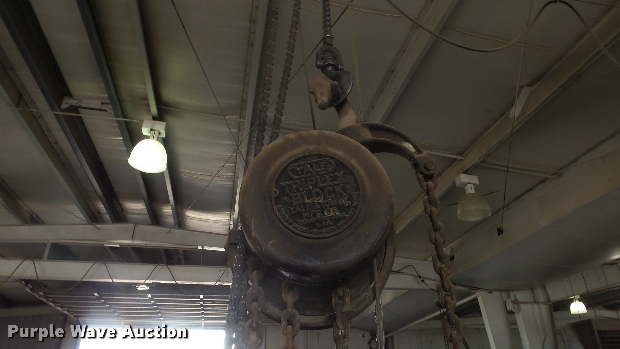 Purple Wave is selling a used Lifting and Rigging in Kansas. This item is a (4) chain hoists with trolleys with the following: Yale triplex block, (2) Budgit, Wright-Way, Hooks, Pendant controls, Trolleys