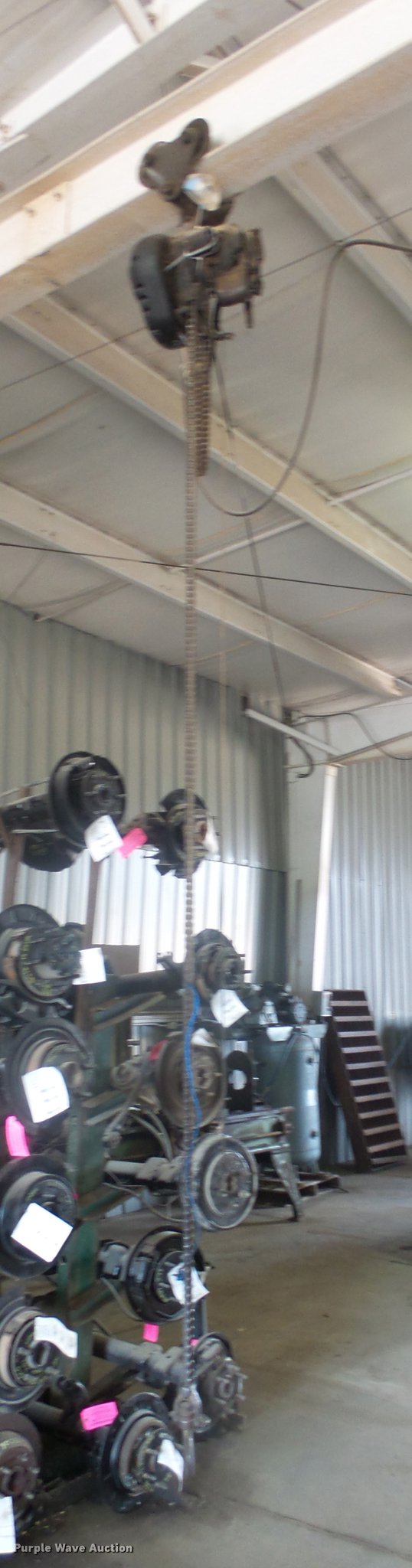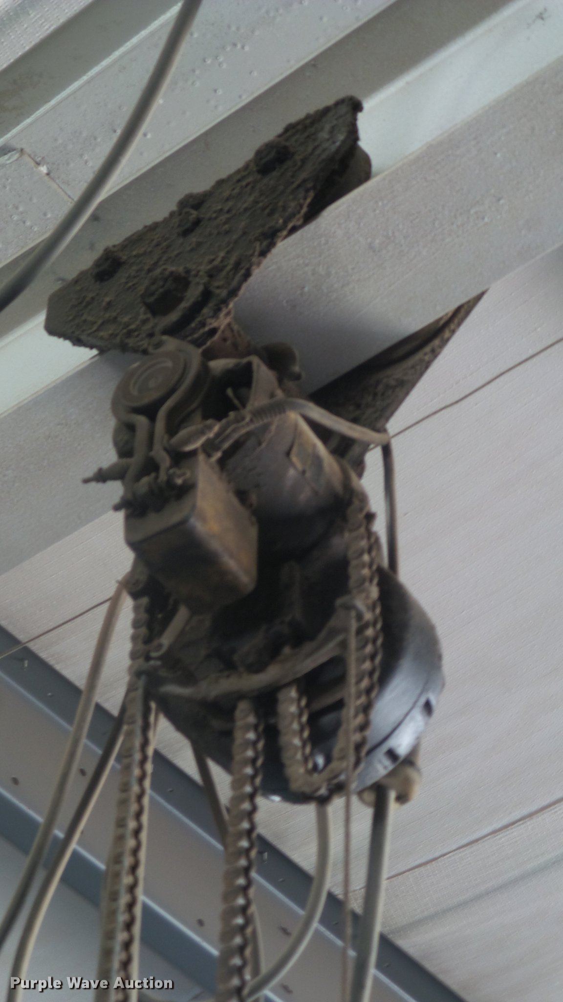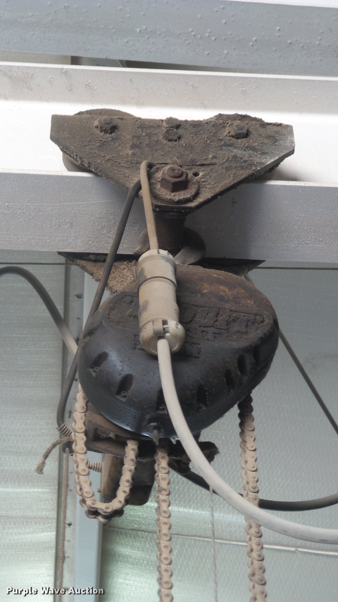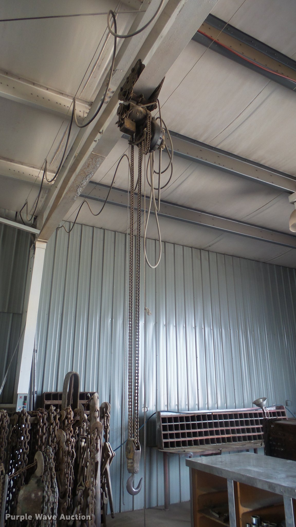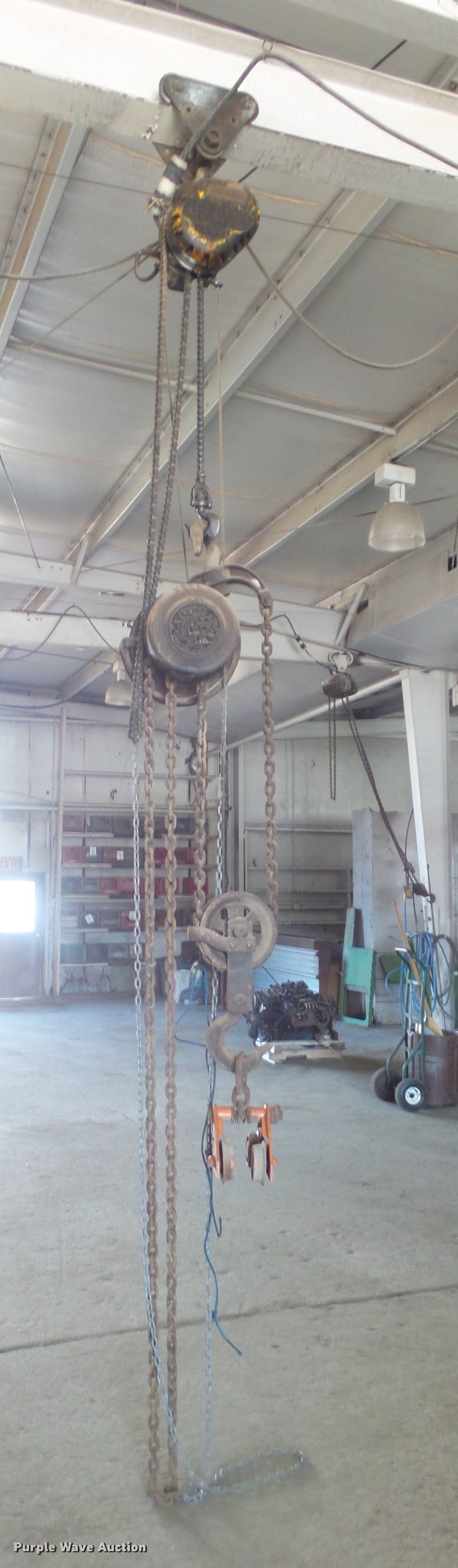 Purple Wave is selling a used Lifting and Rigging in Kansas. This item is a (4) chain hoists with trolleys with the following: Yale triplex block, (2) Budgit, Wright-Way, Hooks, Pendant controls, Trolleys