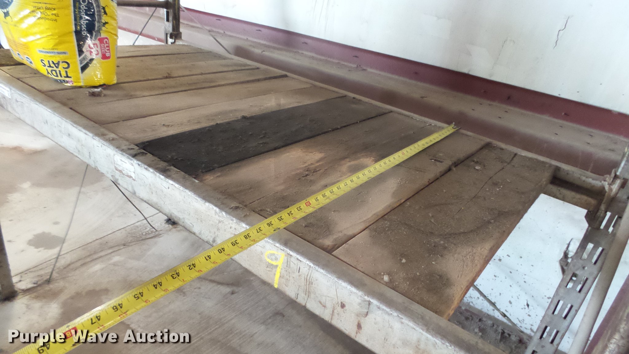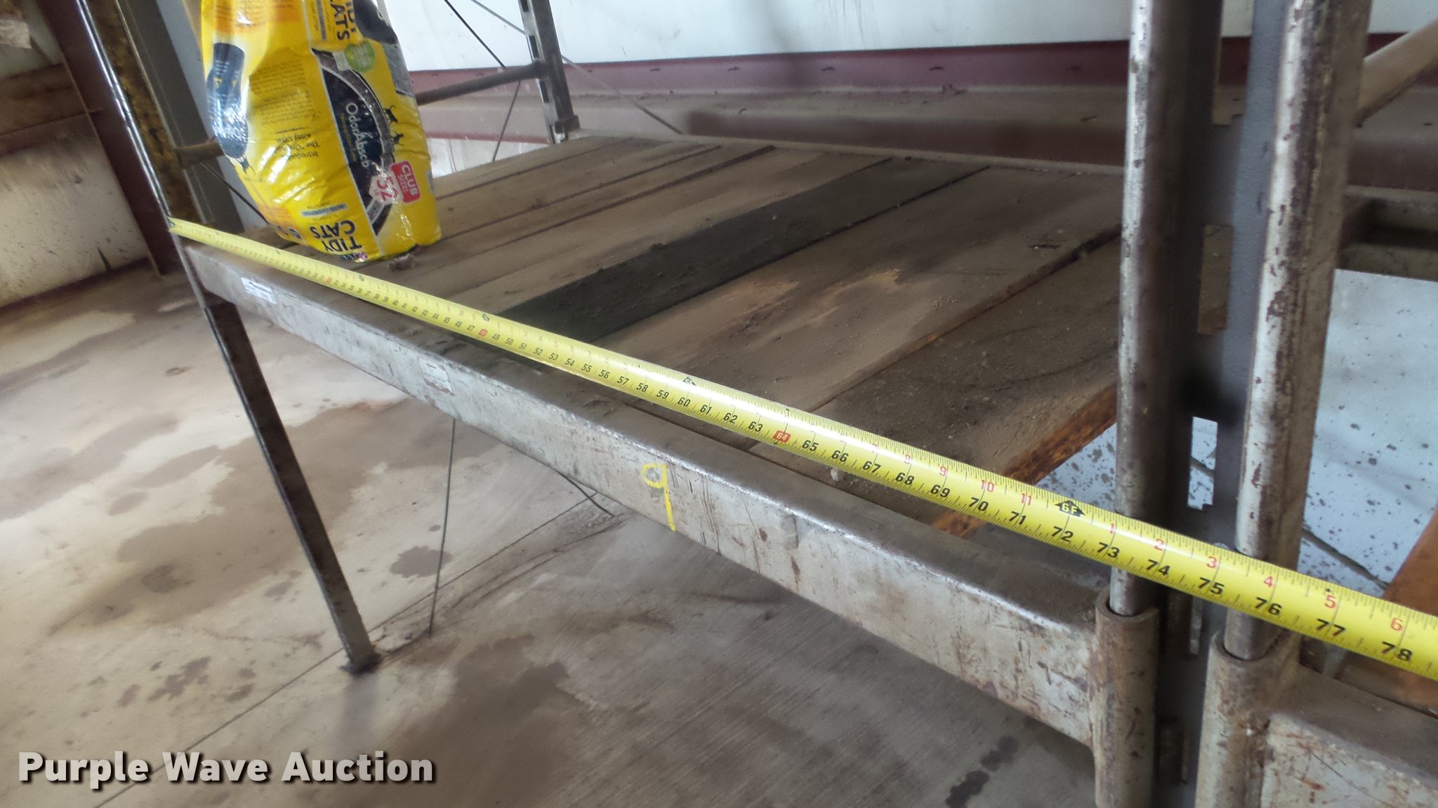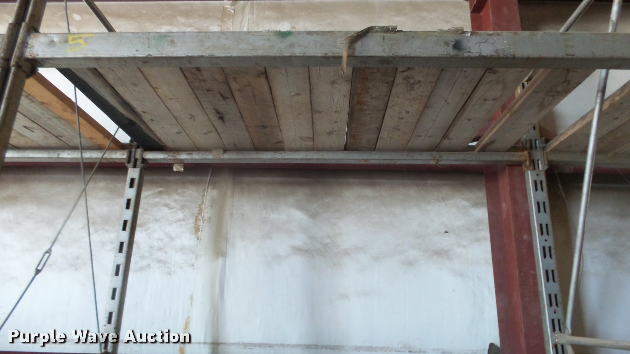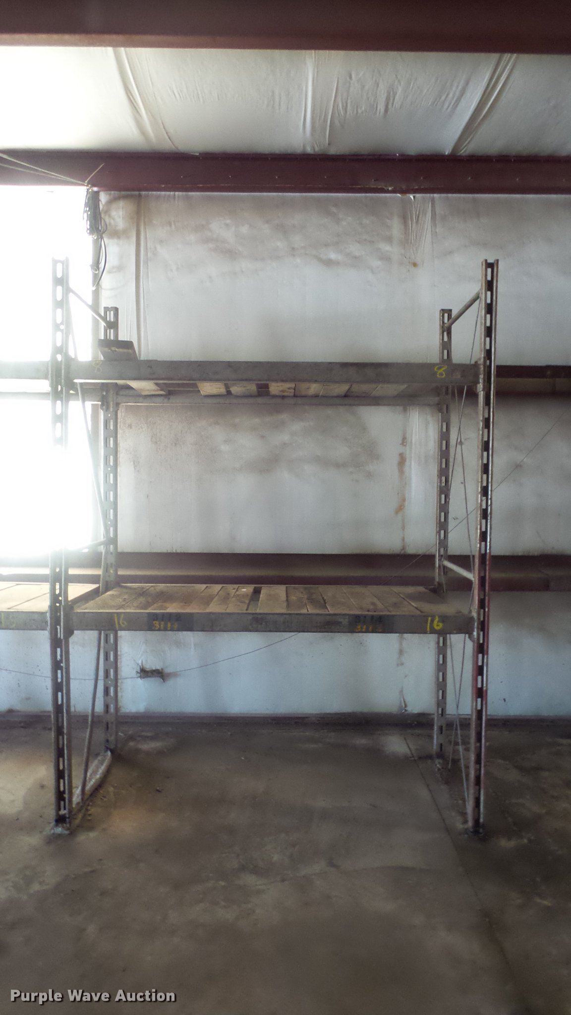 Purple Wave is selling a used Shelving and Storage in Kansas. This item is a Steel shelving with the following: Approx. 50'L overall, (8) 6' sections, 36"D, Approx. 8.5'H, Steel uprights and cross-members, Wood shelves, Uprights cut-off at floor