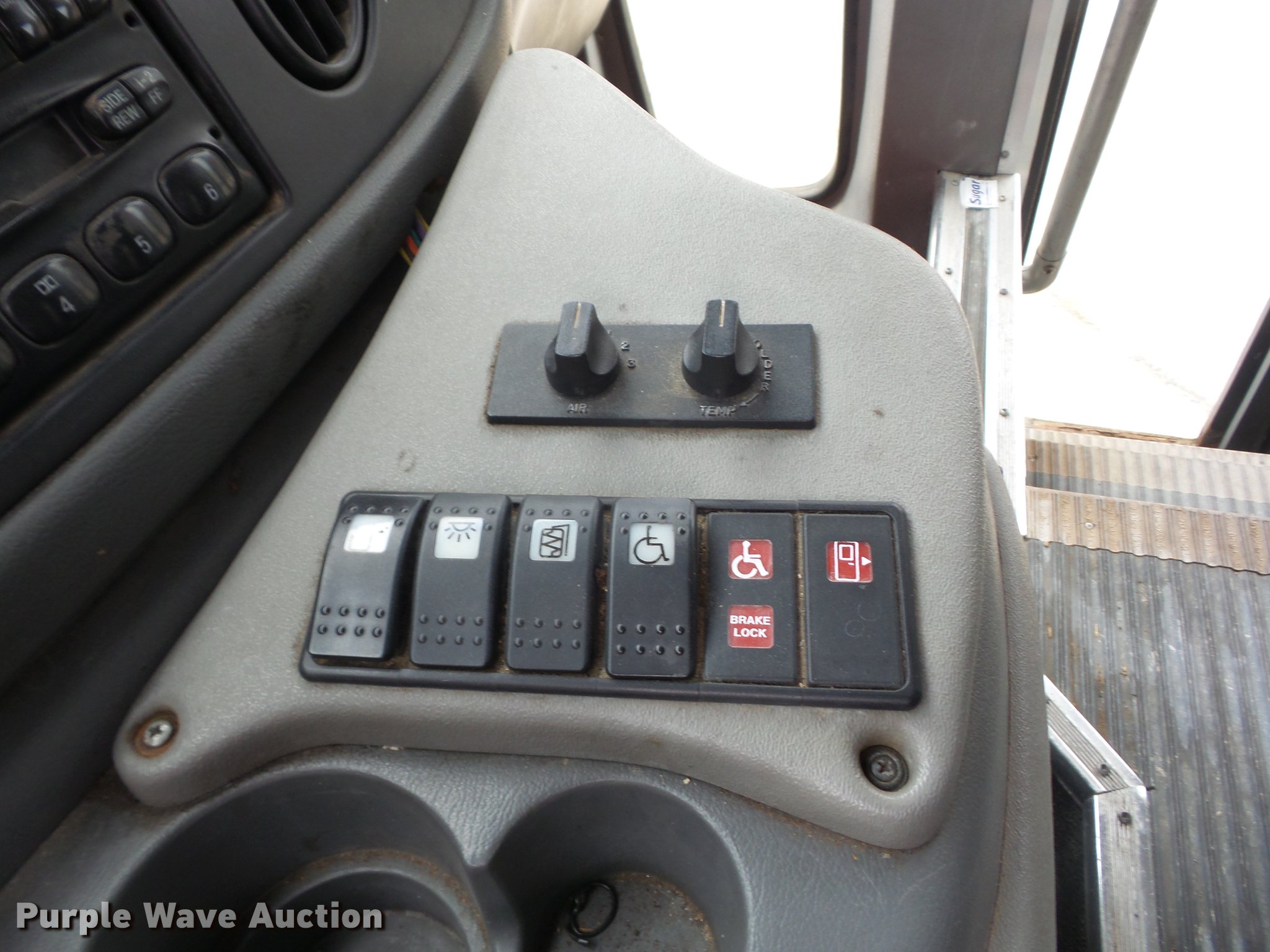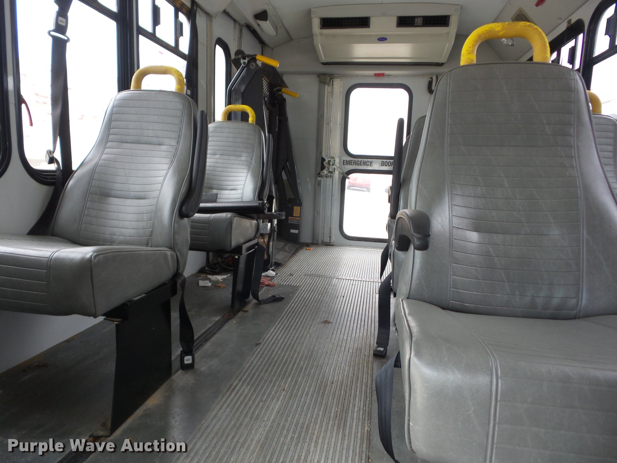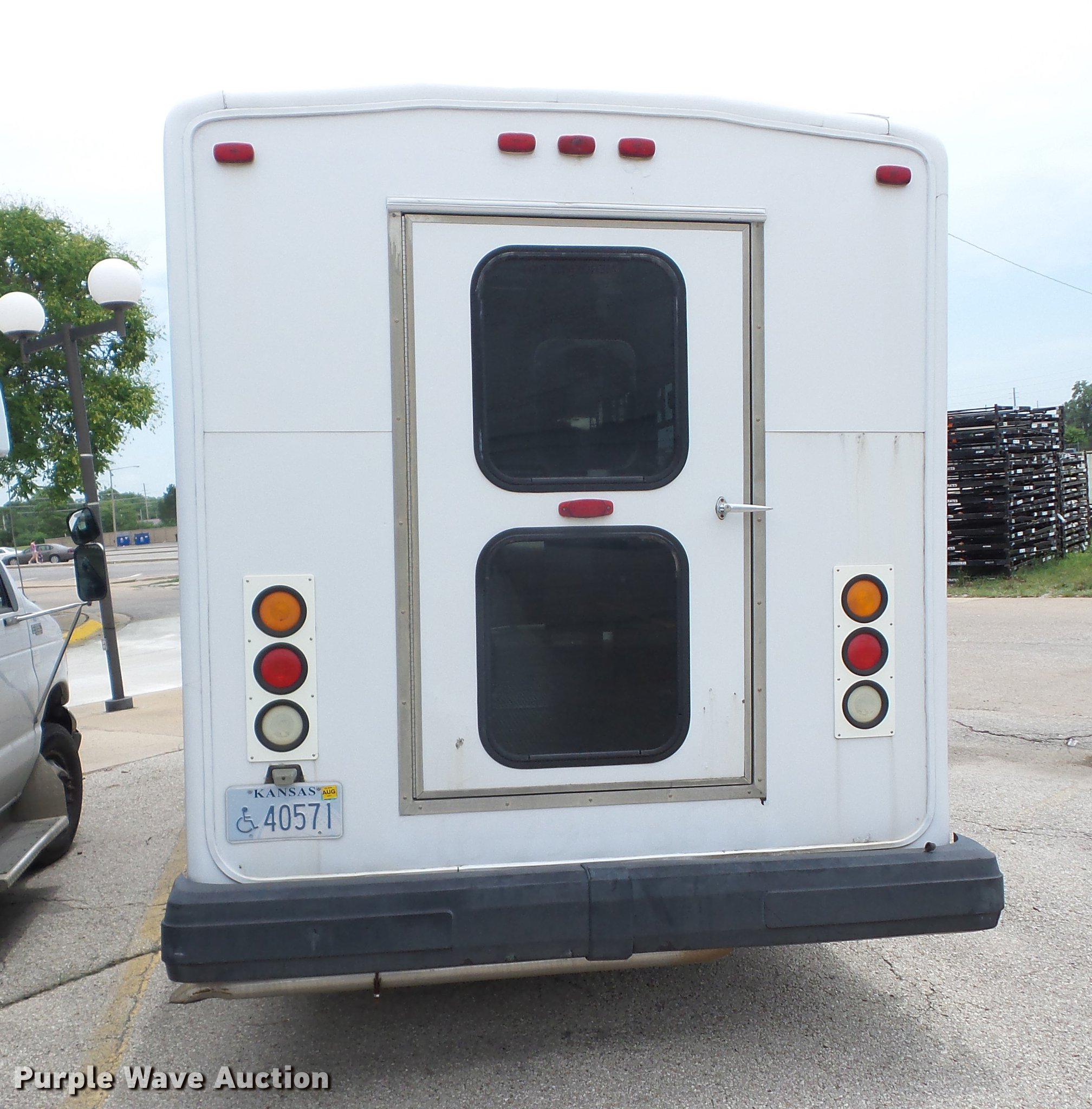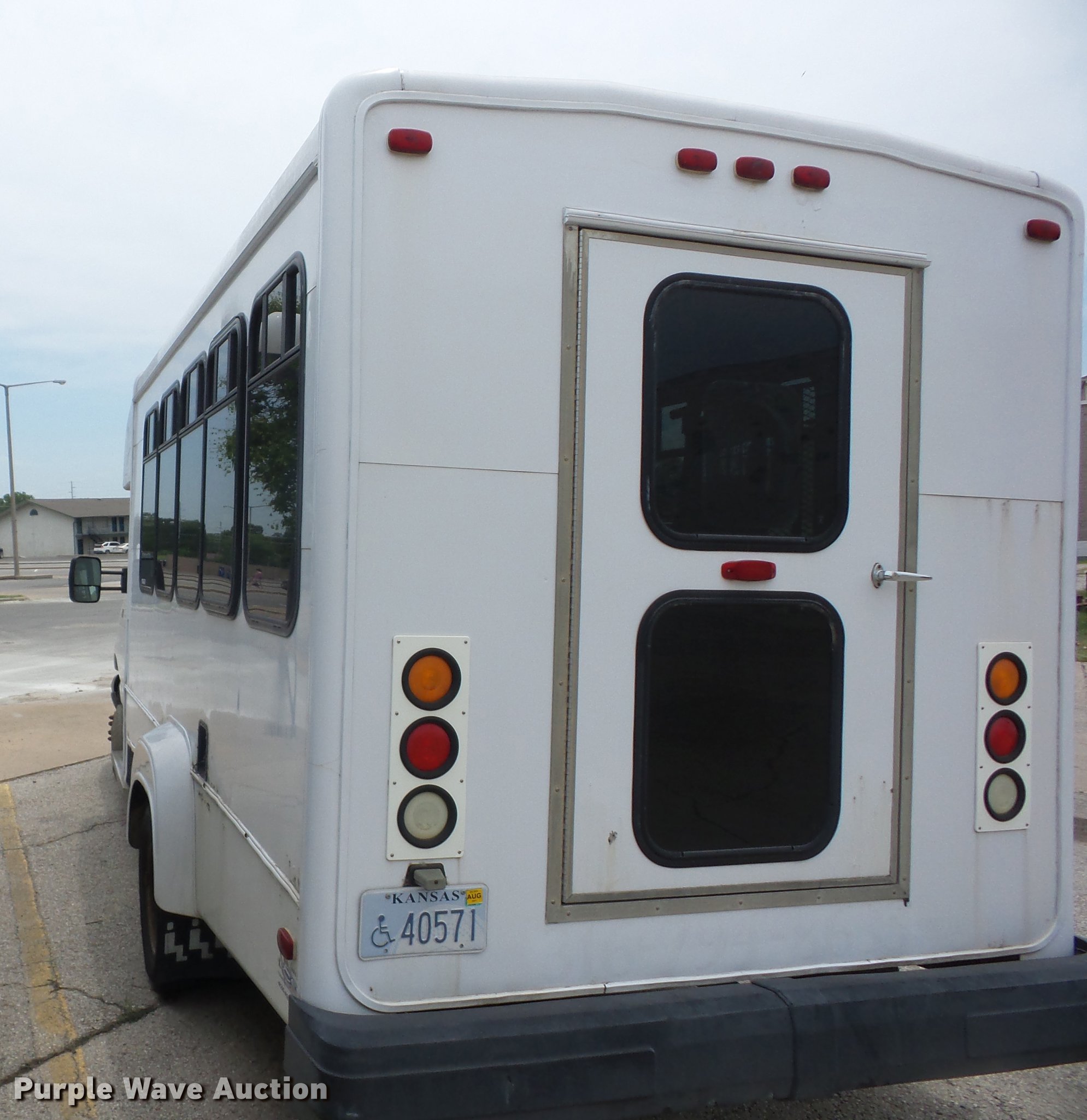 Purple Wave is selling a used Bus in Kansas. This item is a 2004 Ford E350 Super Duty shuttle bus with the following: 226,159 miles on odometer, 5.4L V8 SOHC 16V gas engine, Automatic transmission, Single axle, AC and heat, Rear AC, AM/FM, Electric passenger sliding door, Nine passenger capacity, Wheelchair lift, Ceiling, front, rear, and side emergency exits, Spring suspension, Hydraulic brakes, LT225/75R16 tires, GVWR 10,700 lbs, Unit# 1011