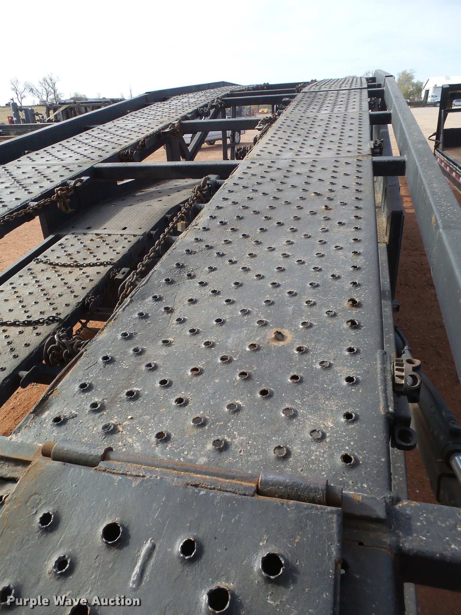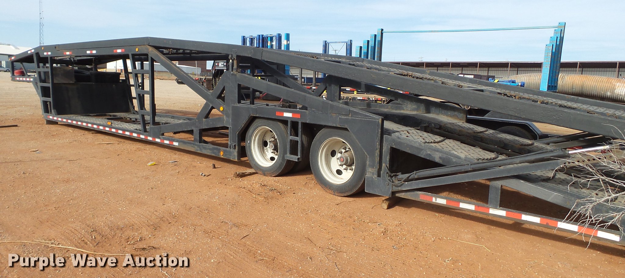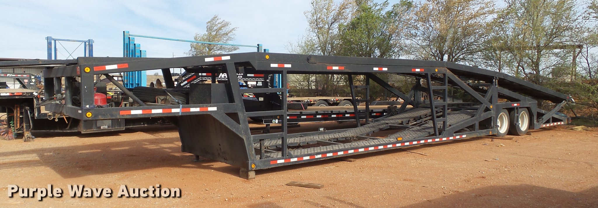 Purple Wave is selling a used Car Carrier in Oklahoma. This item is a 2001 Miller car trailer with the following: 53'L x 102"W, (7) car capacity, Hydraulic operated upper deck, On-board electric over hydraulic system, Fifth wheel plate, Air suspension, Air brakes, Tandem axle, Aluminum wheels, 255/70R22.5 tires
