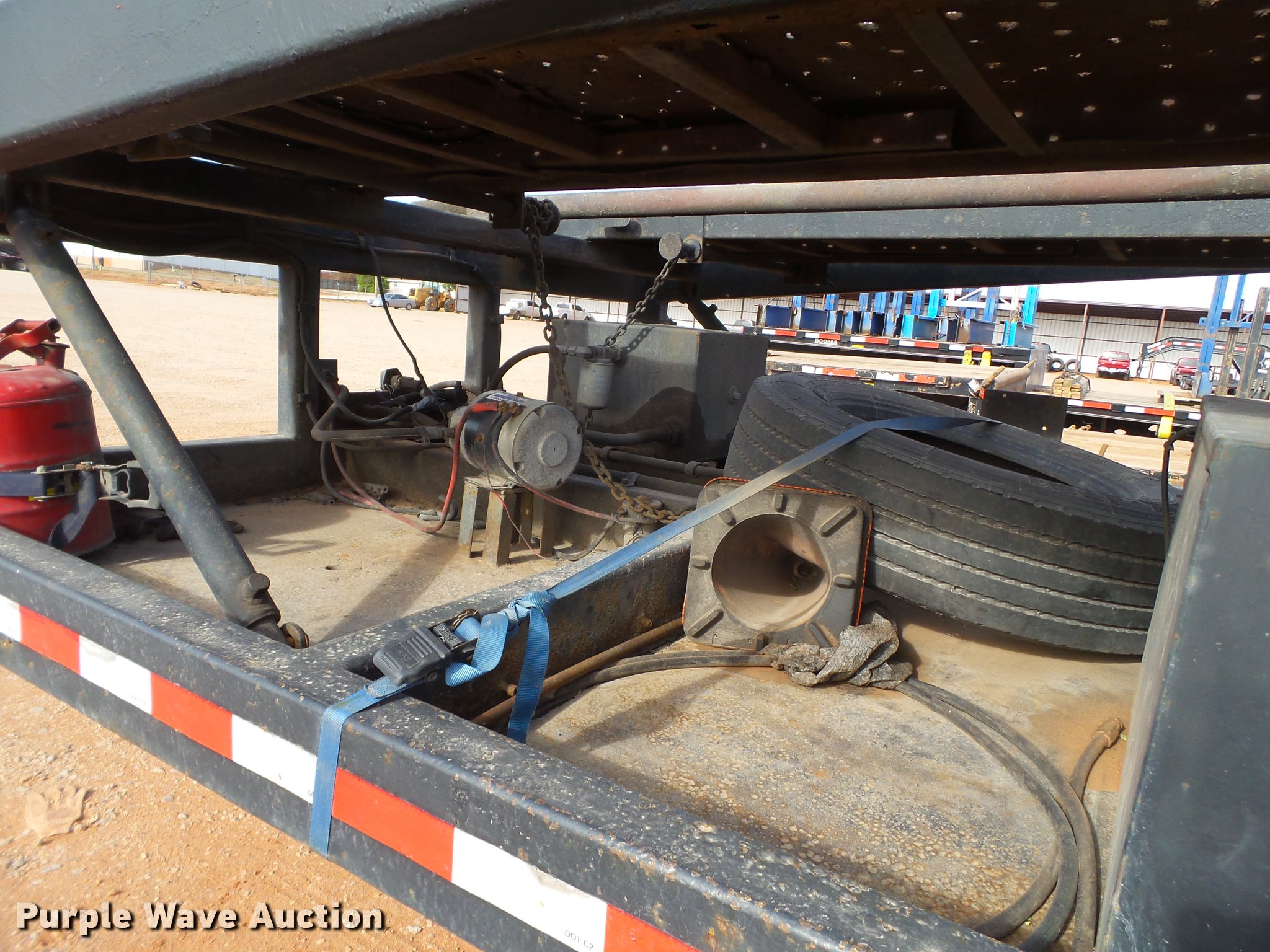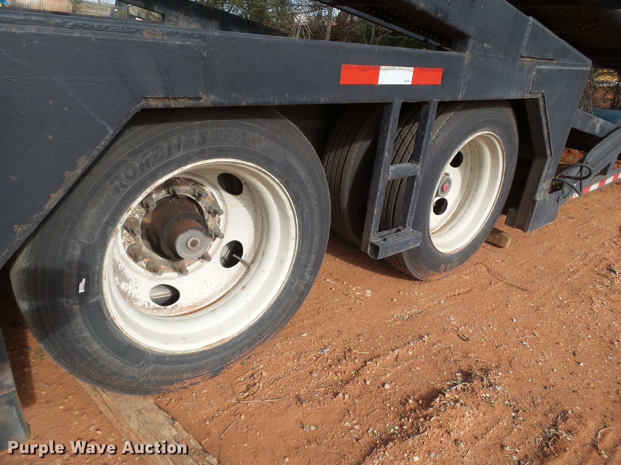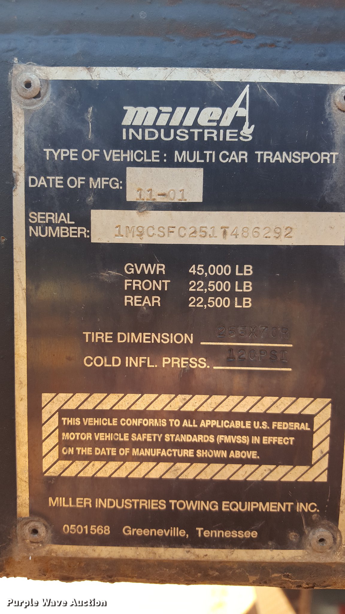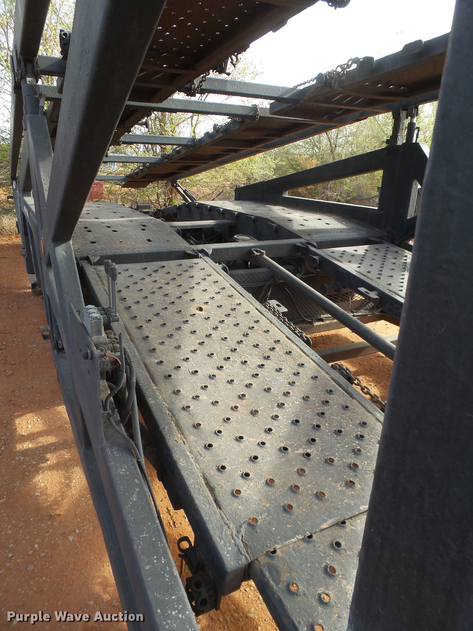 Purple Wave is selling a used Car Carrier in Oklahoma. This item is a 2001 Miller car trailer with the following: 53'L x 102"W, (7) car capacity, Hydraulic operated upper deck, On-board electric over hydraulic system, Fifth wheel plate, Air suspension, Air brakes, Tandem axle, Aluminum wheels, 255/70R22.5 tires