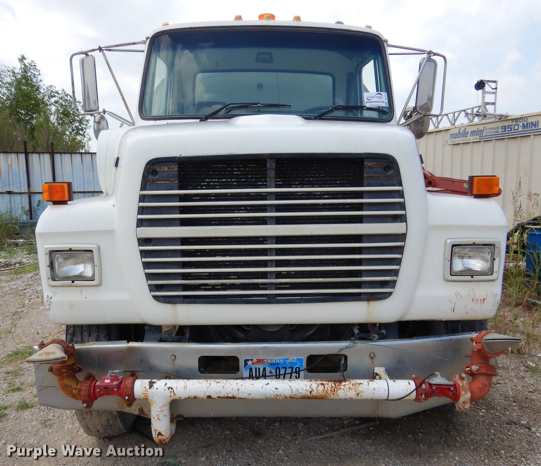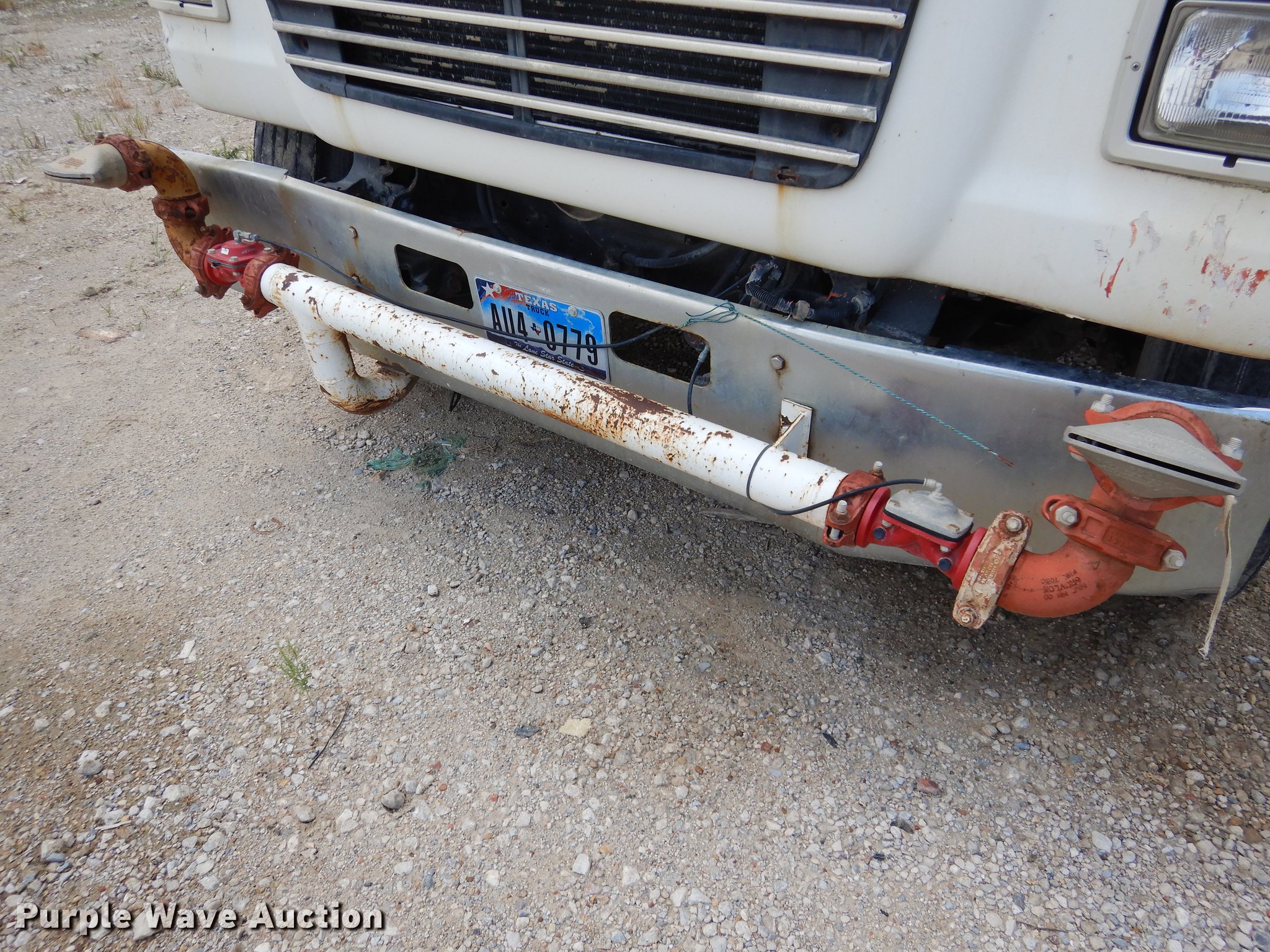 Purple Wave is selling a used Tank Truck or Water Truck in Texas. This item is a 1992 Ford LN8000 tank truck with the following: 7.8L six cylinder diesel engine, Five speed manual transmission, Single axle, Air suspension seat, PTO, 2,500 gallon tank capacity, Front spray bar, Front and rear discharge, Top fill, Ladder, Spring suspension, Air brakes, 11R24.5 tires