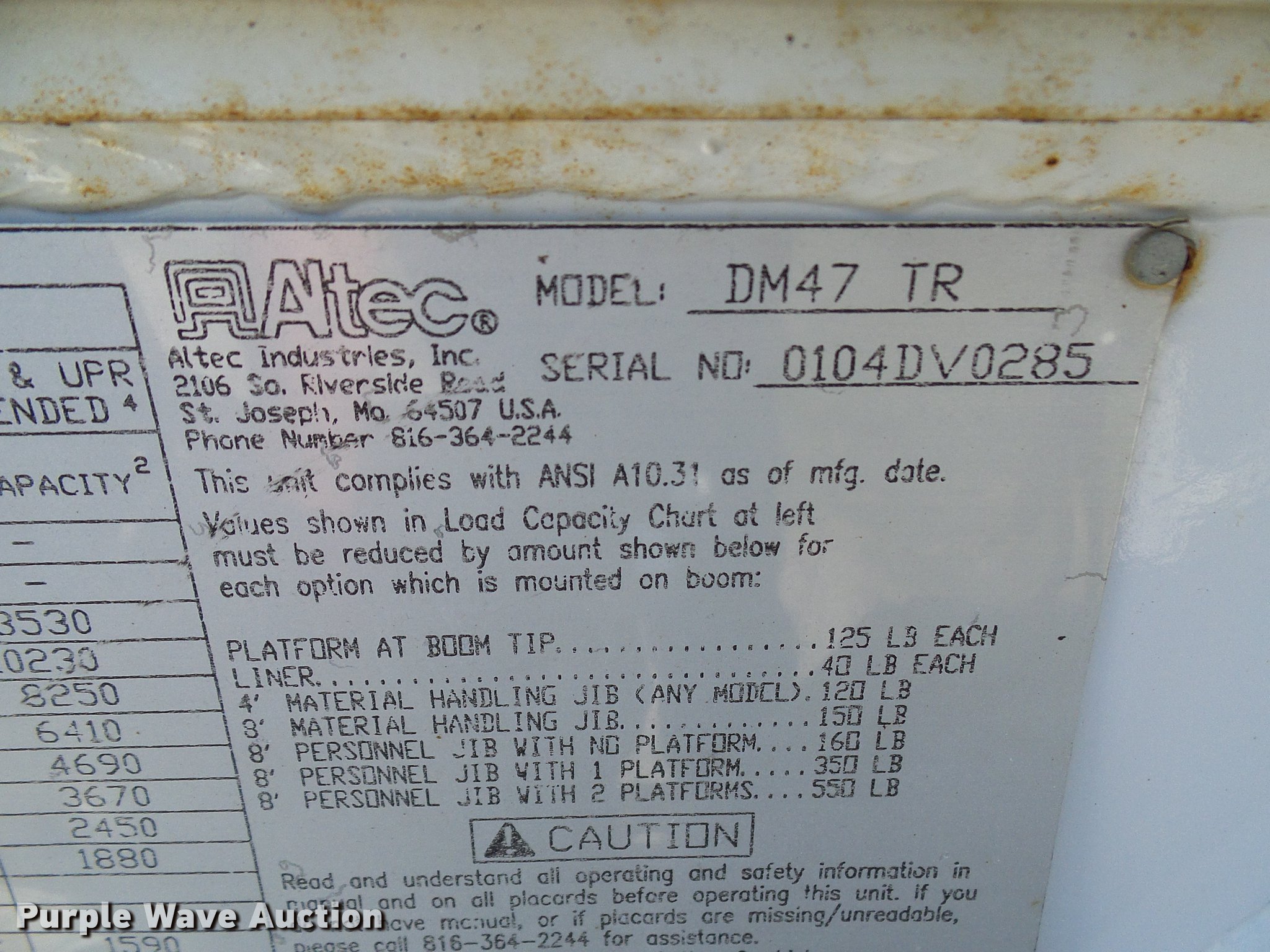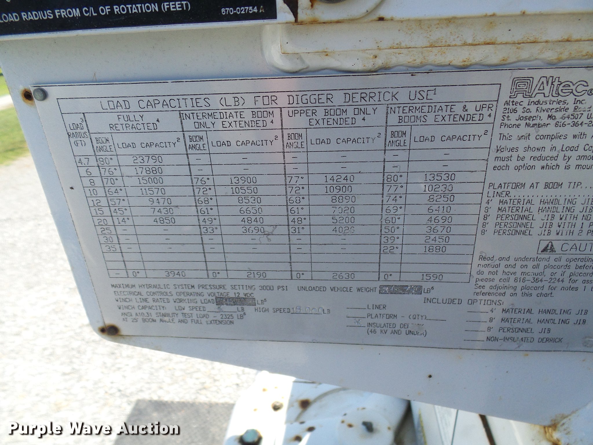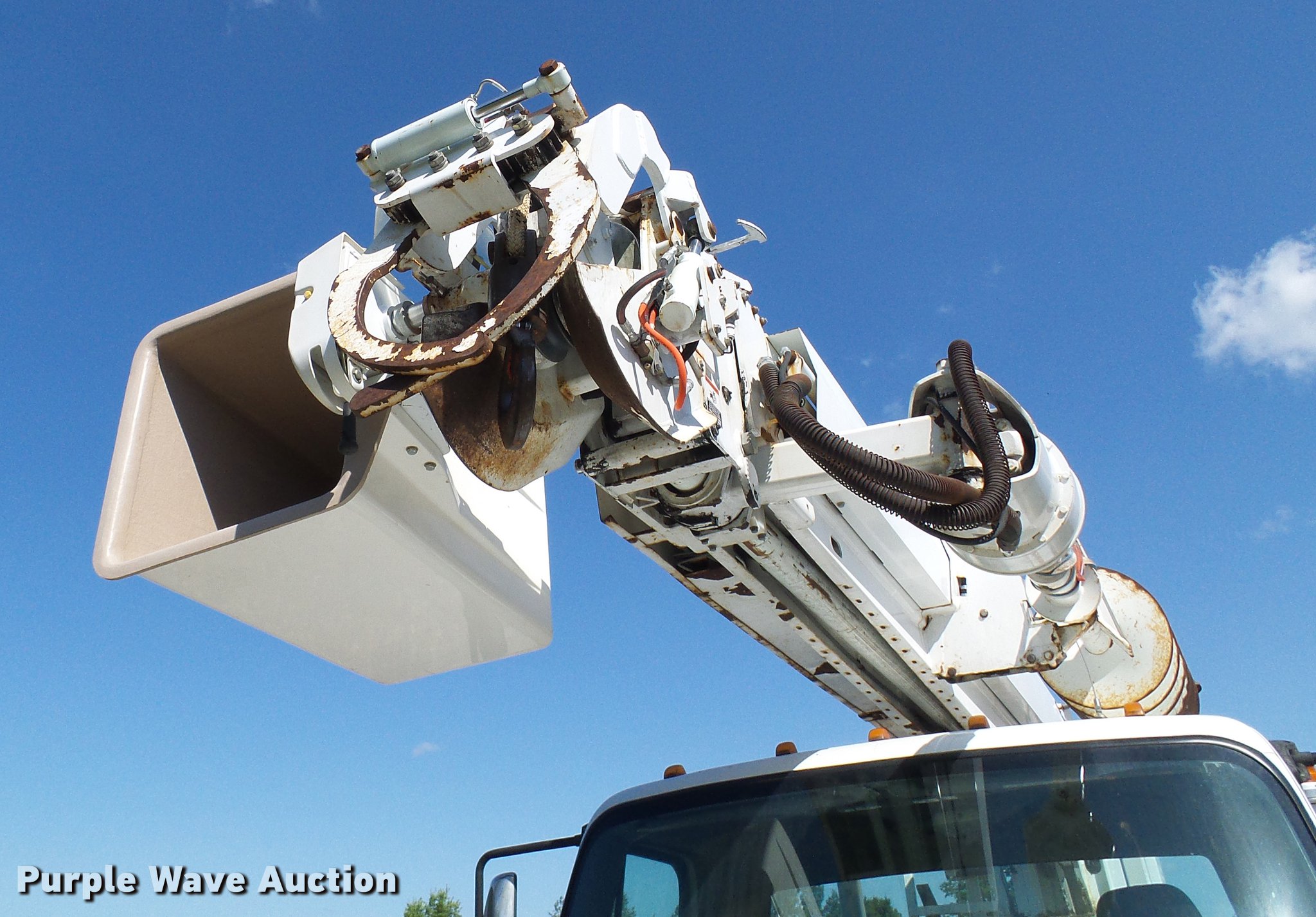 Purple Wave is selling a used Digger Derrick Truck in Missouri. This item is a 2004 Freightliner Business Class M2 digger derrick truck with the following: 65,105 miles on odometer, 4,856 hours on meter, Miles and hours may vary, still in use, Caterpillar C7 7.2L L6 turbo diesel engine, Six speed manual transmission, Single axle, AC and heat, Cruise, AM/FM, Suspension seat, Brake controller, Beacon light, Front tow hooks, PTO, Altec utility bed, 15'L, Shelving, Serial 37-2246875, Altec DM47TR digger derrick, 18,000 lbs max lift capacity, Man basket, Pin-on, 47' max lift height, Ground and platform controls, Pole guide, Telescopic boom, 18" diameter auger, Rope material handler, (4) outriggers, Serial 0104DV0285, Single fuel tank, Pintle hitch, Trailer wiring, Spring suspension, Air brakes, 11R22.5 tires, GVWR 33,000 lbs