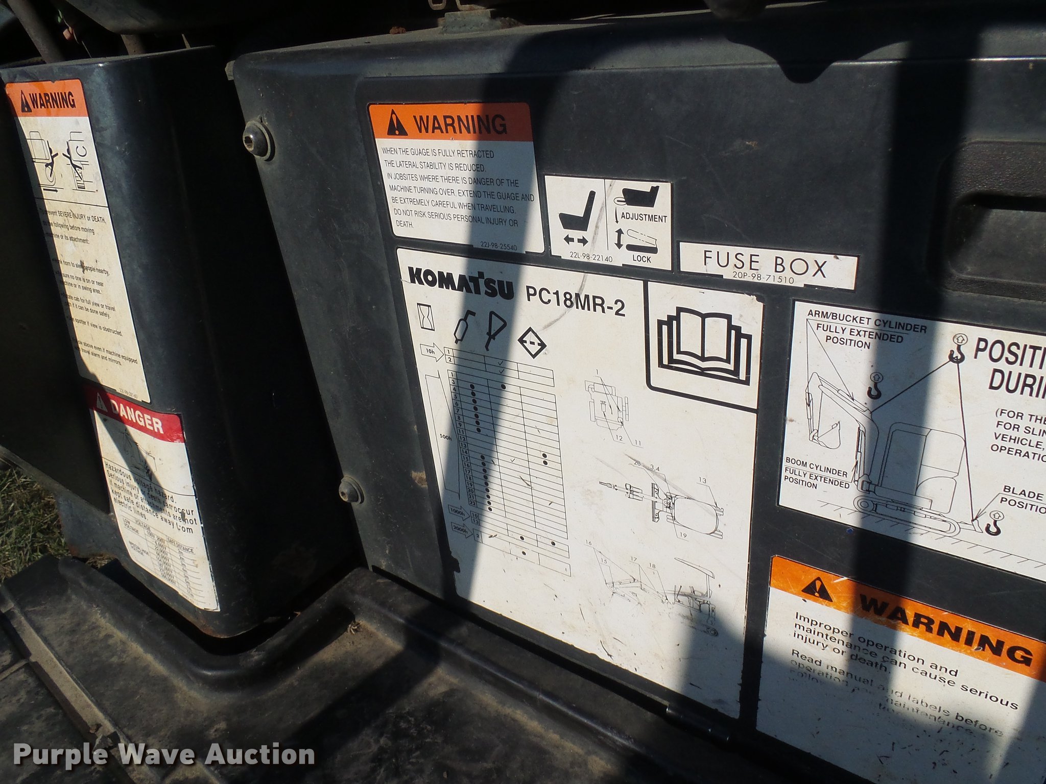 Purple Wave is selling a used Mini Excavator in Missouri. This item is a 2007 Komatsu PC18MR-2 mini excavator with the following: 2,779 hours on meter, Three cylinder diesel engine, Two speed hydrostatic transmission, Suspension seat, Standard boom, 12"W bucket, Weld-on cutting edge, (3) bolt-on teeth, 9"W rubber tracks, Hydraulic track width adjustment, Small gear on swing motor is missing teeth, Serial KMTPC135T05017902