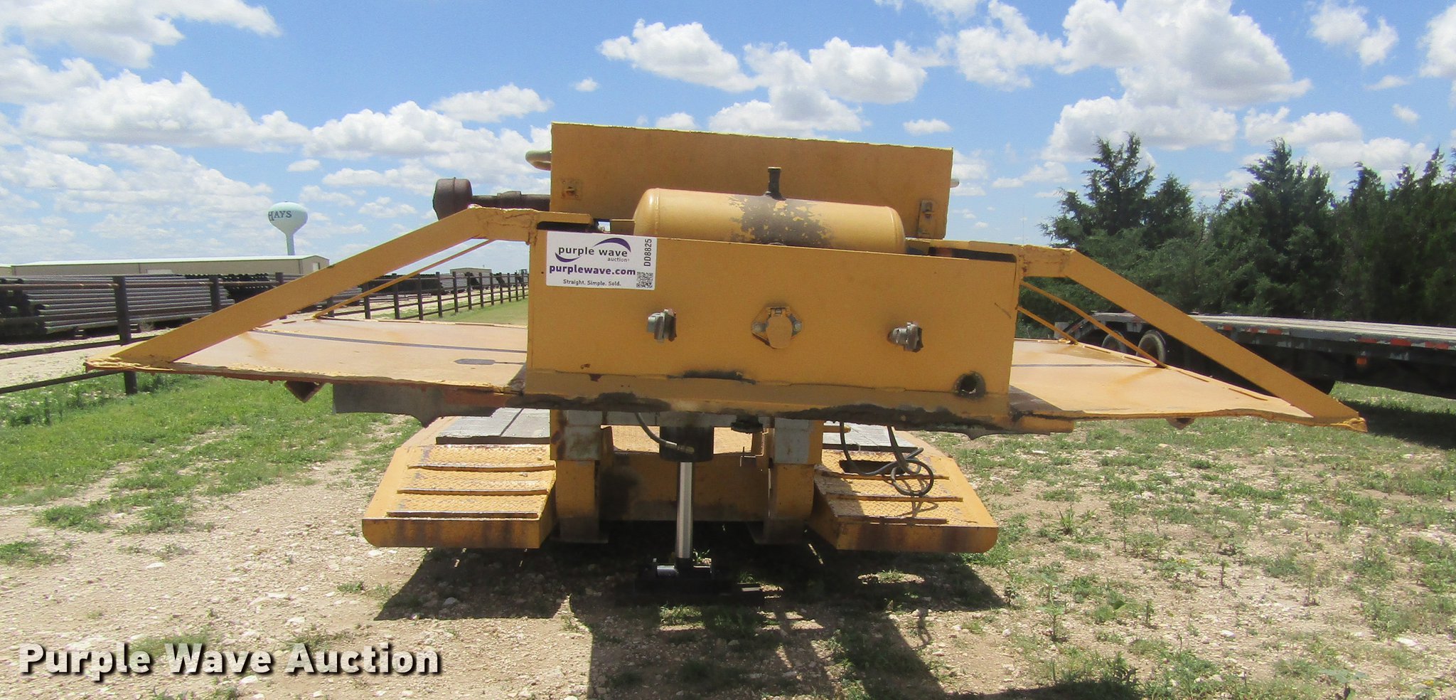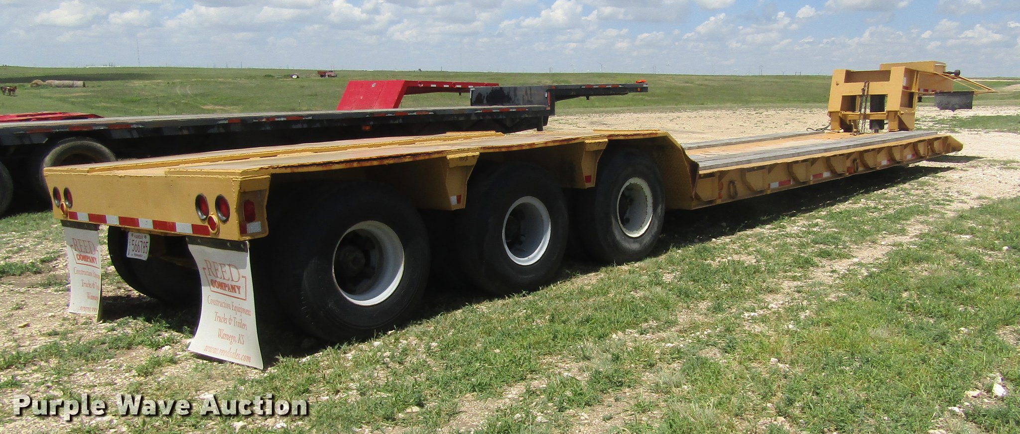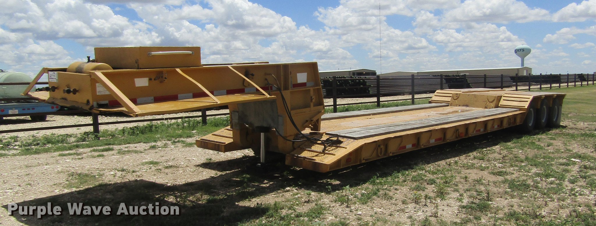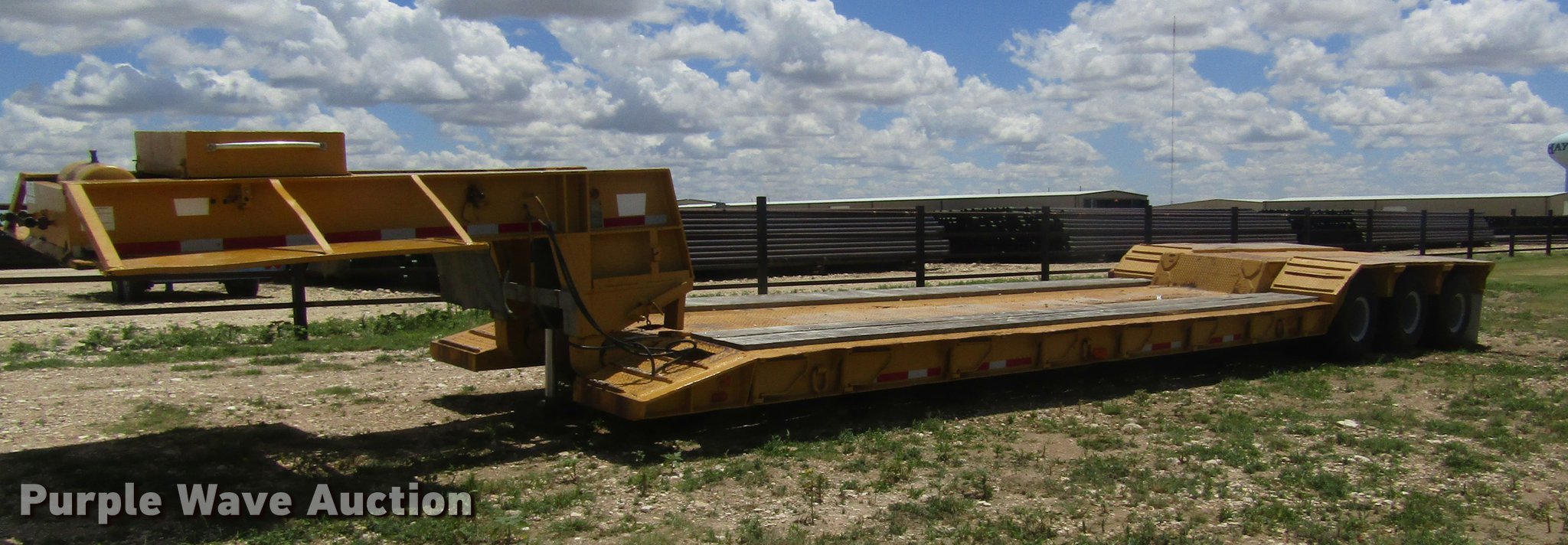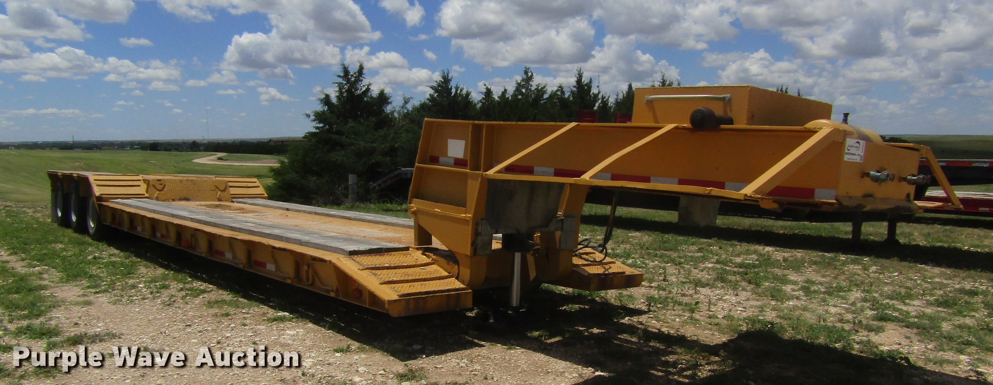 Purple Wave is selling a used Equip. Trailer in Kansas. This item is a 1984 Witco Challenger RG50 lowboy equipment trailer with the following: 46'L x 102"W, 23'L well, 13'L rear deck, 13" swing and stow side extensions, Wood and steel deck, D-ring tie downs, Detachable neck, 50 ton capacity, Fifth wheel plate, Single hydraulic landing gear, Spring suspension, Air brakes, Triple axle, Steel wheels, 10.00R15 tires, Rear deck weld will be repaired prior to auction
