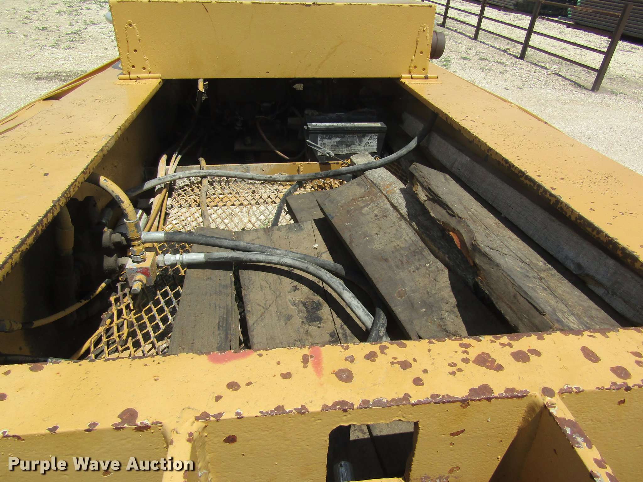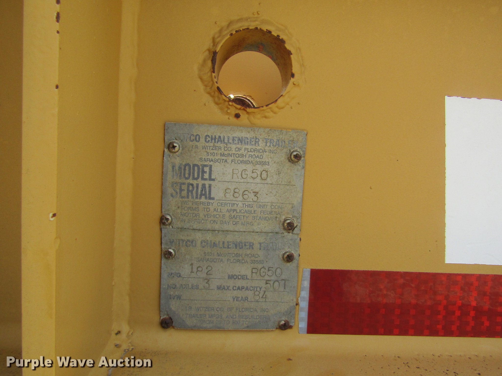 1984 Witco Challenger RG50 lowboy equipment trailer. 46'L x 102"W, 23'L well, 13'L rear deck, 13" swing and stow side extensions, Wood and steel deck, D-ring tie downs, Detachable neck, 50 ton capacity, Fifth wheel plate, Single hydraulic landing gear, Spring suspension, Air brakes, Triple axle, Steel wheels, 10.00R15 tires, Rear deck weld will be repaired prior to auction. Kansas title. 8863. 5555 N Vine St. Hays, KS 67601