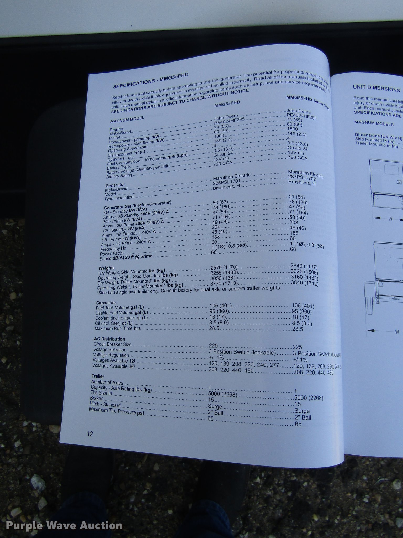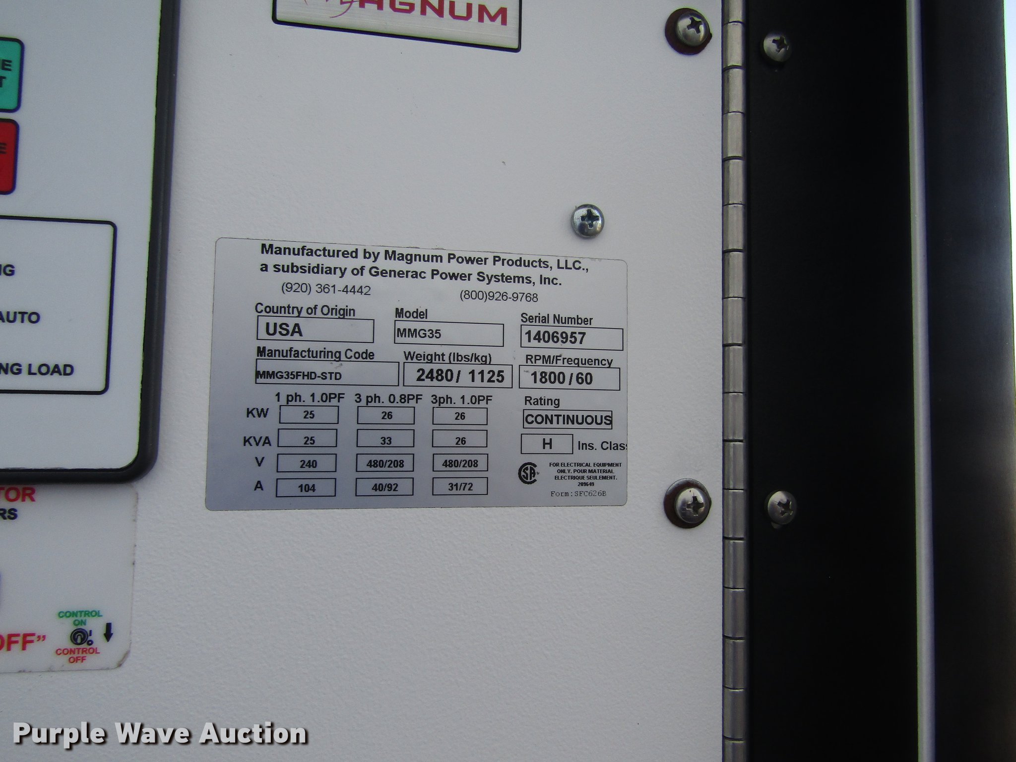 Purple Wave is selling a used Generator Set in Kansas. This item is a 2014 Magnum MMG35 generator with the following: 585 hours on meter, John Deere 4024TF281B four cylinder diesel engine, Serial PE4024R094198, Electric start, 41 kVA, 33 kW, Three phase, 44 kVA standby service, 35 kW standby service, Fuel tank, Skid mounted, Trailer not included, Serial 1406957