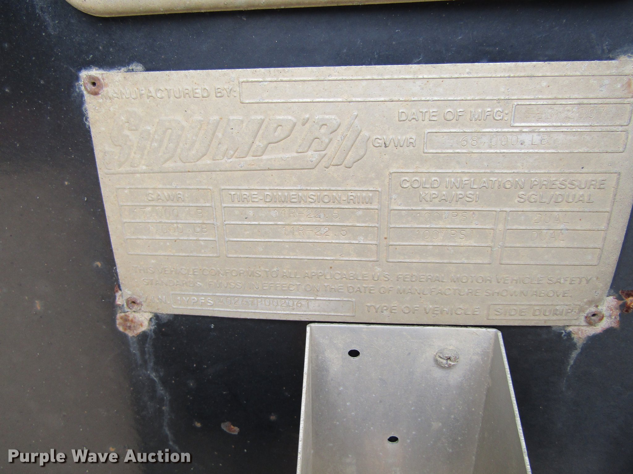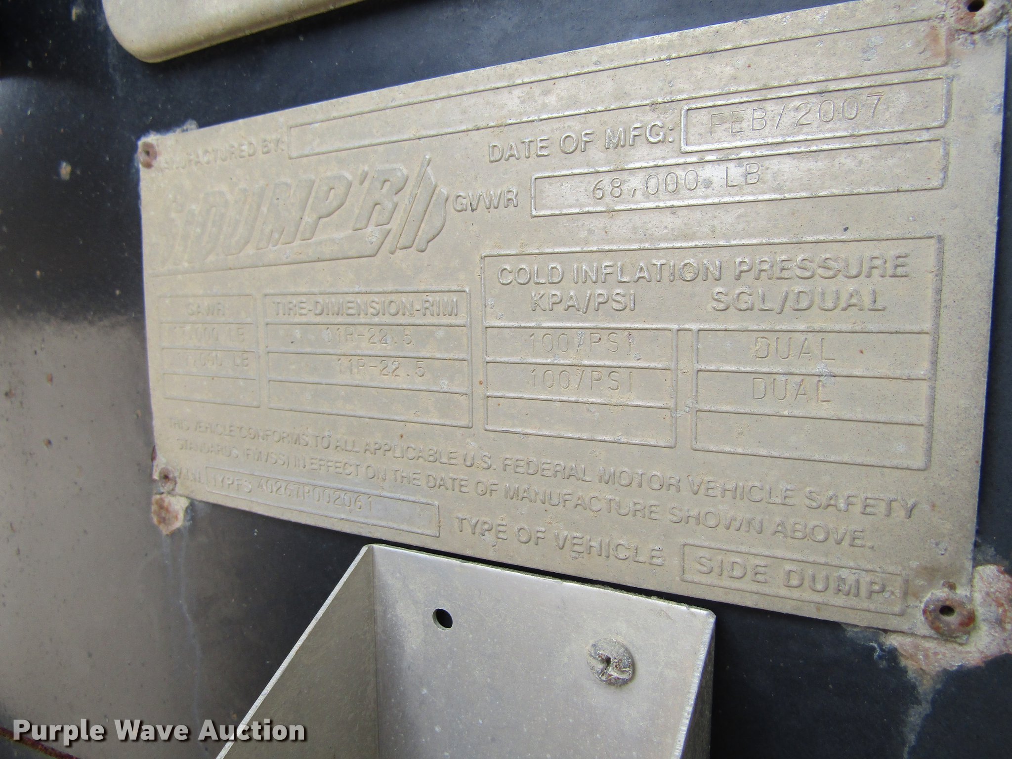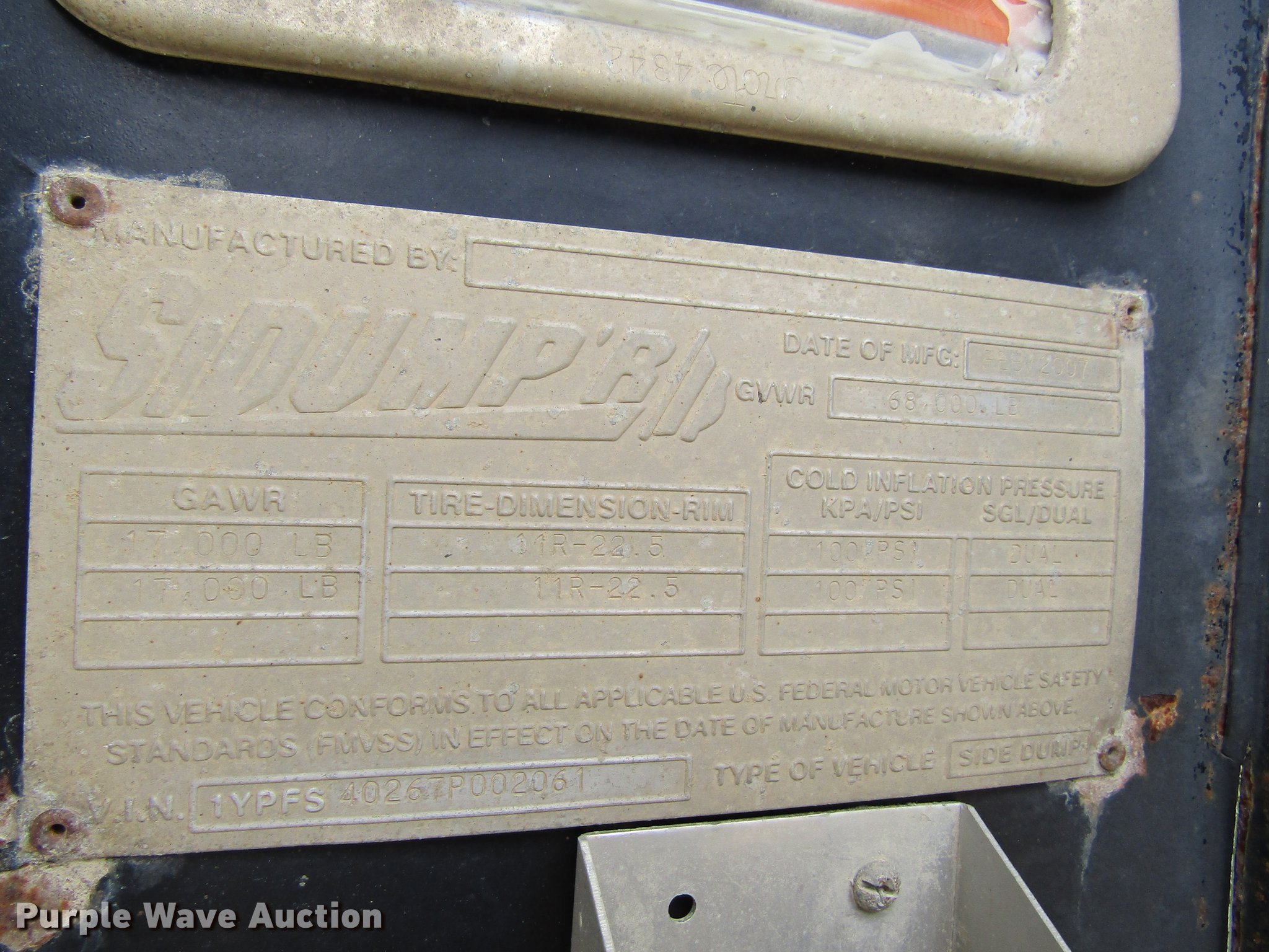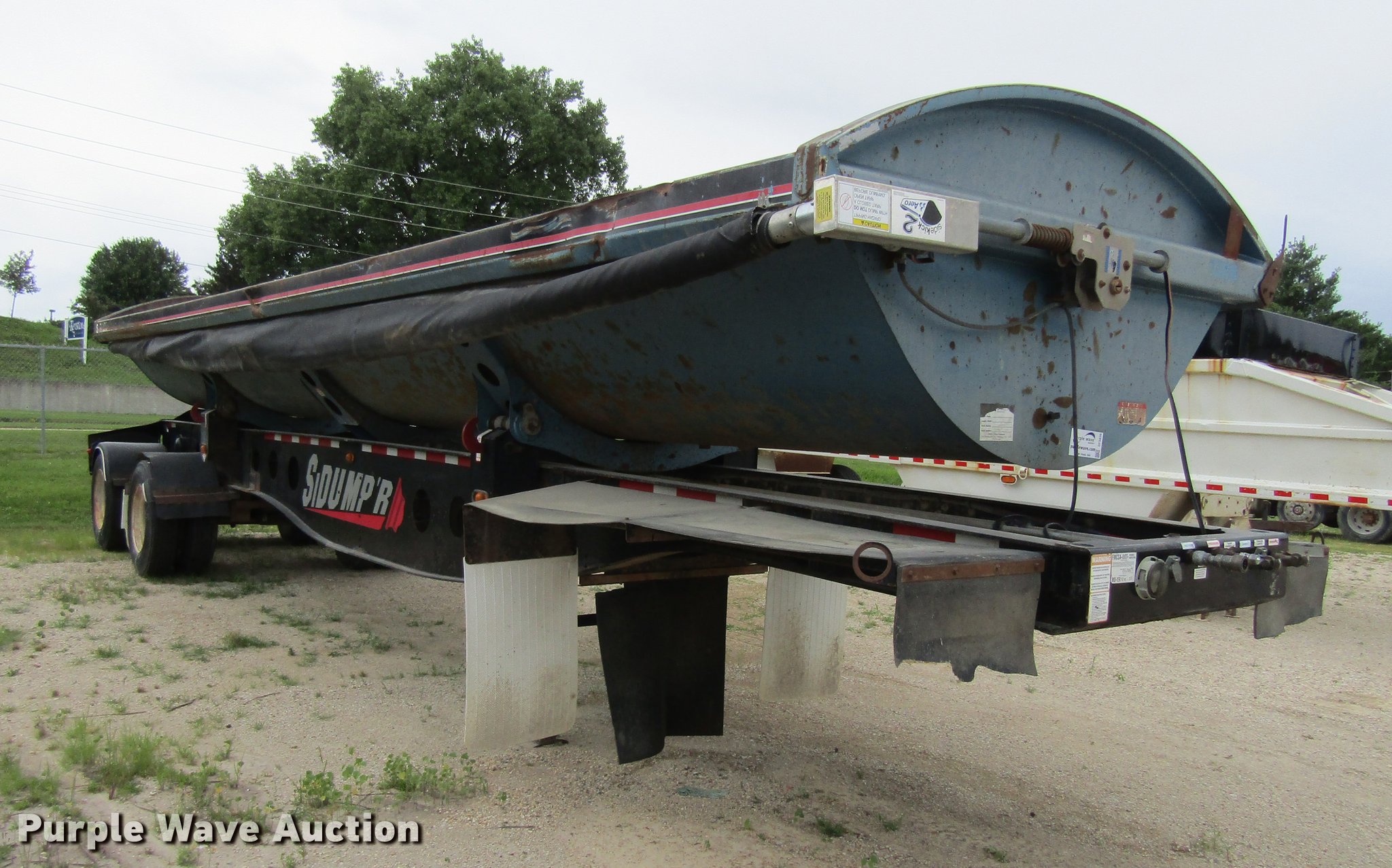 Purple Wave is selling a used Side Tilt Dump Trailer in Iowa. This item is a 2007 Sidumpr side dump trailer with the following: 42' overall length, 8.5'W, 36" side height, Single cylinder hoist, Electric tarp, Fifth wheel plate, Dual leg landing gear, Air suspension, Air brakes, Tandem axle, 11R22.5 tires, GVWR 68,000 lbs