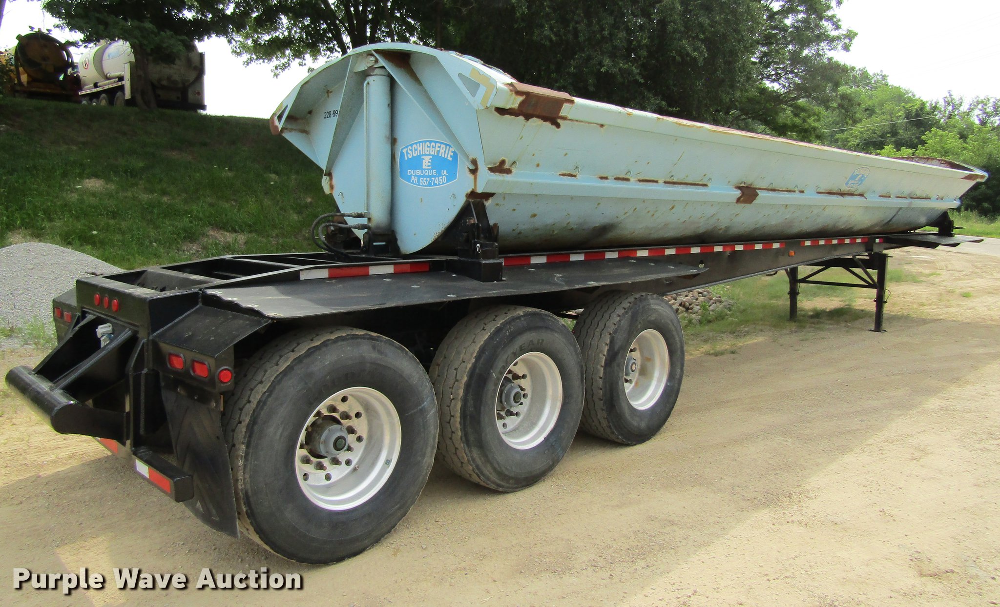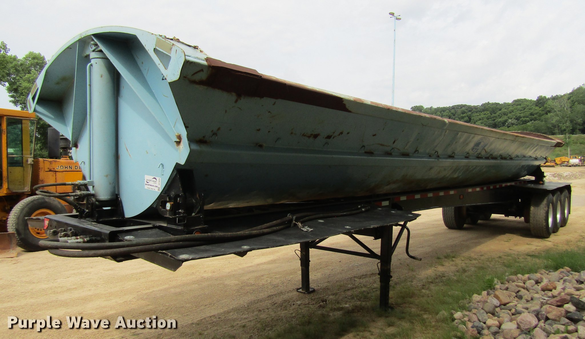 Purple Wave is selling a used Side Tilt Dump Trailer in Iowa. This item is a 1999 Smithco side dump trailer with the following: 47' overall length, 38'L x 8.5'W dump body, 36" side height, Steel construction, Dual hydraulic cylinders, Fifth wheel plate, Dual leg landing gear, Spring suspension, Air brakes, Triple axle, Aluminum wheels, 425/65R22.5 tires