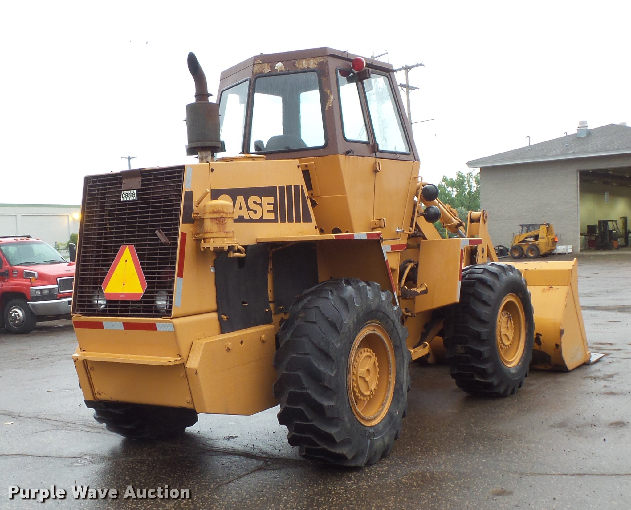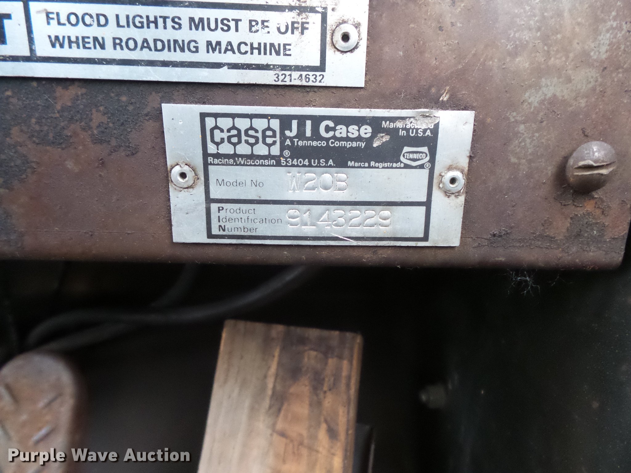 Purple Wave is selling a used Wheel Loader in Minnesota. This item is a 1981 Case W20B wheel loader with the following: Unknown hours on meter, Case six cylinder turbo diesel engine, Powershift transmission, 2F-2R gears, Enclosed cab, Heat, Suspension seat, Two-lever bucket controls, Front and rear work lights, Block heater, Ether start, 94"W general purpose bucket, Bolt-on cutting edge, Counterweights, 17.5-25 tires, Serial 9143229