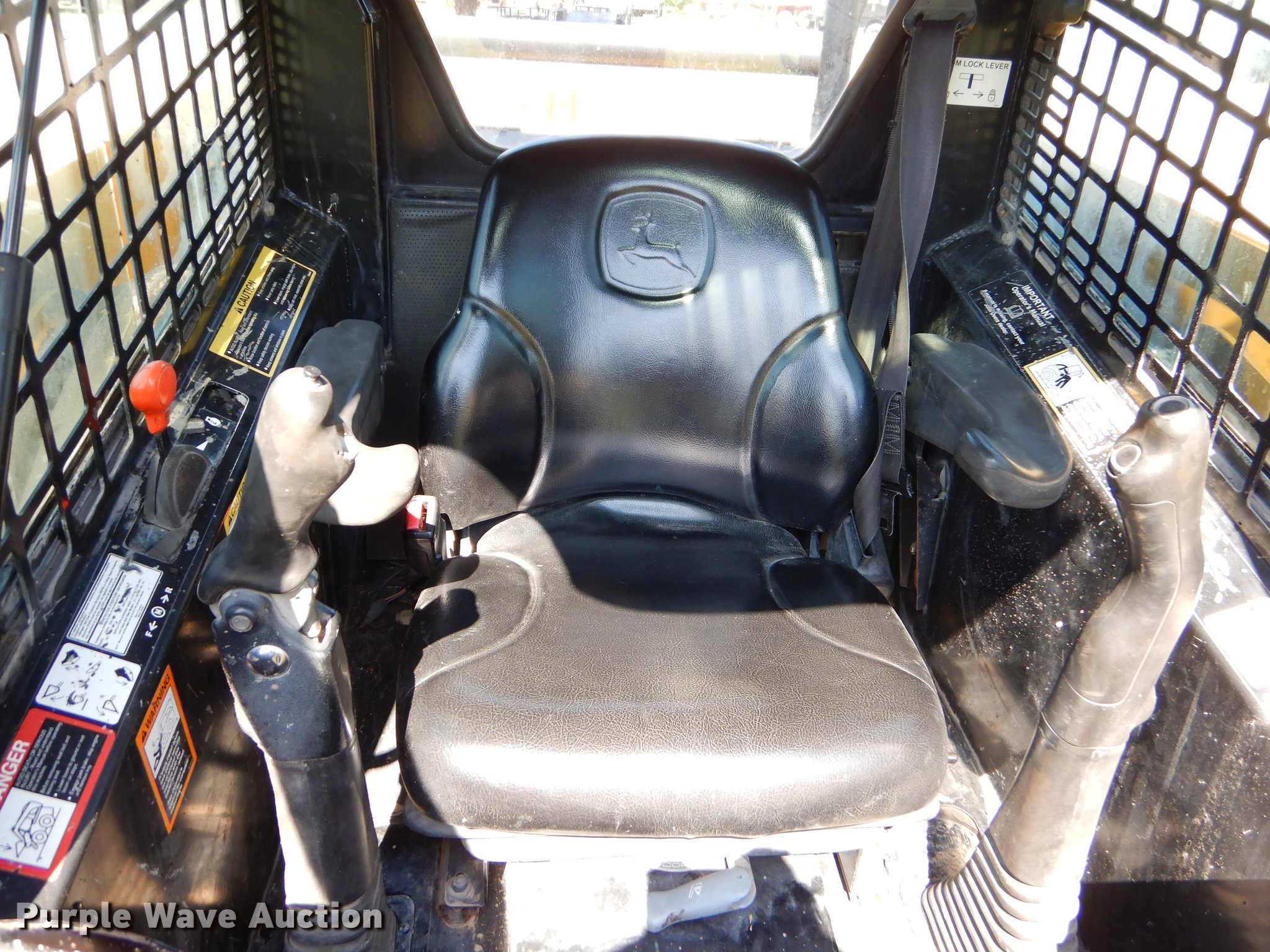 Purple Wave is selling a used Skid Steer Loader in Oklahoma. This item is a 2005 John Deere 332 skid steer with the following: 2,111 hours on meter, John Deere five cylinder turbo diesel engine, Hydrostatic transmission, Enclosed cab, Heat, Hand and foot controls, Suspension seat, Front and rear work lights, Backup alarm, Auxiliary hydraulics, Manual quick coupler, 77"W low profile bucket, Bolt-on cutting edge, 14-17.5 tires, Serial T00332E108594