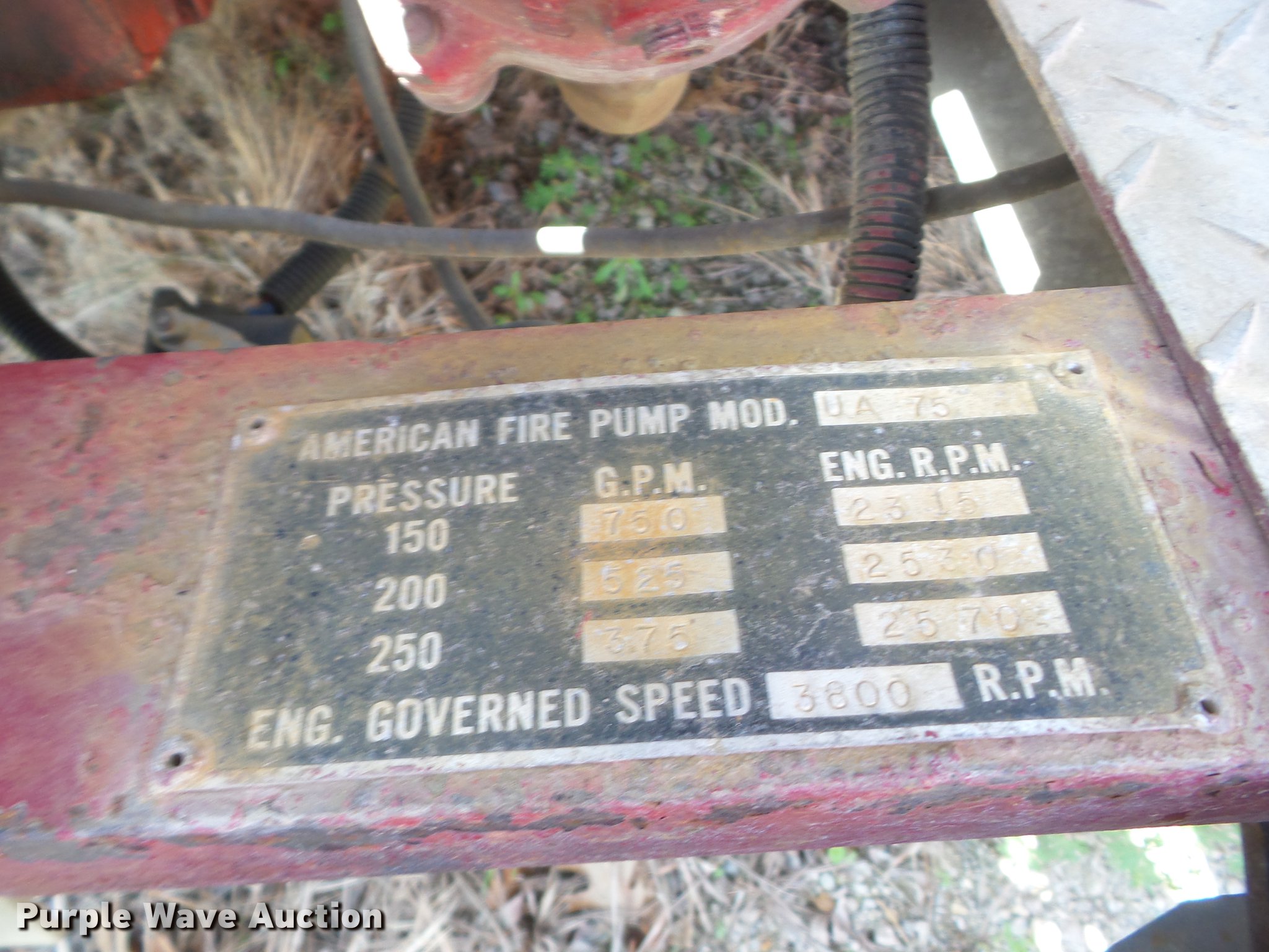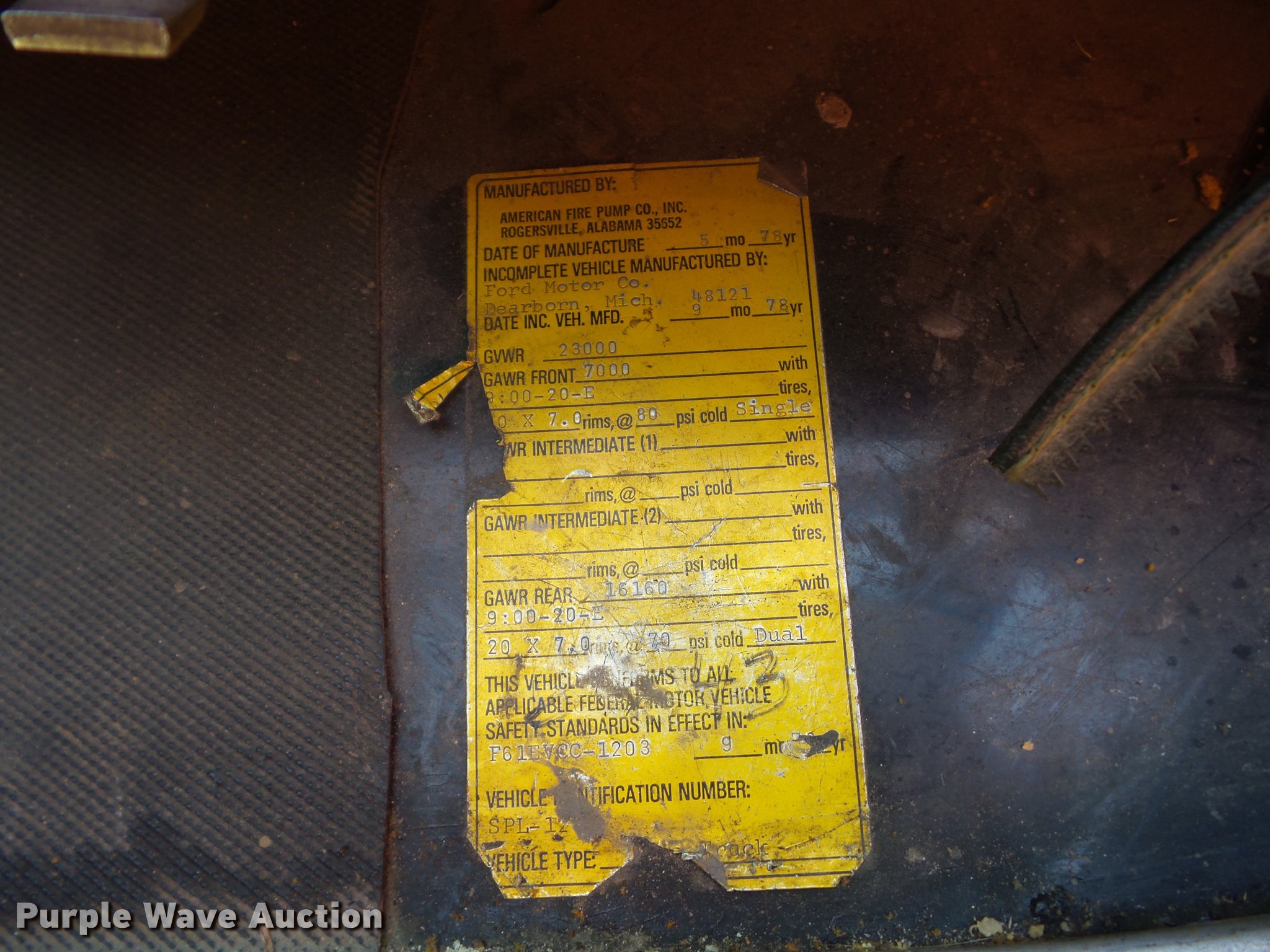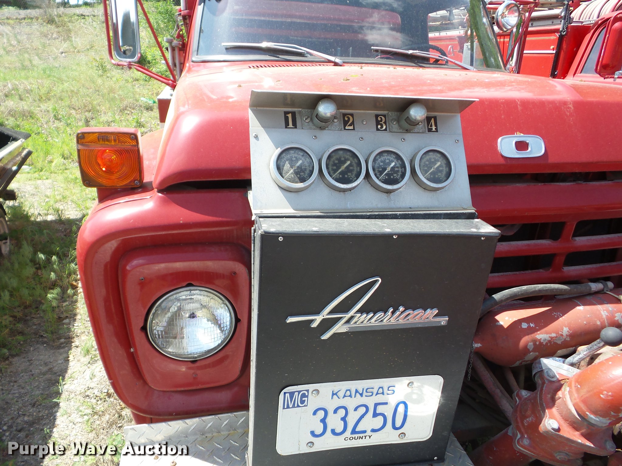 Purple Wave is selling a used Fire Truck or Emergency Vehicle in Kansas. This item is a 1978 Ford fire truck with the following: 8,794 miles on odometer, 850 hours on meter, Four speed manual transmission, Two speed rear end, Single axle, Heat, PTO, American Plain Jane fire apparatus bed, 750 gpm pump, Front mounted pump, 9.00-20 tires, Hood will not open, Unit# 26