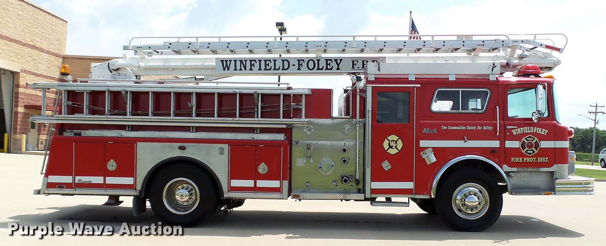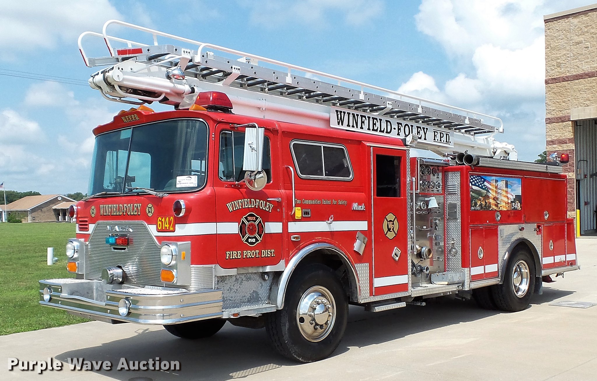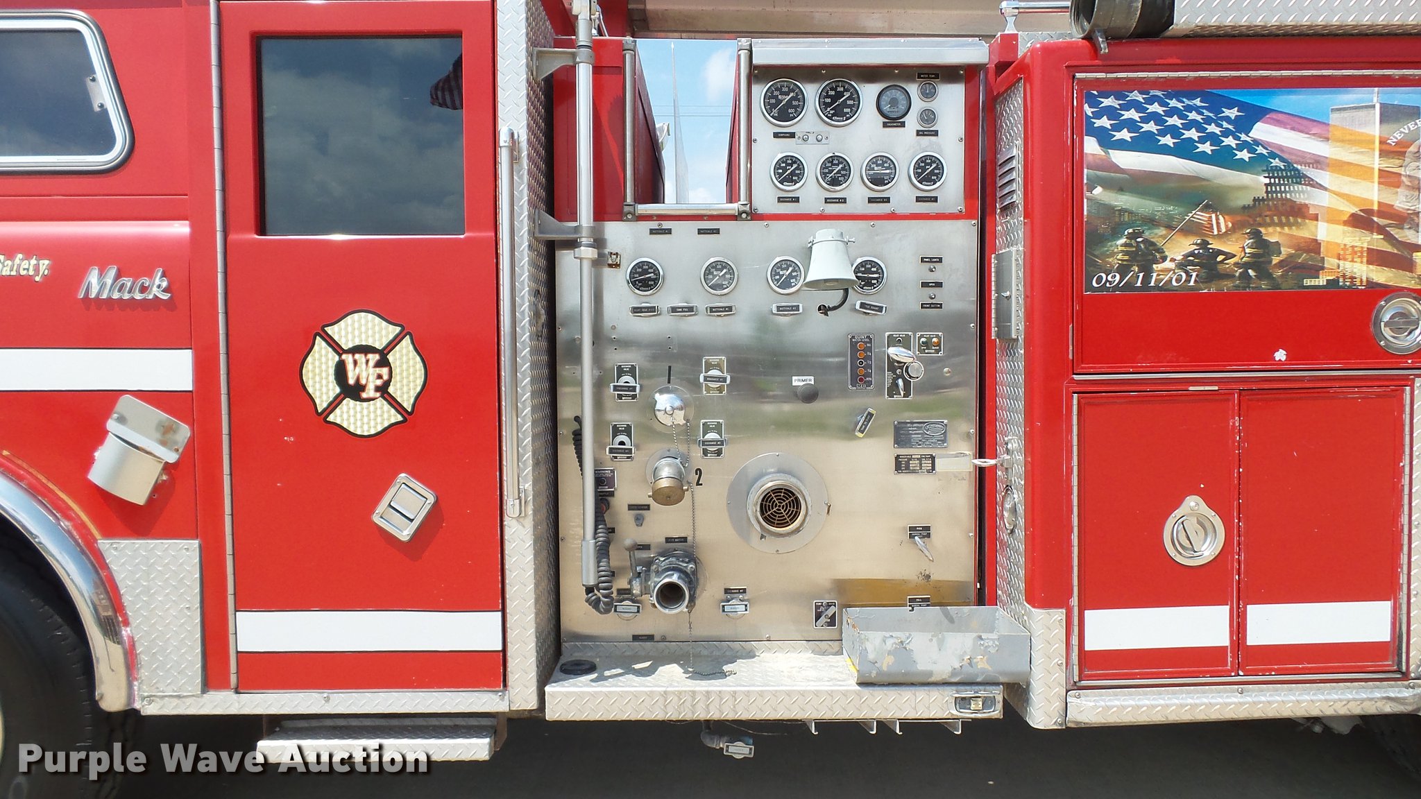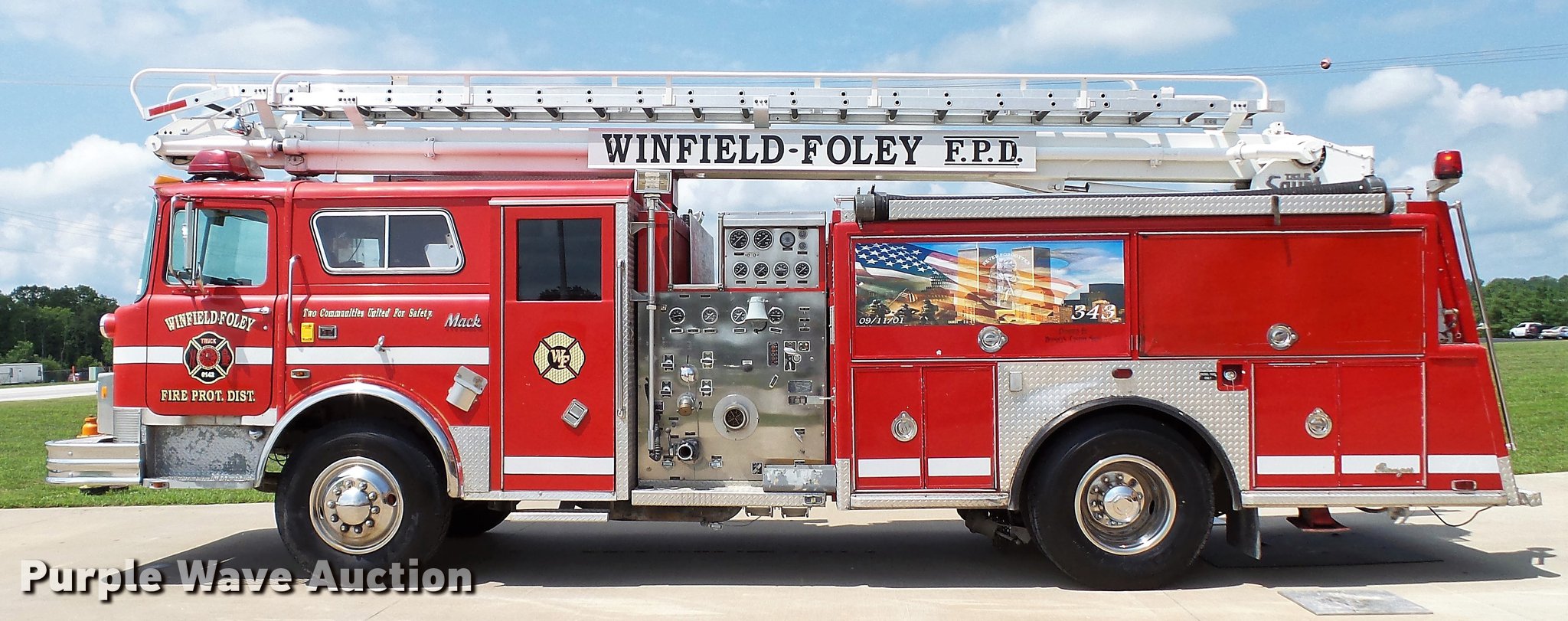 Purple Wave is selling a used Fire Truck or Emergency Vehicle in Missouri. This item is a 1988 Mack CF688FC fire truck with the following: 71,440 miles on odometer, 5,381 hours on meter, Mack six cylinder turbo diesel engine, Mack automatic transmission, Single axle, Heat, Air suspension seat, Air horn, PTO, Waterous Ranger platform, 9,729 hours on meter, 1,000 gpm pump, (2) outriggers, Outlet box, Work lights, Tele Squrt 50 B5042 ladder, 55'L, Two sections, Pre-piped water way ladder, Possible hydraulic hose leaking on ladder rotation, 10' attic ladder, 35' extension ladder, Receiver hitch, Air brakes, Engine brake, 12R22.5 tires, 9/11 mural on side of truck, Decals will be removed prior to auction, Removed from service in July 2017