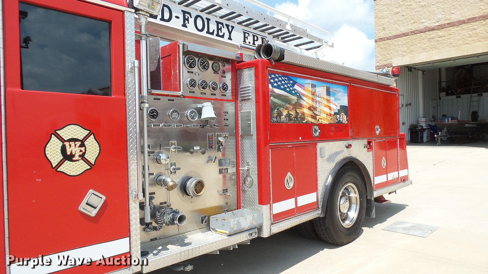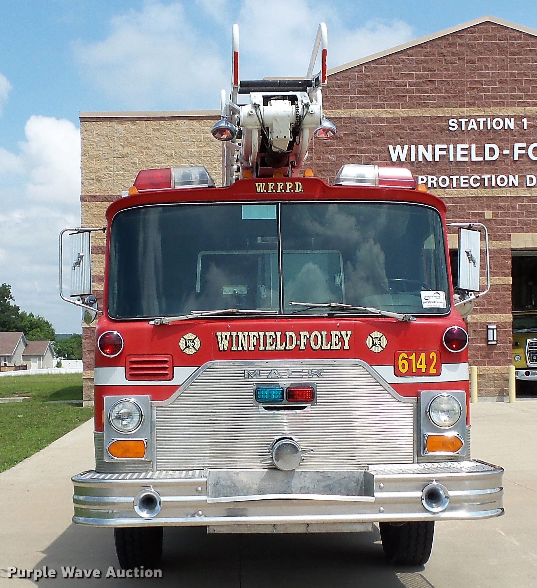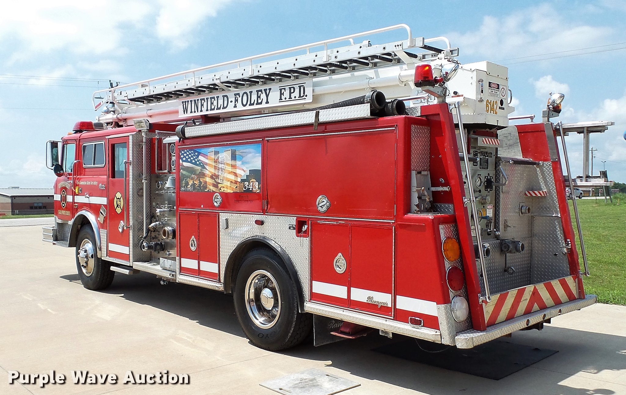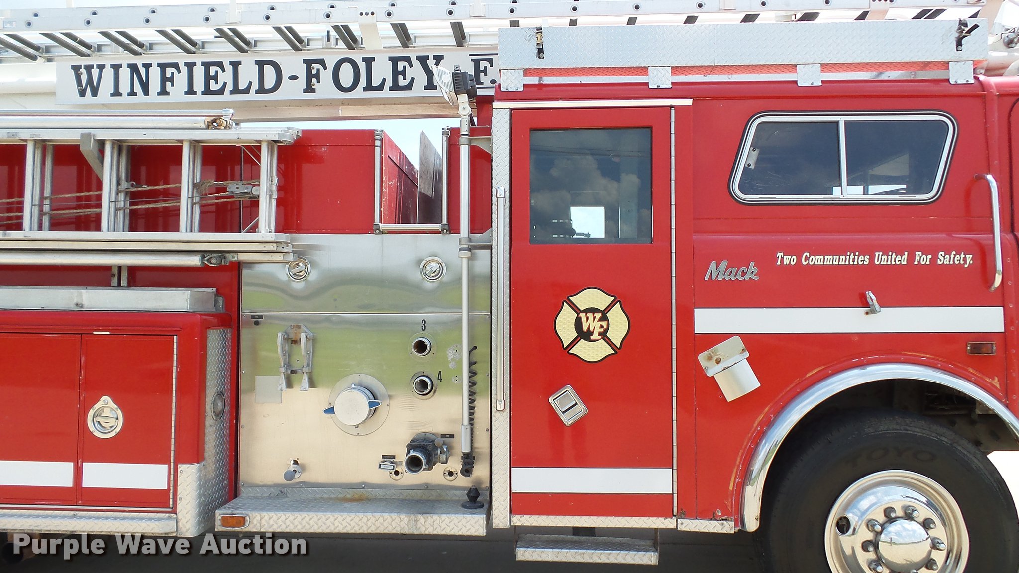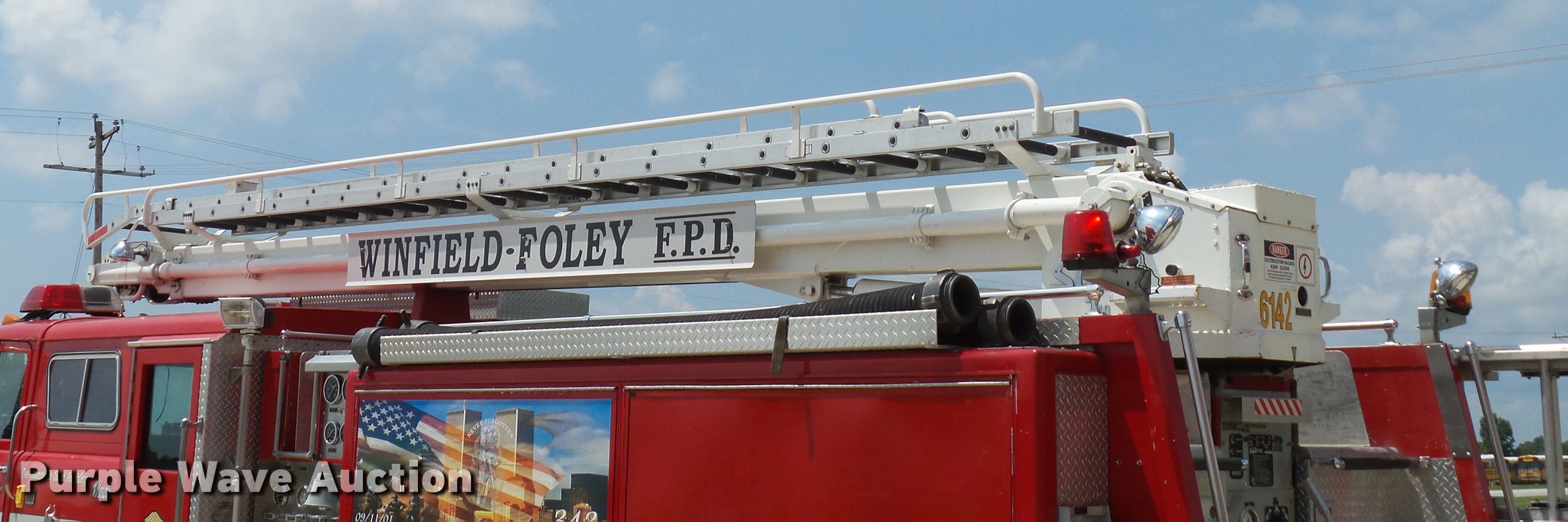 Purple Wave is selling a used Fire Truck or Emergency Vehicle in Missouri. This item is a 1988 Mack CF688FC fire truck with the following: 71,440 miles on odometer, 5,381 hours on meter, Mack six cylinder turbo diesel engine, Mack automatic transmission, Single axle, Heat, Air suspension seat, Air horn, PTO, Waterous Ranger platform, 9,729 hours on meter, 1,000 gpm pump, (2) outriggers, Outlet box, Work lights, Tele Squrt 50 B5042 ladder, 55'L, Two sections, Pre-piped water way ladder, Possible hydraulic hose leaking on ladder rotation, 10' attic ladder, 35' extension ladder, Receiver hitch, Air brakes, Engine brake, 12R22.5 tires, 9/11 mural on side of truck, Decals will be removed prior to auction, Removed from service in July 2017