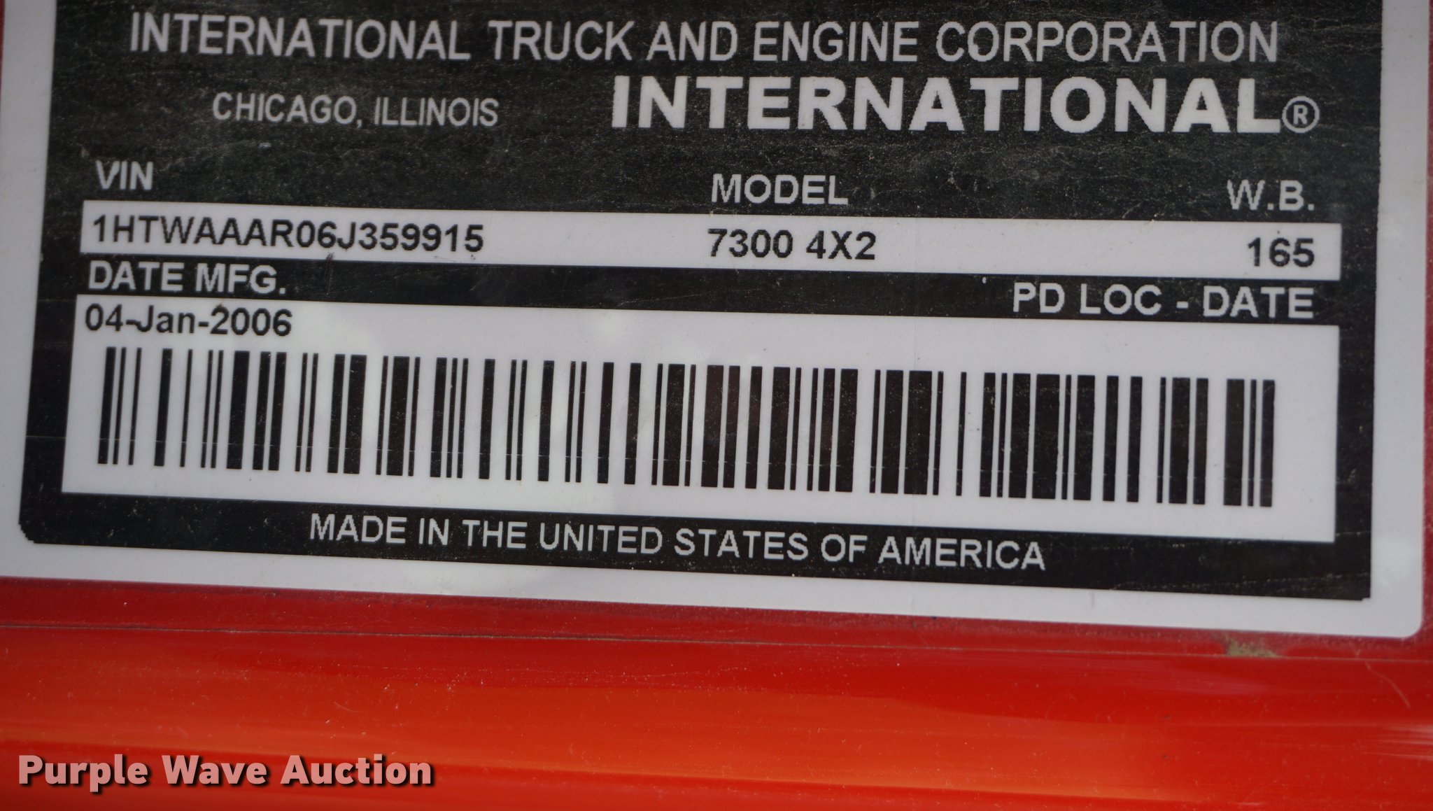 2006 International 7400 dump truck. 101,110 miles on odometer, 5,638 hours on meter, International DT466 7.6L L6 diesel engine, Allison automatic transmission, Single axle, AC and ehat, Cruise, AM/FM/cassette, Air suspension seat, Front mounted PTO, 10'L x 95.5"W steel dump bed Roll tarp, Bed conveyor, Snow plow bracket, Single fuel tank, Spring suspension, Air brakes, 12R22.5 tires, Automatic tire chains, GVWR 37,000 lbs, FAWR 14,000 lbs, RAWR 23,000 lbs, Non-operational unit, Parts missing, Cylinder heads need replaced, Unit# PWK4462. Kansas title. 1HTWAAAR06J359915. Johnson County. 1800 W Old 56 Hwy. Olathe, KS 66061