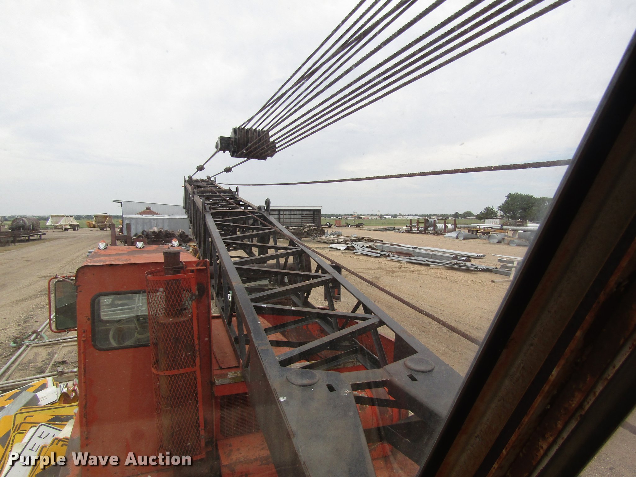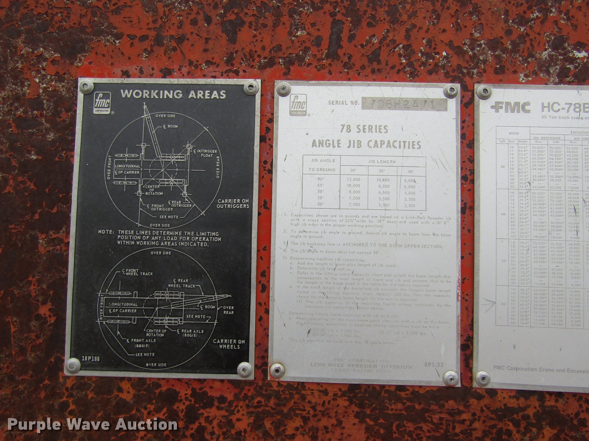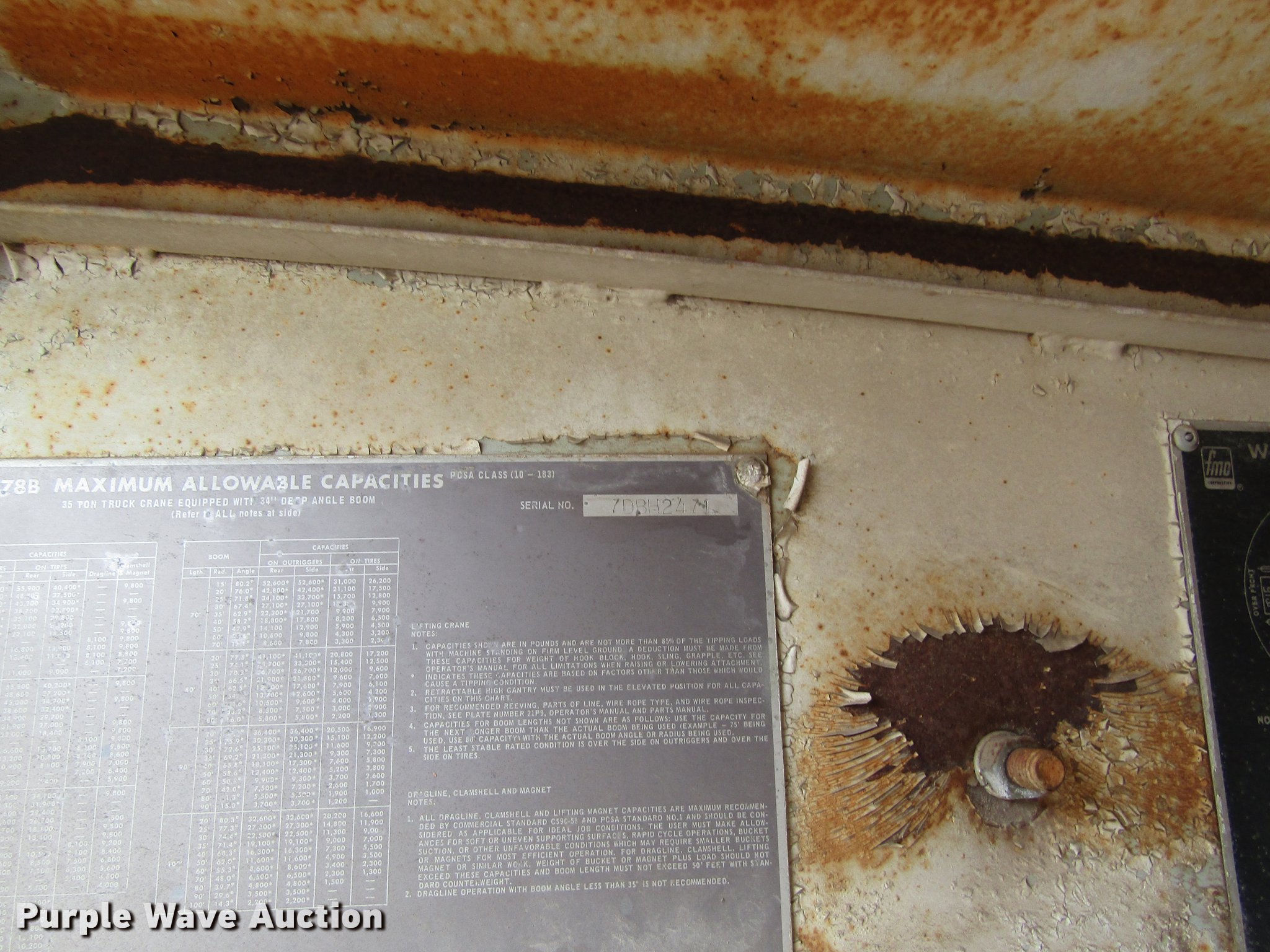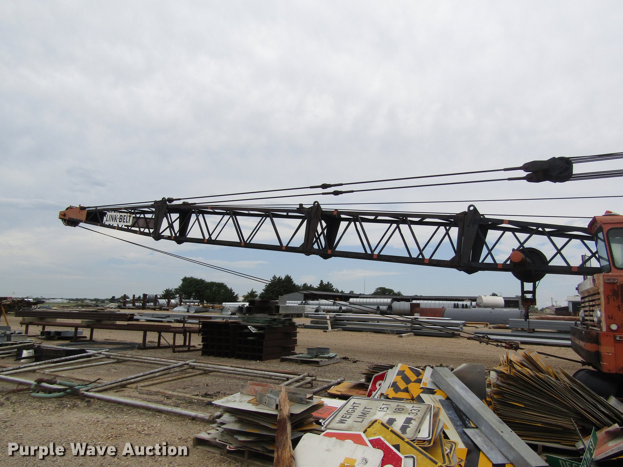 Purple Wave is selling a used Truck Crane in Kansas. This item is a 1975 Link Belt HC78B truck crane with the following: 15,601 miles on odometer, Detroit Diesel six cylinder lower diesel engine, Detroit Diesel six cylinder upper diesel engine, 2,305 hours on meter, 15 speed manual transmission, Tandem axle, Suspension seat lower interior, Suspension seat upper interior, Stick crane controls, Lattice boom crane, 60' boom length, Four sections, Removeable counterweight, In-cab boom controls, (6) sheaves, (4) stabilizers, 35 ton capacity, Spring suspension, Air brakes, 12.00-20 tires, Throttle cable needs to be replaced, Serial 7DBH2471