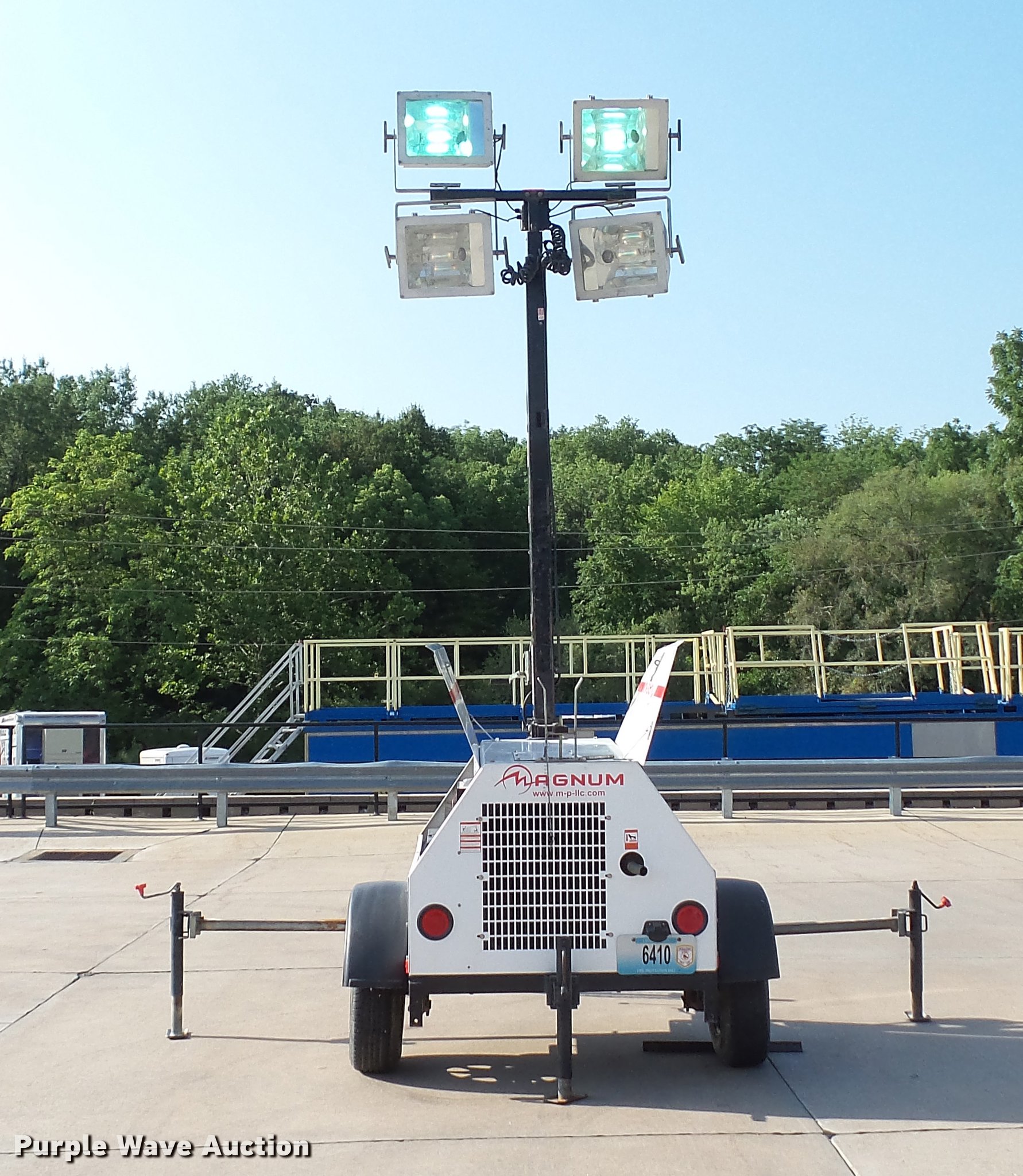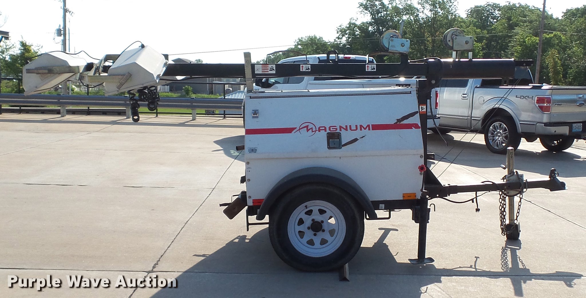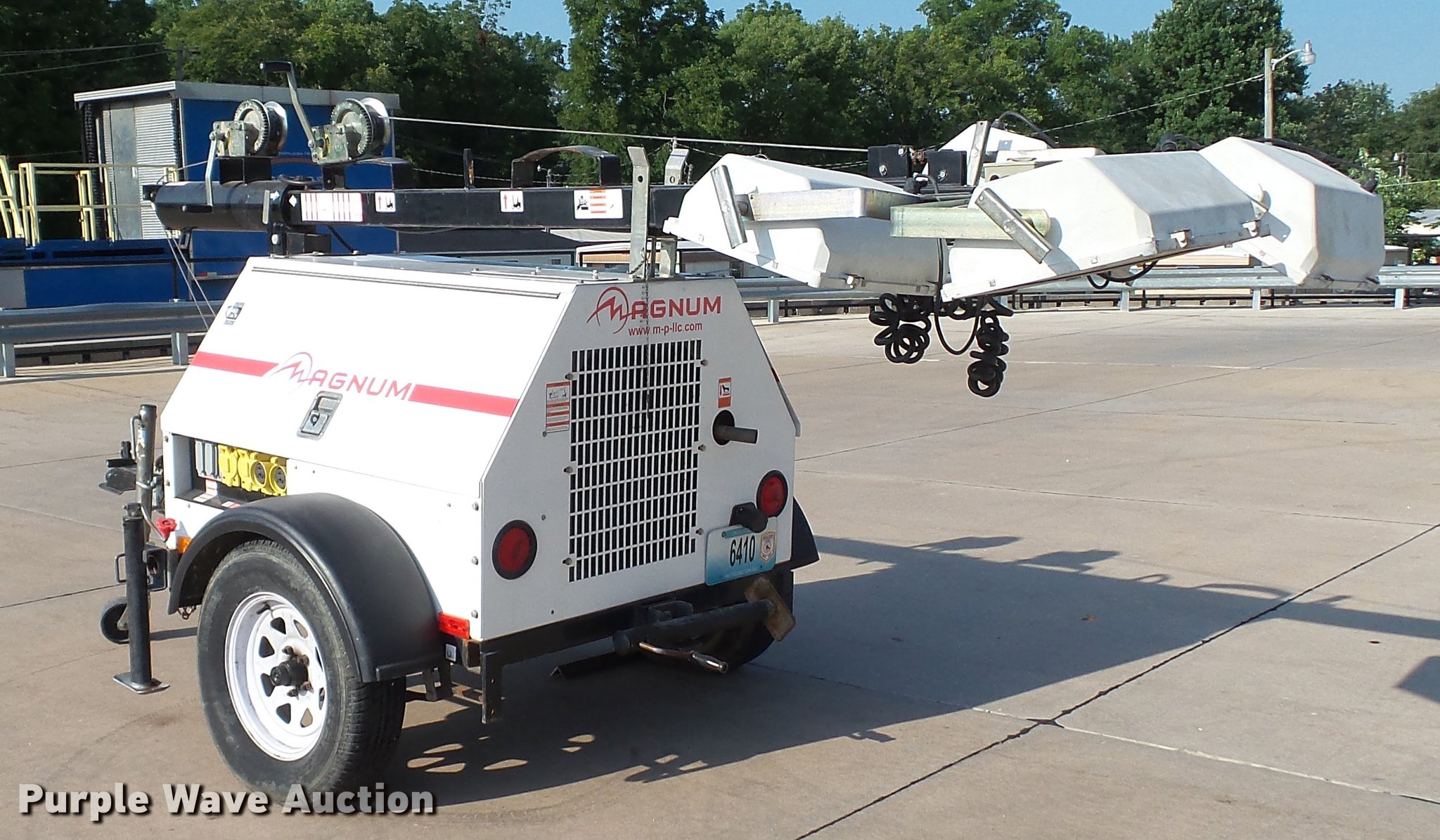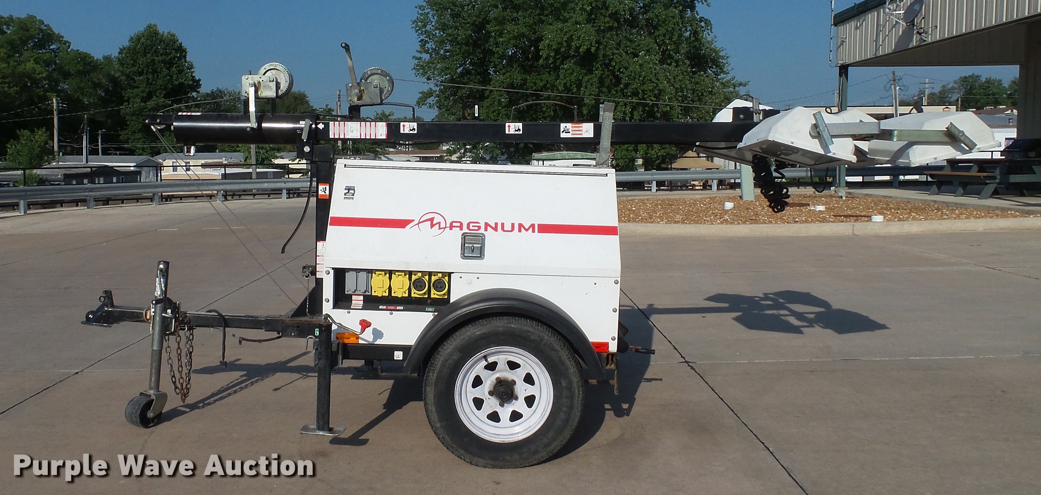 Purple Wave is selling a used Light Plant in Missouri. This item is a 2007 Magnum MLT4200 light plant with the following: 5,115 hours on meter, Isuzu 4LE1-PV05 2.2L four cylinder diesel engine, 31.5 HP, Marathon Electric 334CSA3028 generator, Control panel, 20 kVA, 20 kW, Single phase, 60 Hz, 120/240V, 167/83 amps, 56 gallon fwuel tank, Light plant, (4) bulbs, 1,000 watts, 30' tower height, Manual hoist, 2 5/16" ball hitch, (3) leveling jacks, P205/75R15 tires