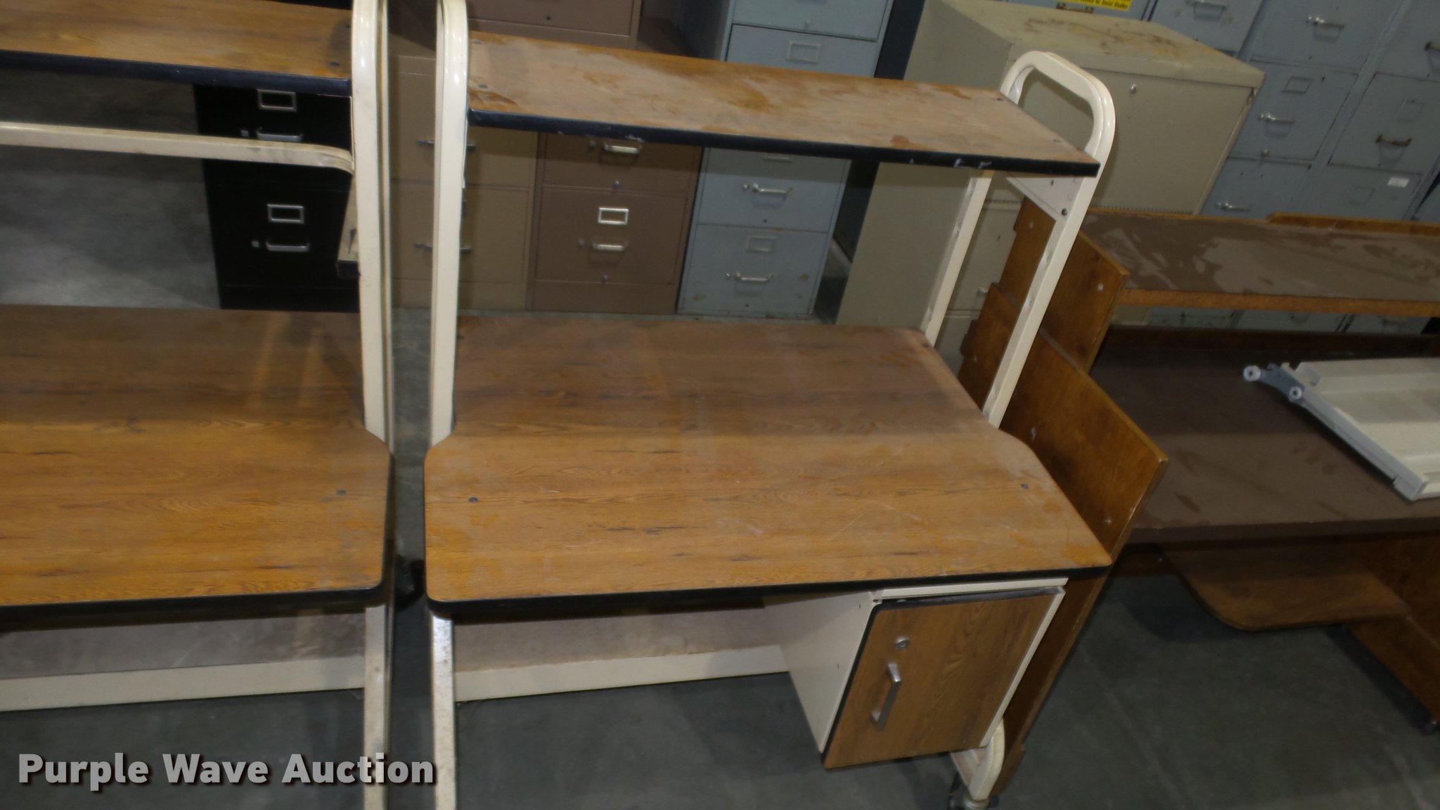 Purple Wave is selling a used Office Supplies and Equip. in Kansas. This item is a (4) computer carts with the following: Metal computer cart, (2) wood computer carts, Wood computer desk, Wheels, Printer cart, Smartboard