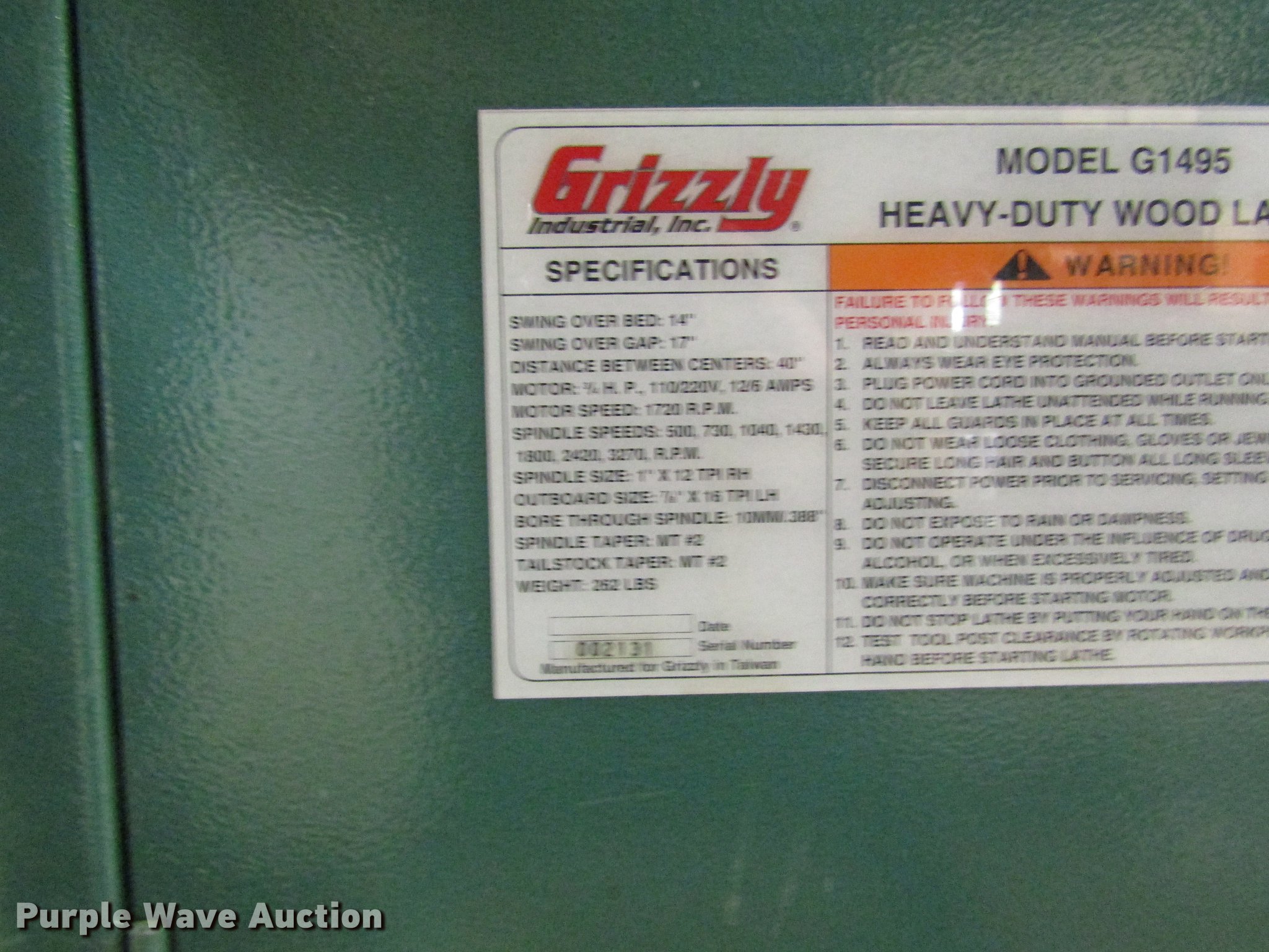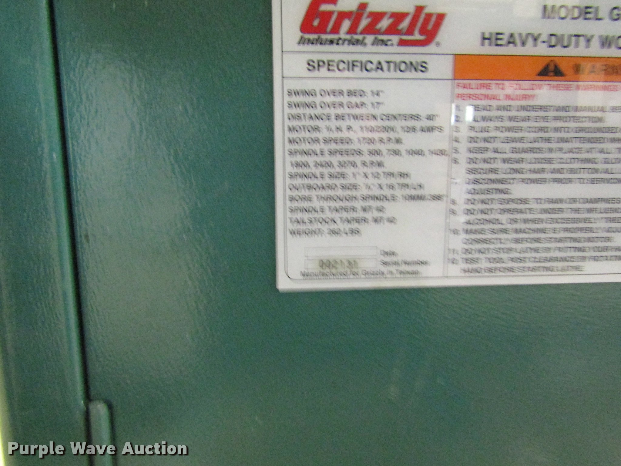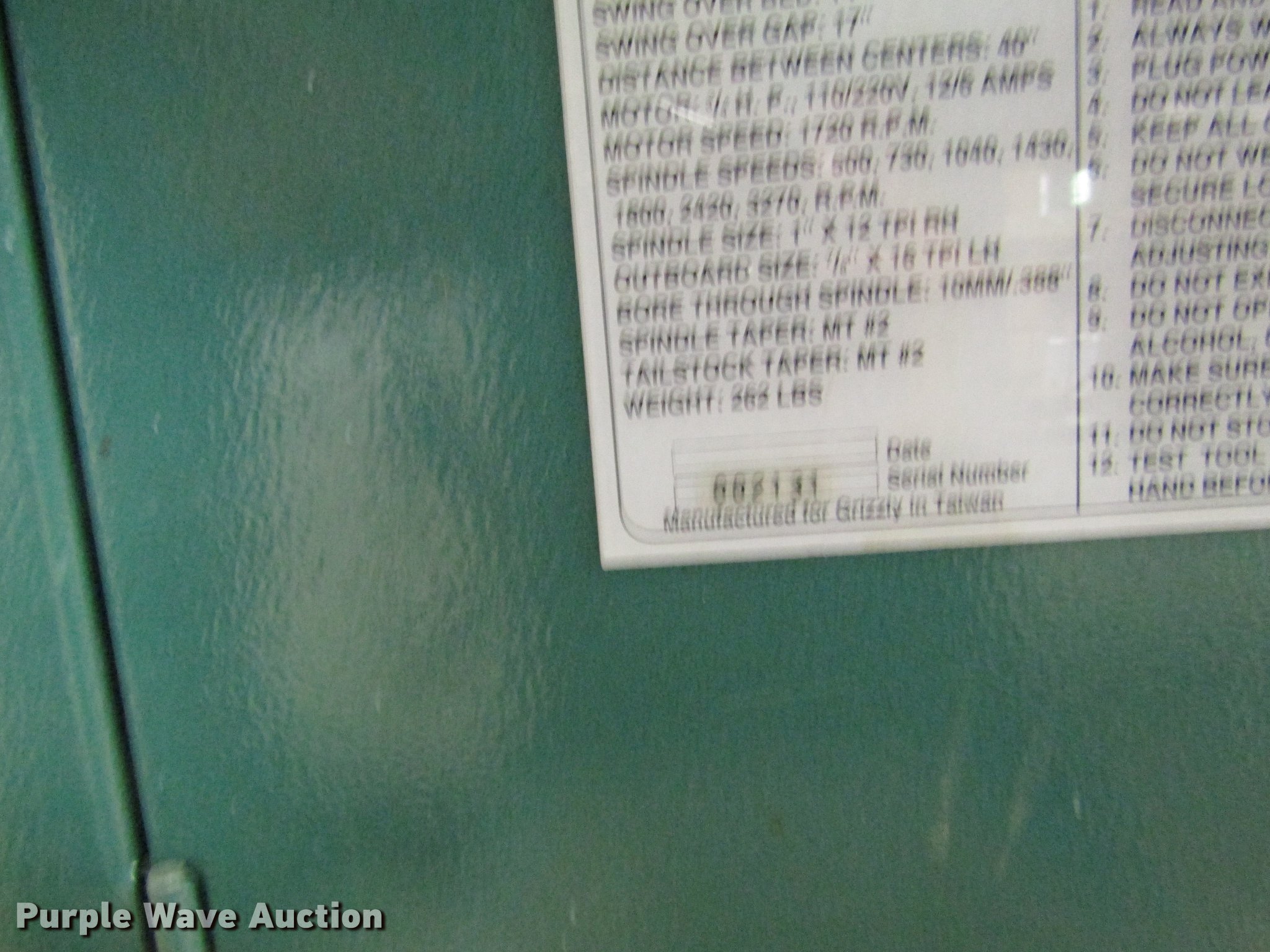 Purple Wave is selling a used Lathes, Manual in Kansas. This item is a Grizzly wood lathe with the following: 110/220V motor, 3/4 HP, 40" between centers, Serial 002131