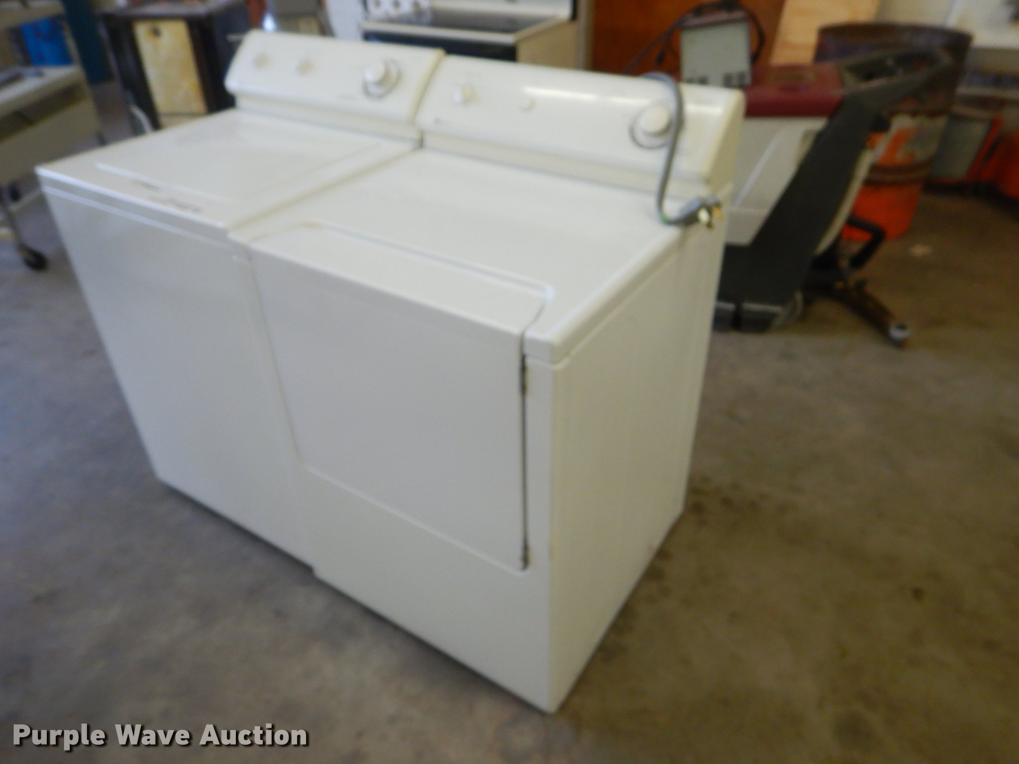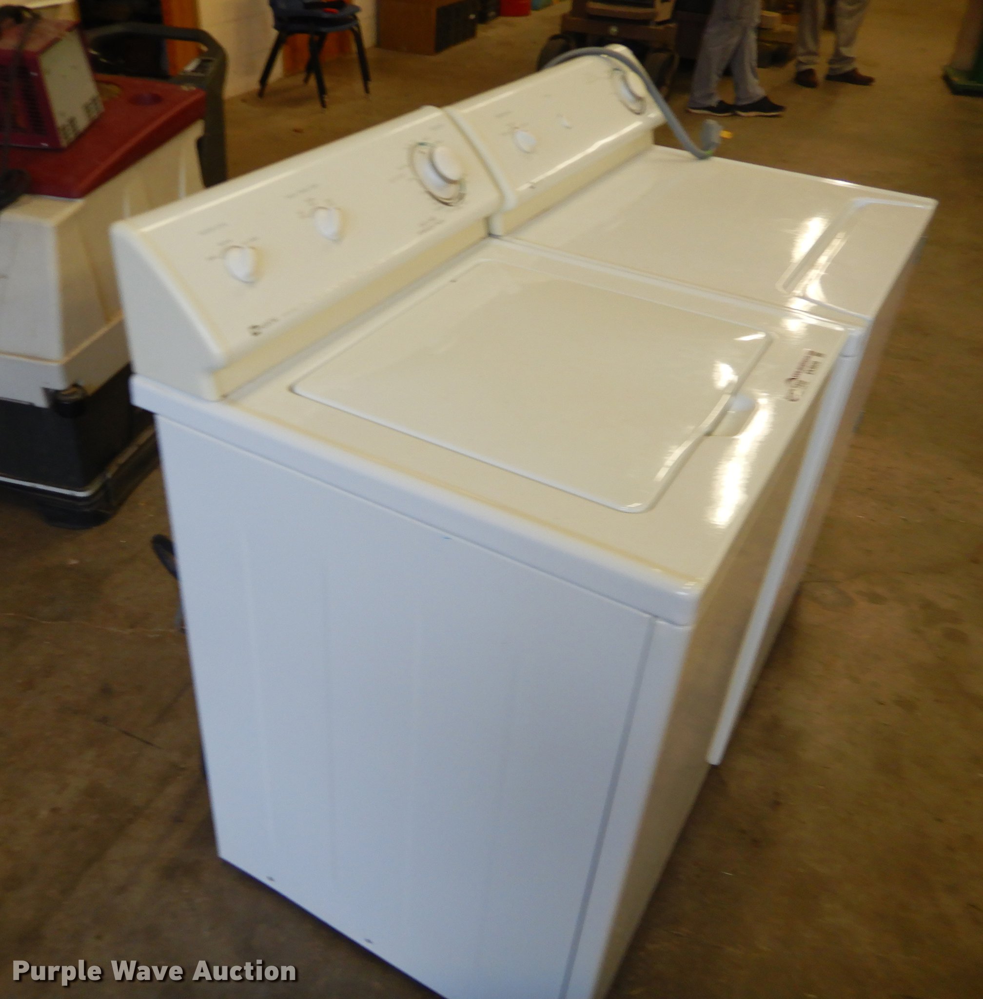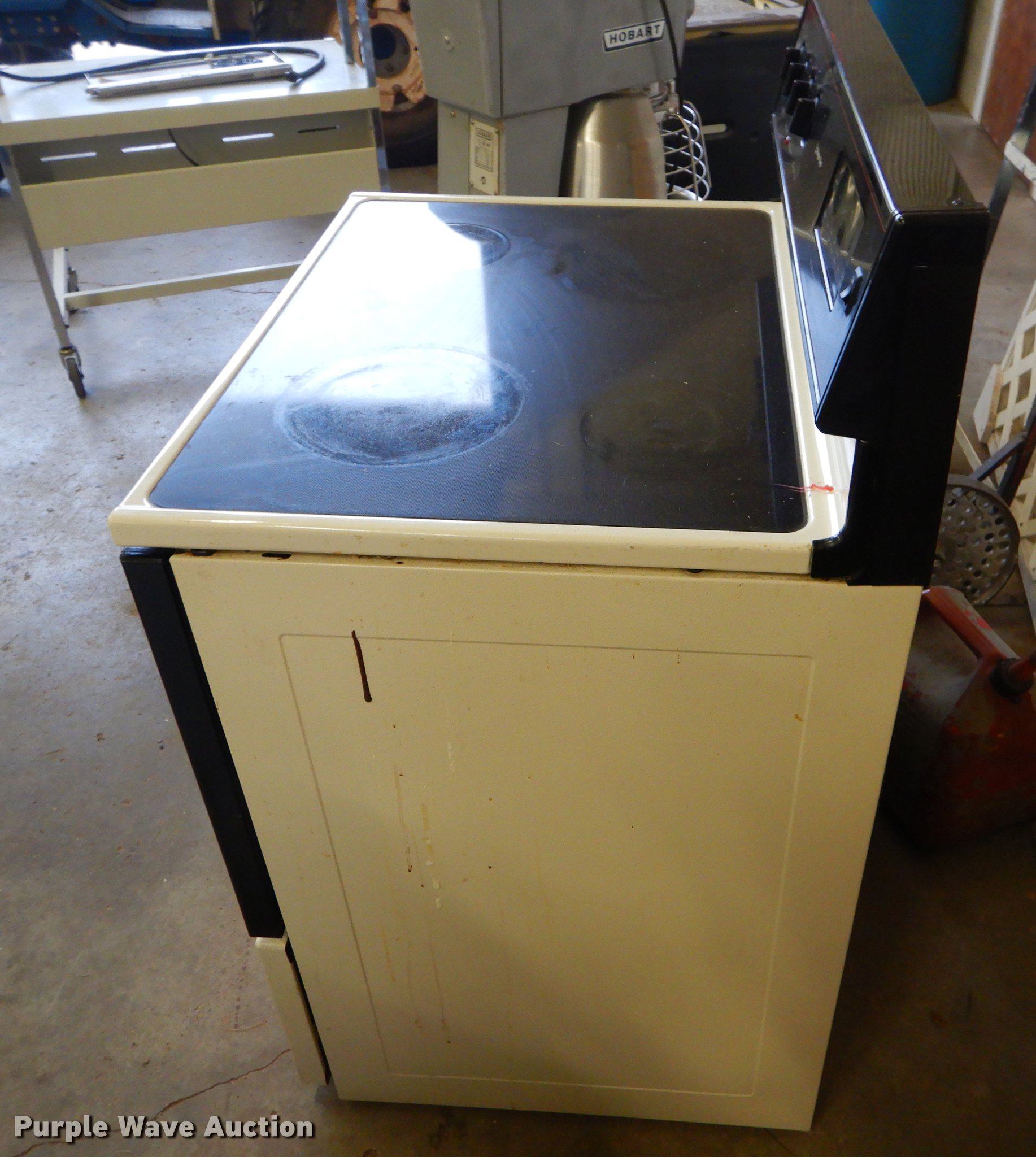 Purple Wave is selling a used Appliances in Kansas. This item is a Appliances with the following: Maytag LAT7306AAE washer and dryer set, Serial 23025800UB, Magic Chef electric range, Minuteman Auto Scrubber carpet cleaner, 20"W, Power supply, Hobart D300T mixer, Serial 31-1165-012, Laminex laminator, Kitchen Aid dishwasher