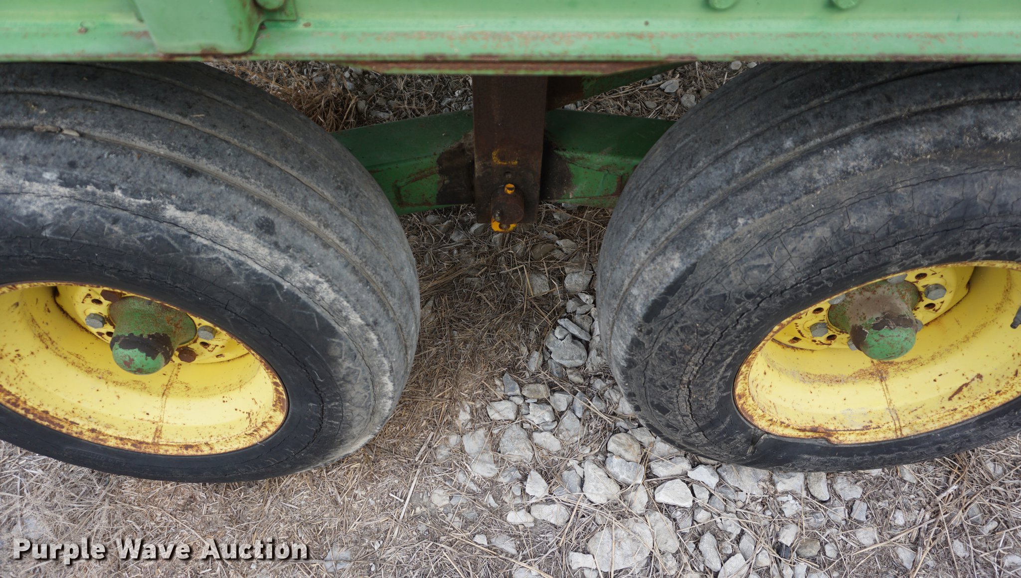 John Deere 716A silage wagon. 18'L x 82"W, (3) beaters, Telescoping tongue, 540 PTO, Pin hitch, Tandem rear axle, 12.5-15 tires, Serial B716A-013826W. Edgerton, KS 66021