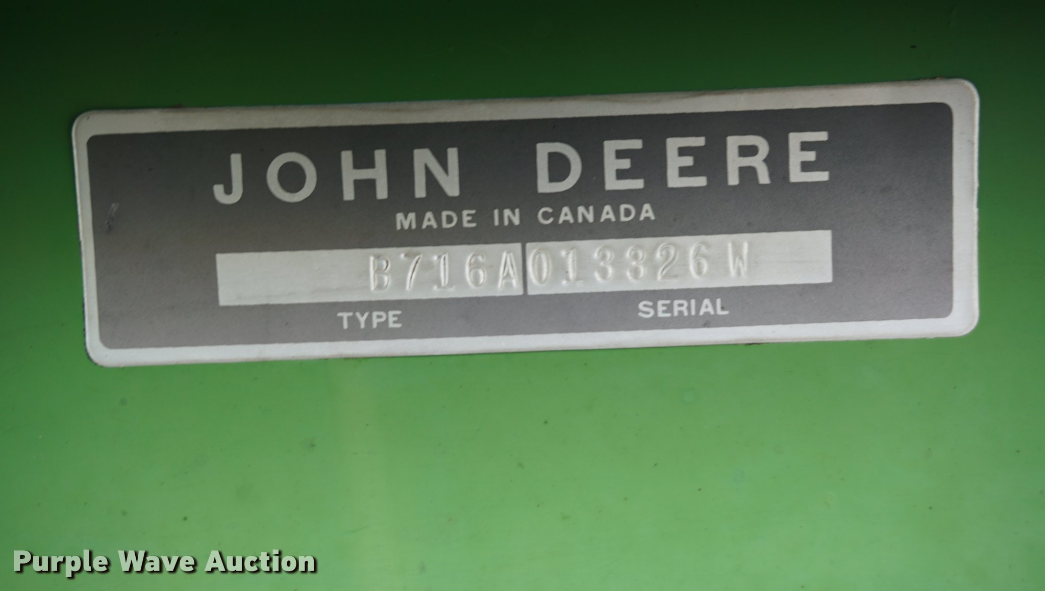 Purple Wave is selling a used Forage Head or Silage Handling in Kansas. This item is a John Deere 716A silage wagon with the following: 18'L x 82"W, (3) beaters, Telescoping tongue, 540 PTO, Pin hitch, Tandem rear axle, 12.5-15 tires, Serial B716A-013826W