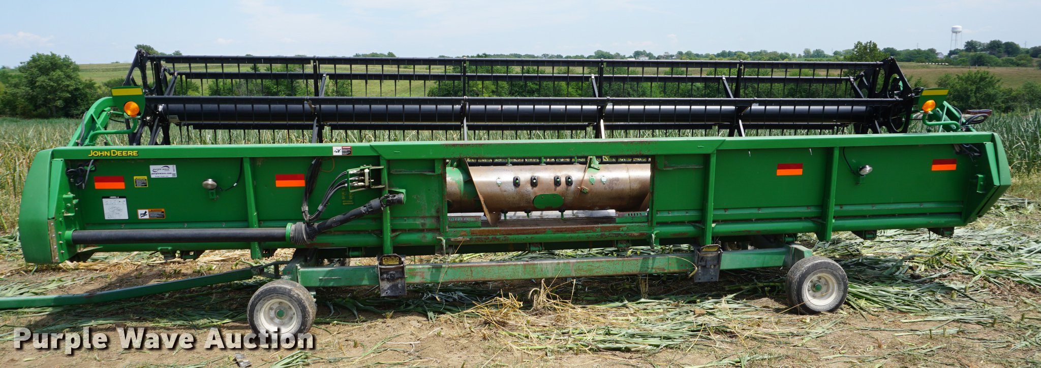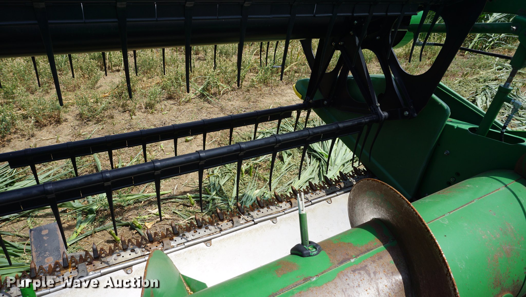 Purple Wave is selling a used Platform or Stripper Head in Kansas. This item is a John Deere 625F flex head with the following: 25'W, Finger reel, Hydraulic fore/aft, Hydraulic reel height control, Full finger auger, Poly skid plates, Single drive line, Single point hydraulic coupler, Stubble lights, Serial H00625F711534
