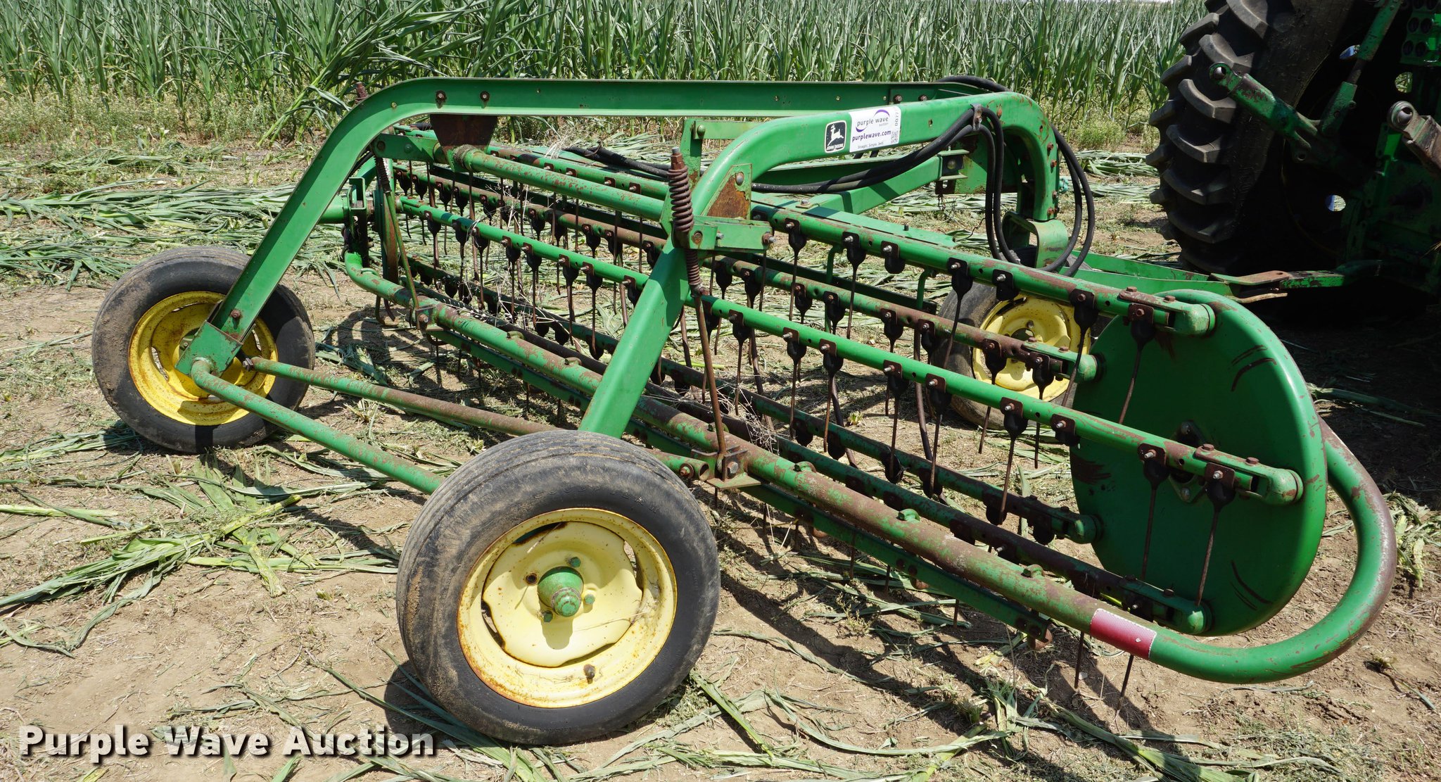 Purple Wave is selling a used Hay Rake in Kansas. This item is a John Deere 672 side delivery rake with the following: Hydraulic drive, Pin hitch, 25x7.50-15 tires, Front tire leaks, Serial F00672X915458