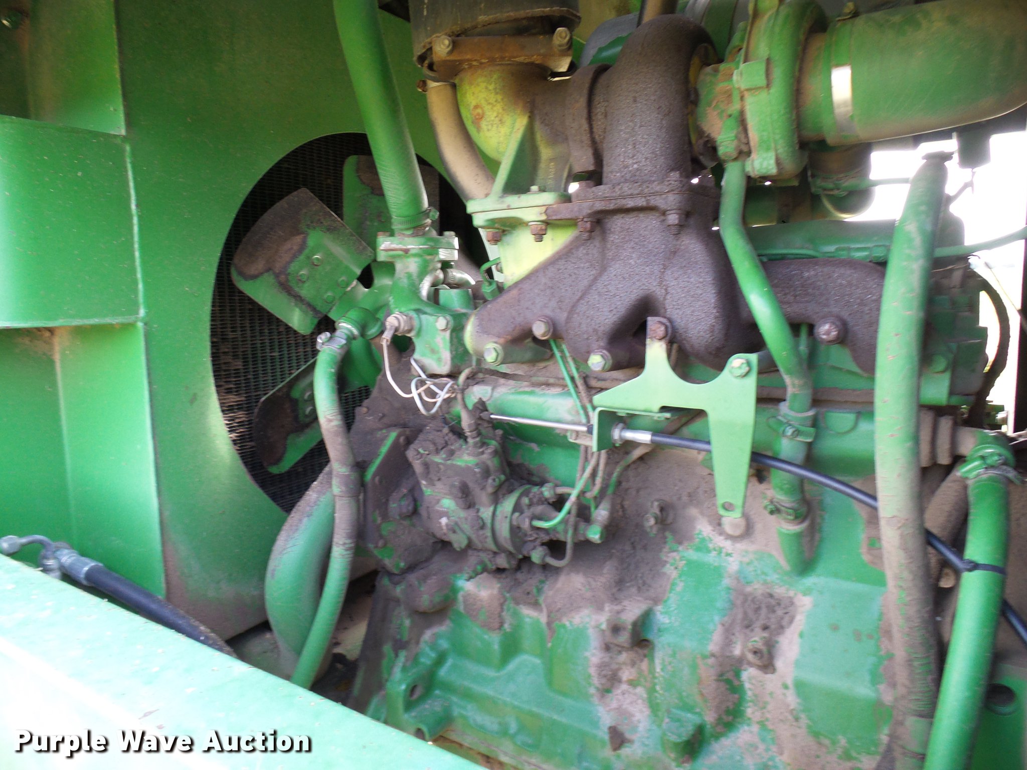 Purple Wave is selling a used Windrower Self Propelled in Kansas. This item is a 1994 John Deere 3830 windrower with the following: 3,065 engine hours on meter, John Deere 4039TE001 four cylinder turbo diesel engine, AC and heat, Tilt steering wheel, AM/FM, Air suspension seat, Work lights, 16'W sickle head, Hydraulic head tilt, Steel/steel conditioners, 18.4-28 front tires, 9.5-14 rear tires, Operator manual, AC needs charged, Approx 20 hours on rebuilt header, Serial E03830X978913