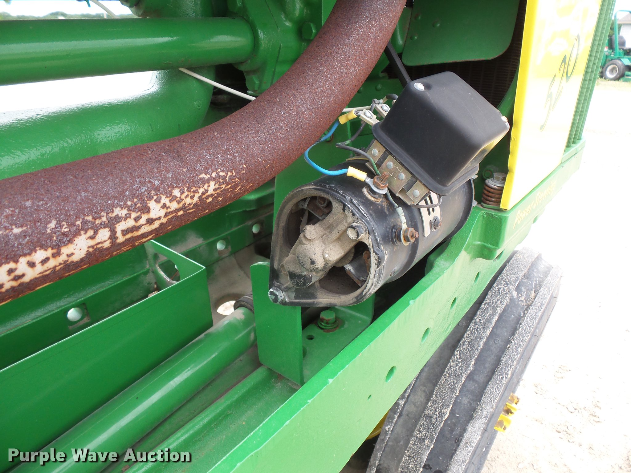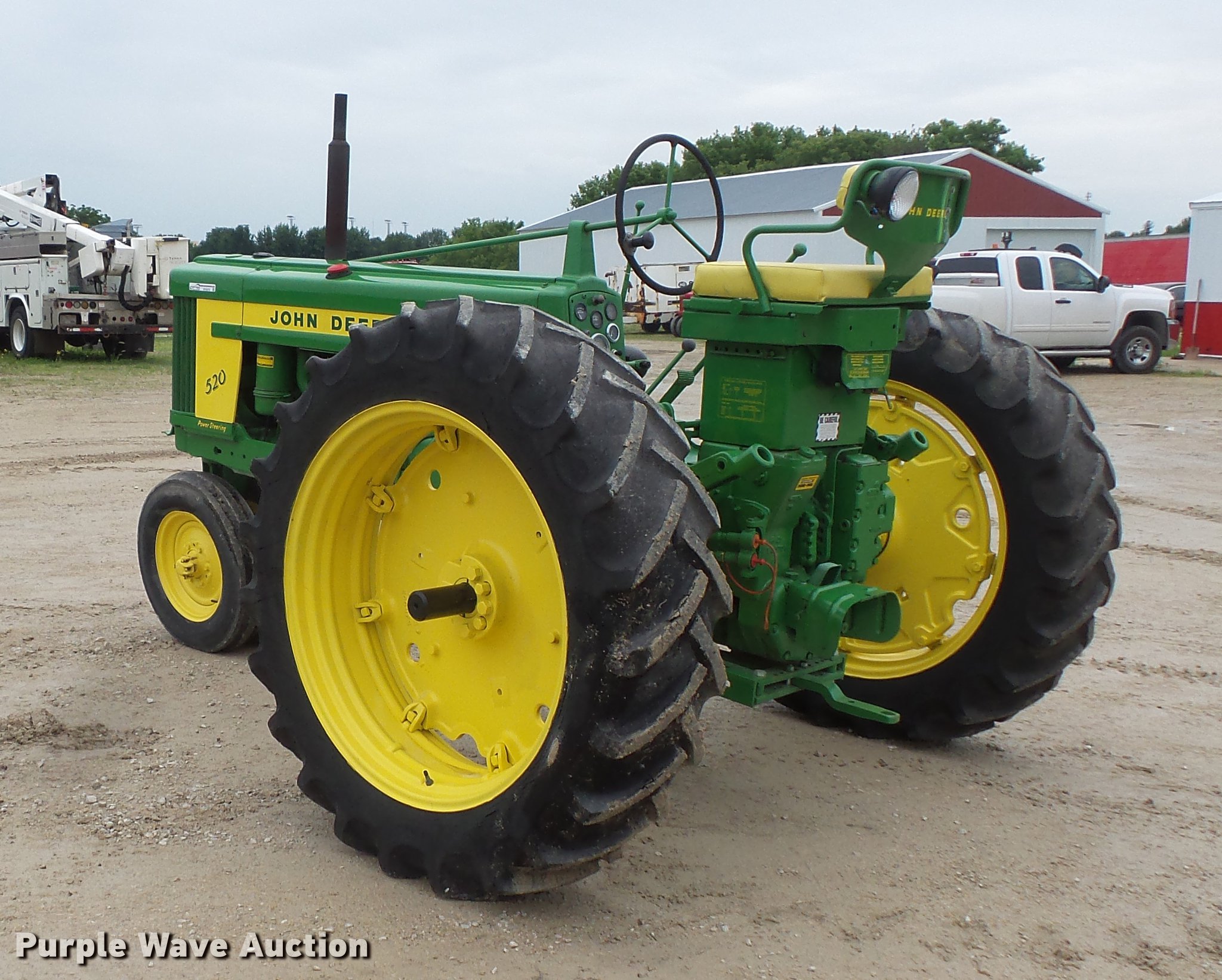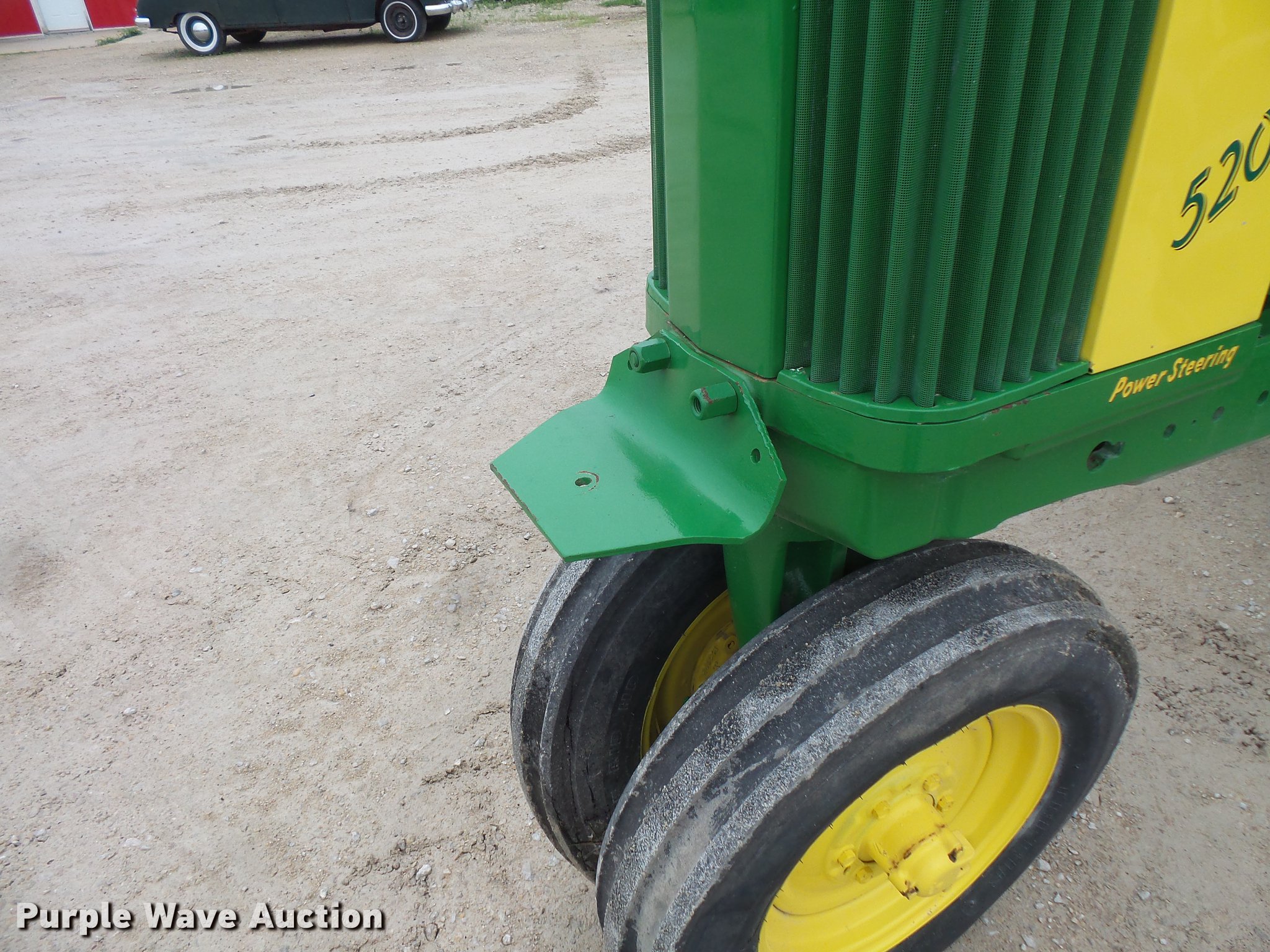 Purple Wave is selling a used Tractor in Minnesota. This item is a John Deere 520 tractor with the following: John Deere two cylinder gas engine, Manual transmission, 6F-1R gears, Power steering, Front blade, Three point, No arms, 540 PTO, Rear hydraulic remote set, 6.00-16 front tires, 13.9-36 rear tires, Serial 5207893