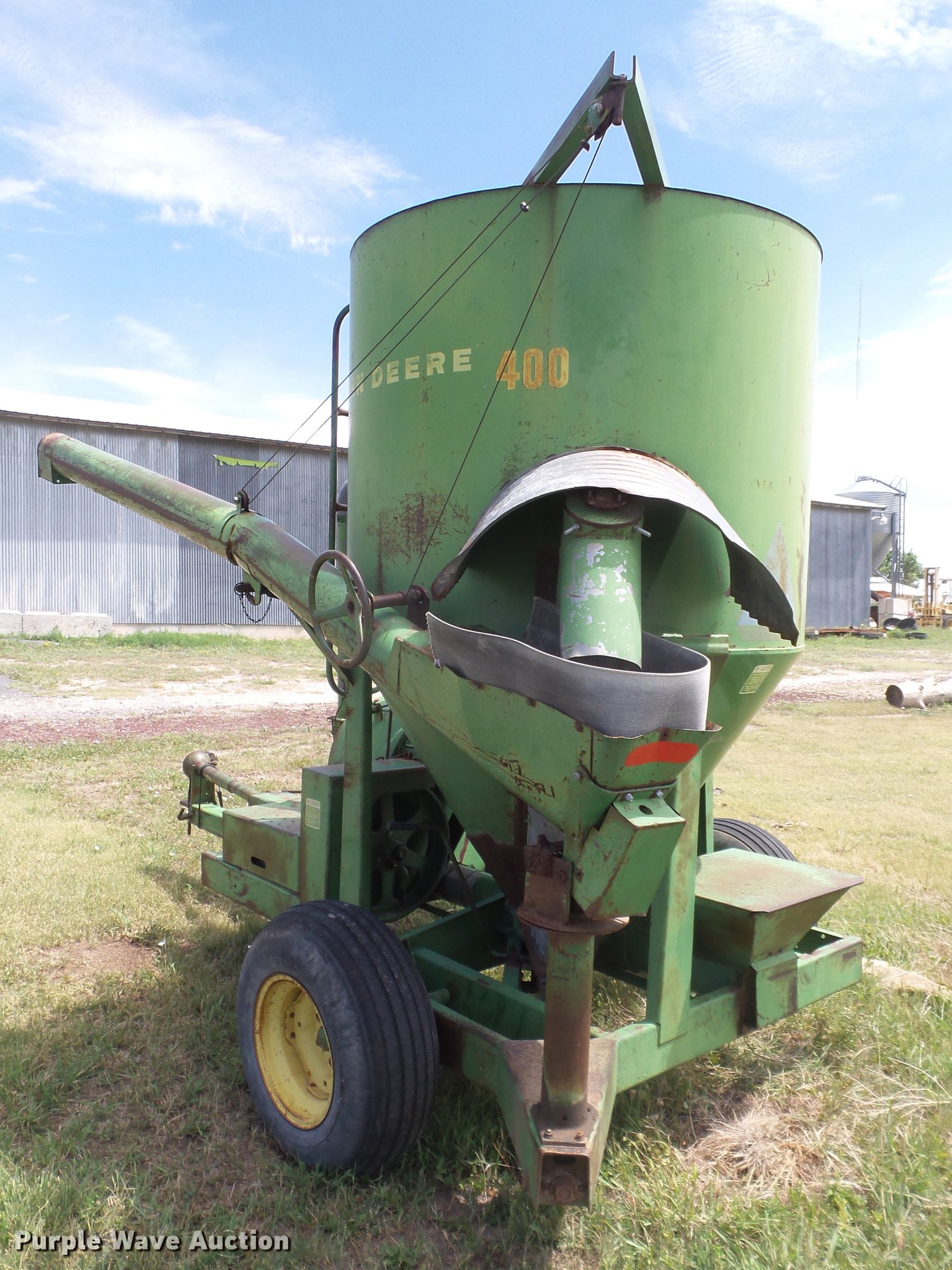 Purple Wave is selling a used Feed Mixer or Bale Processor in New Mexico. This item is a John Deere 400 tub grinder with the following: Chain and belt drive, 540 PTO, Clevis hitch, 9L-15 tires