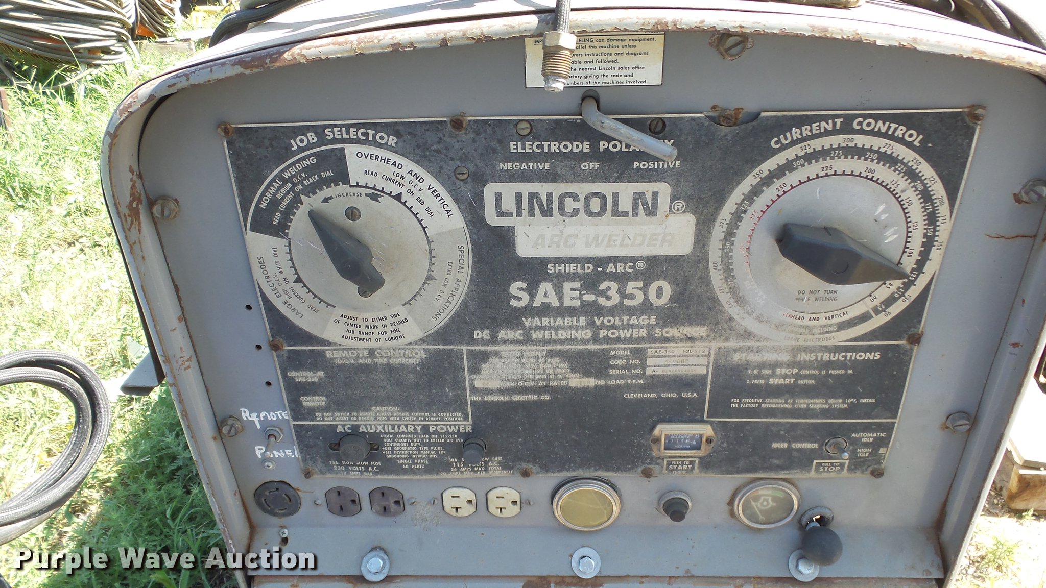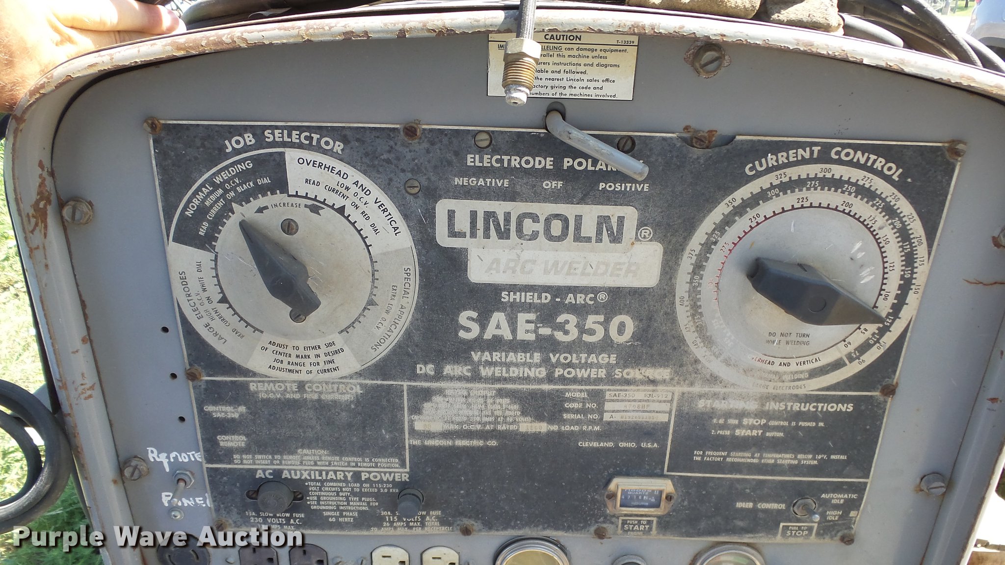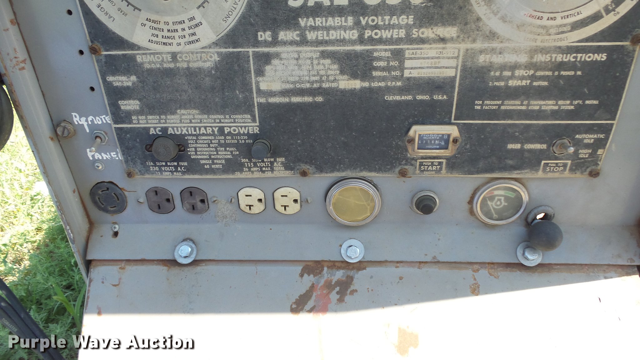 Purple Wave is selling a used Welder (Manual) in Kansas. This item is a Lincoln SAE-350 arc welder with the following: 4,716 hours on meter, Three cylinder diesel engine, Remote control, Approx. 68" x 26" x 39"H, Serial U1920901834