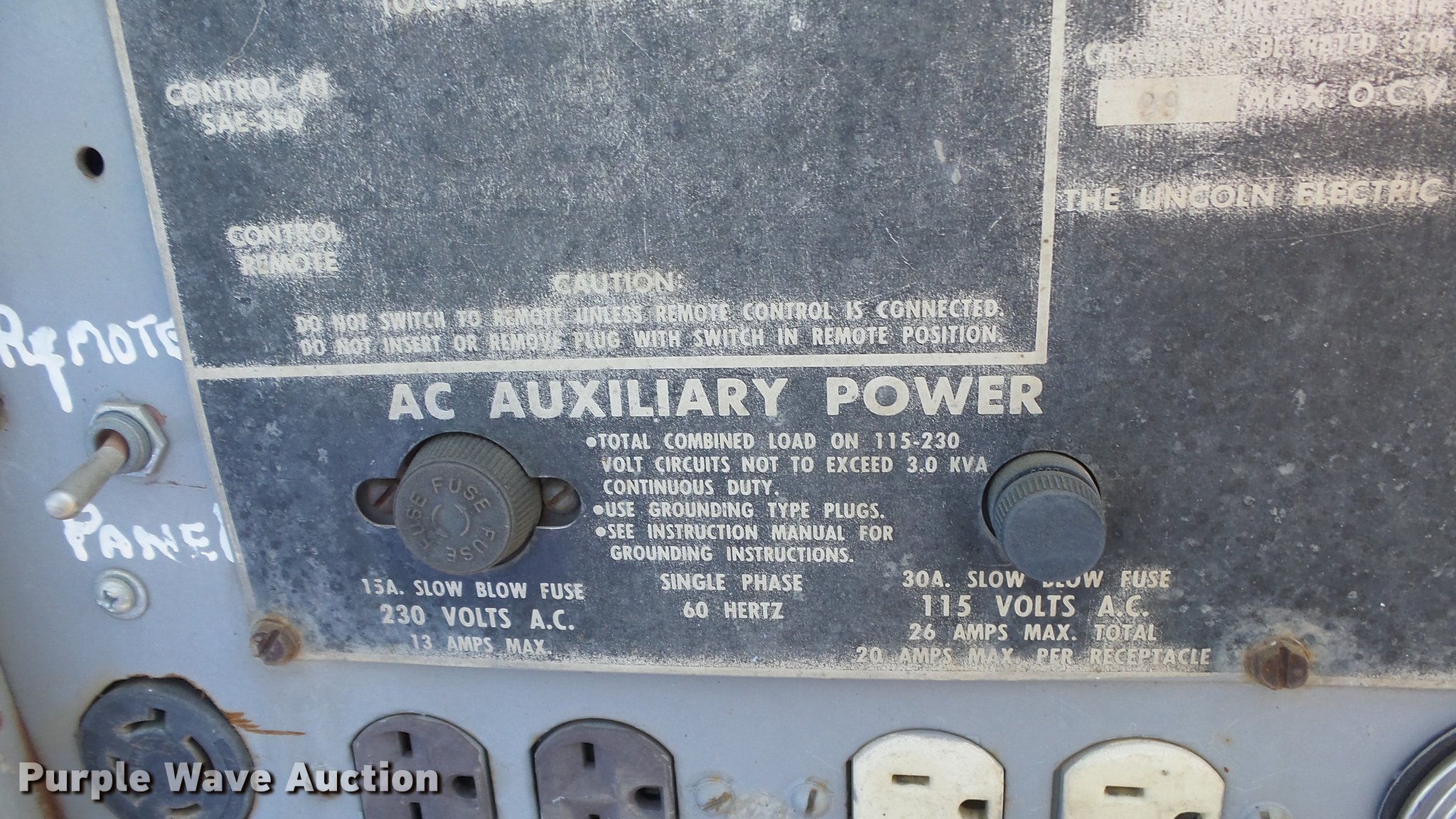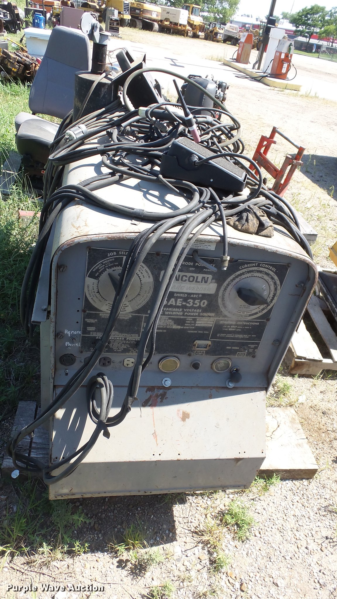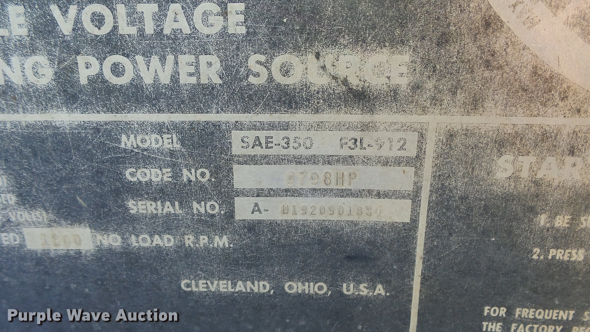 Purple Wave is selling a used Welder (Manual) in Kansas. This item is a Lincoln SAE-350 arc welder with the following: 4,716 hours on meter, Three cylinder diesel engine, Remote control, Approx. 68" x 26" x 39"H, Serial U1920901834