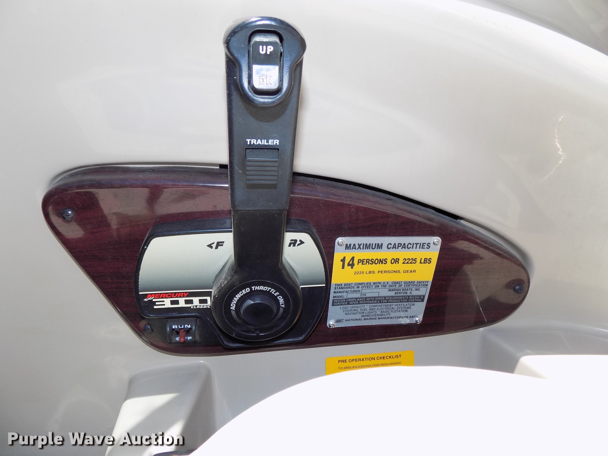 Purple Wave is selling a used Boat in Nebraska. This item is a 2000 Mariah Jubilee 214 deck boat with the following: 209 hours on meter, 21.5'L, Mercury Mercruiser MCM 5.0L V8 gas engine, Serial 0L625857, Bravo three twin prop, 14 person or 2,225 lbs capacity, Boss AM/FM/CD, Removable face plate, (2) keys, On-board sink and toilet, Boat accessories and supplies, Master shut-off, Transom, Serial 0L820387, Operators manual, No battery, Hull ID US-MAB19556L900, 2000 Heritage KB22T1-44 trailer, Manual winch, 2" ball hitch, Single jack stand, Trailer wiring, Spring suspension, Surge brakes, Tandem axle, Five bolt aluminum wheels, ST215/75R14 tires, GVWR 5,500 lbs