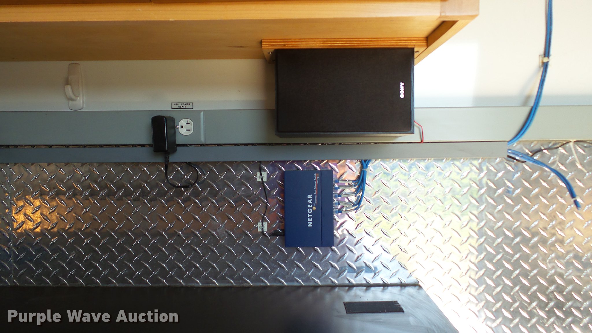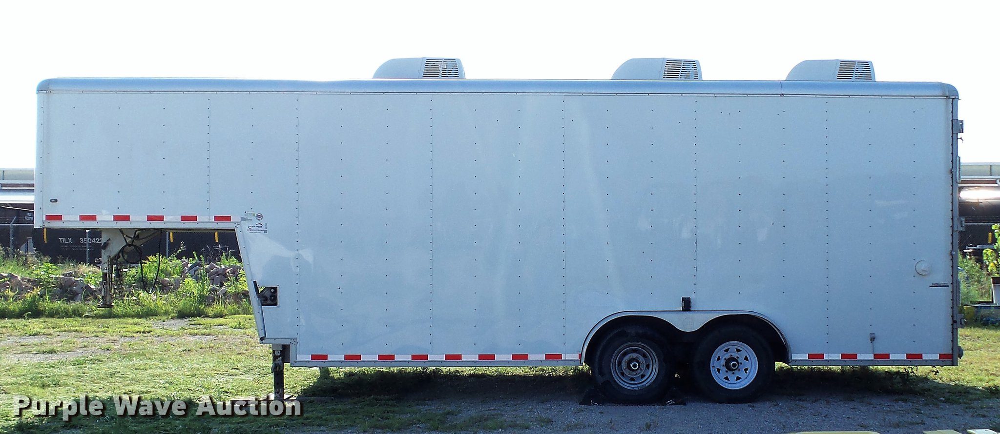 2011 Wells Cargo CVG2825 enclosed cargo trailer. 28'L x 96"W , Aluminum deck, Swing-our rear door, Right side entry door, Cabinets, Interior lighting, (3) Coleman-Mach roof mounted AC units, 750 watt power inverter, GE refrigerator, GE microwave, Sony AM/FM, Eaton Ferrups FE series power supply backup, Square D three phase transformer, Gooseneck hitch, Dual leg two speed landing gear, Torsion axle suspension, Electric brakes, ST235/80R16 tires, GVWR 14,700 lbs, GAWR 6,000 lbs. Missouri title. 1WC200N20B2021664. Tinuum Services LLC. Granite City, IL 62040