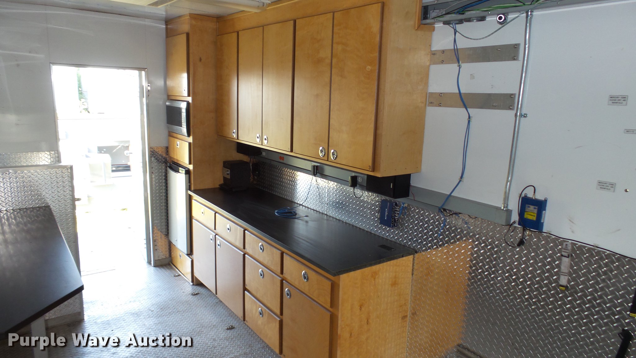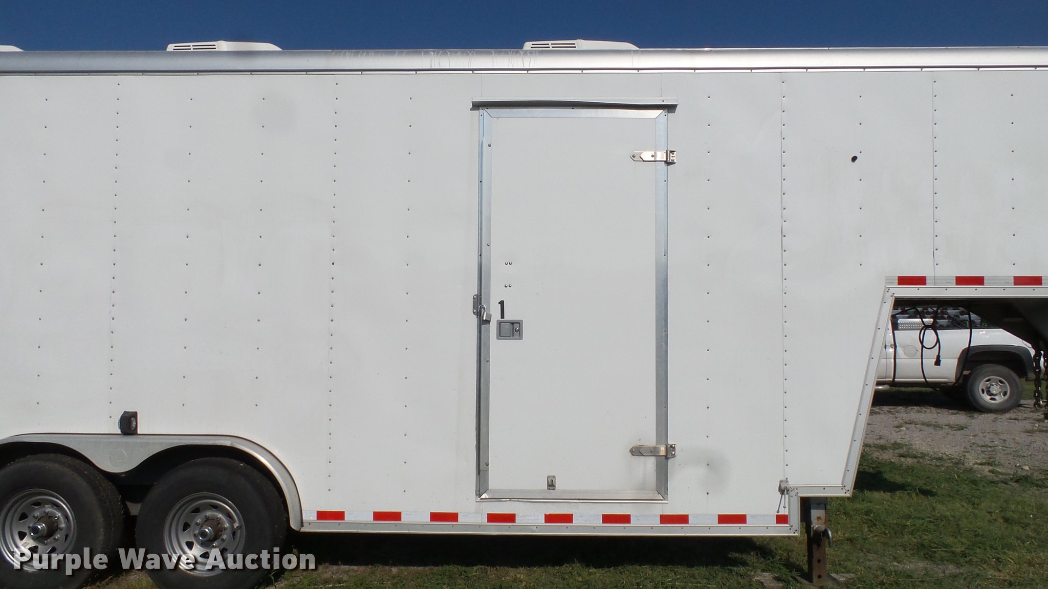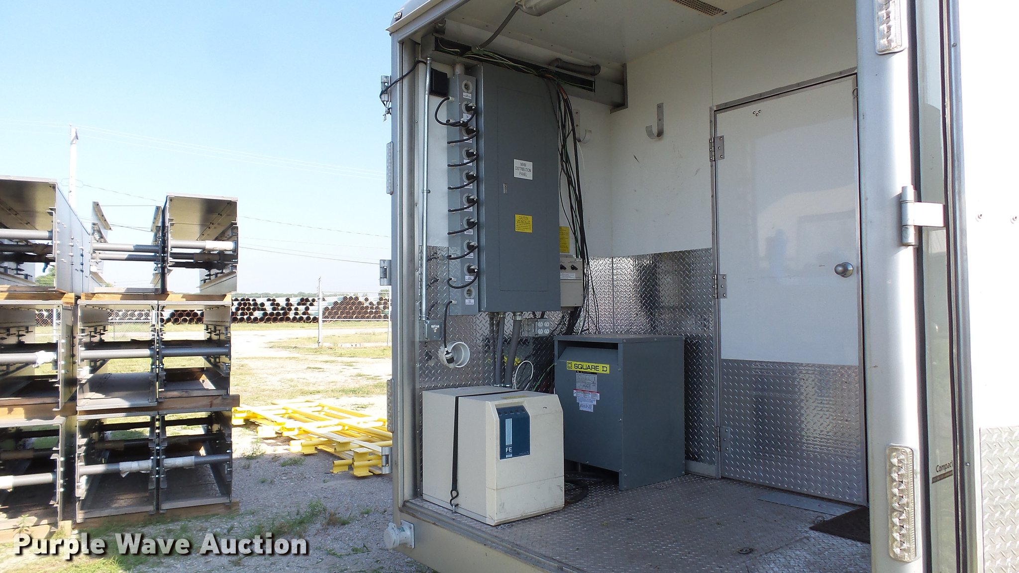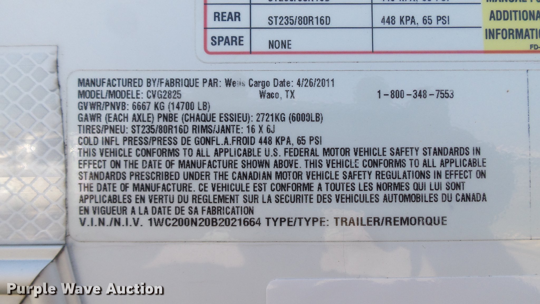 Purple Wave is selling a used Enclosed Cargo Trailer in Illinois. This item is a 2011 Wells Cargo CVG2825 enclosed cargo trailer with the following: 28'L x 96"W, Aluminum deck, Swing-our rear door, Right side entry door, Cabinets, Interior lighting, (3) Coleman-Mach roof mounted AC units, 750 watt power inverter, GE refrigerator, GE microwave, Sony AM/FM, Eaton Ferrups FE series power supply backup, Square D three phase transformer, Gooseneck hitch, Dual leg two speed landing gear, Torsion axle suspension, Electric brakes, ST235/80R16 tires, GVWR 14,700 lbs, GAWR 6,000 lbs