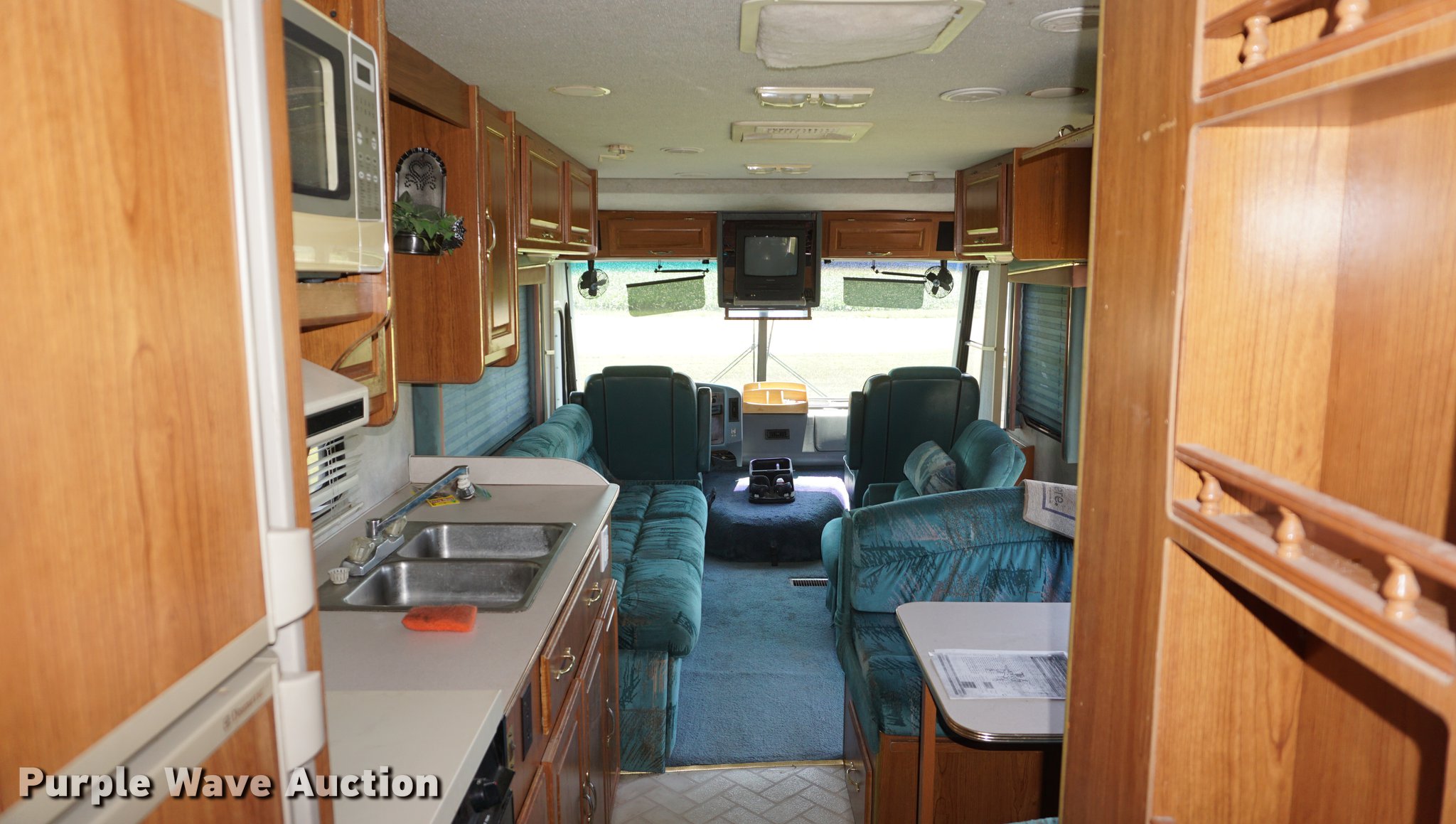 Purple Wave is selling a used RV in Kansas. This item is a 1996 Chevrolet Coachmen Catalina RV with the following: 75,909 miles on odometer, 7.4L V8 OHV 16V gas engine, Automatic transmission, Awning, Kitchen, Sink, Refrigerator/freezer, Oven, Propane stove, Table, Living room, Couch, Bathroom, Bedroom, Double bed, Television, Heater, Onan Microlite generator, 540 hours on meter, Gas engine, 4,000 watts, 225/70R19.5 tires, Manuals