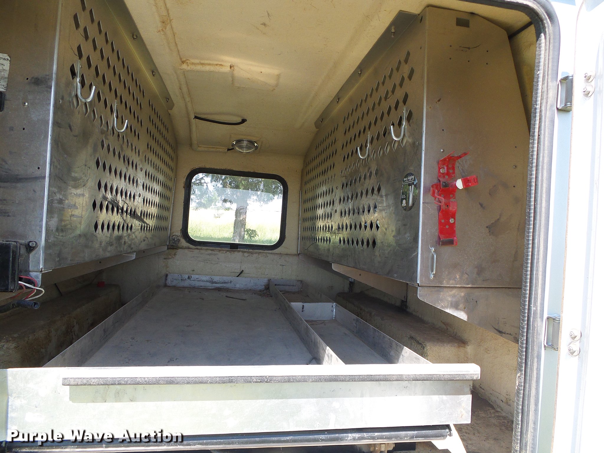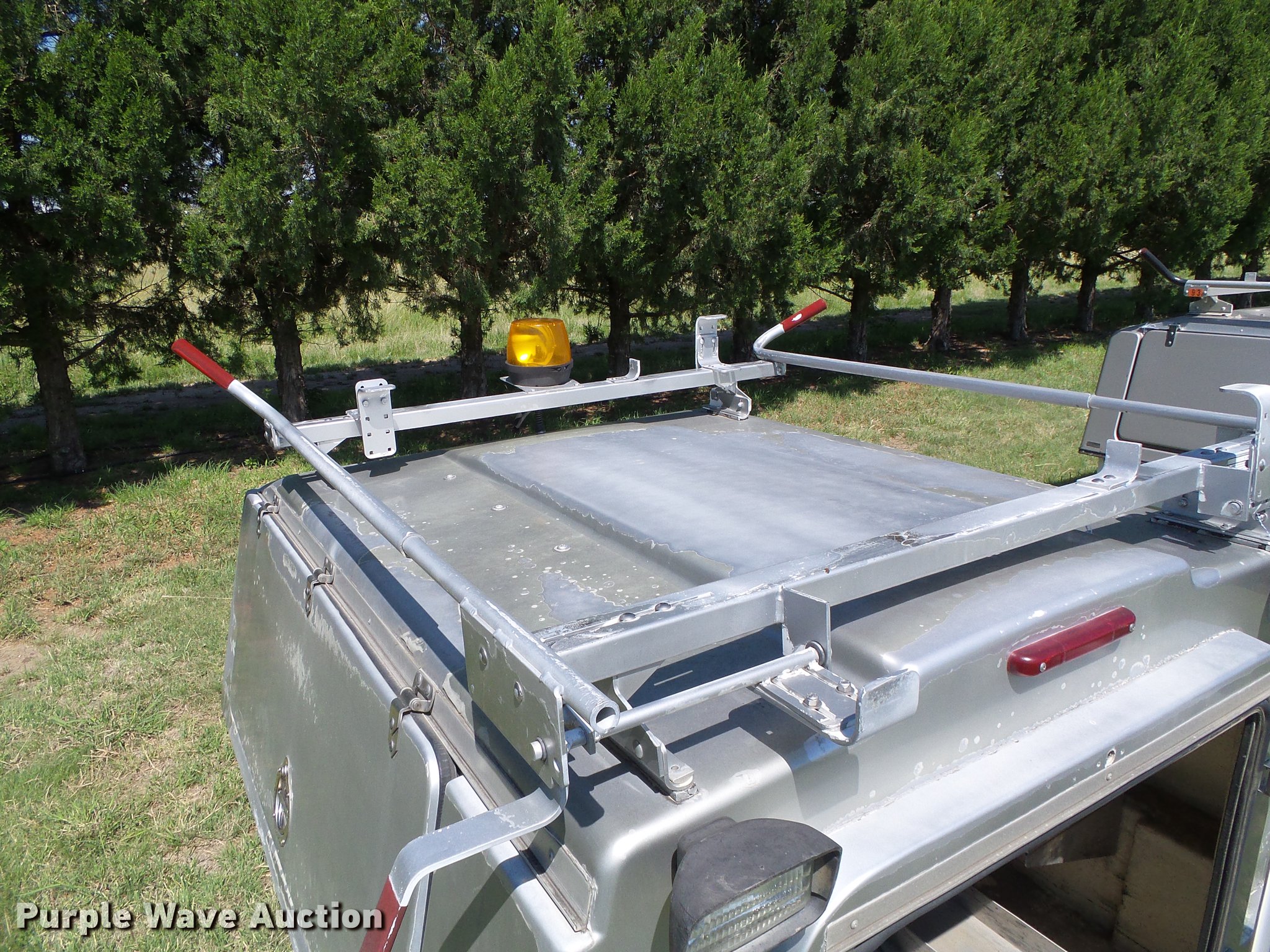 Fibre Body fiberglass topper. Weatherguard utility rack, Center sliding tray, Side compartments, Rear work lights, Interior lighting, Clear coat peeling, Serial 329D2, Unit# 18. Pioneer Communications. 465 S Rd I. Ulysses, KS 67880