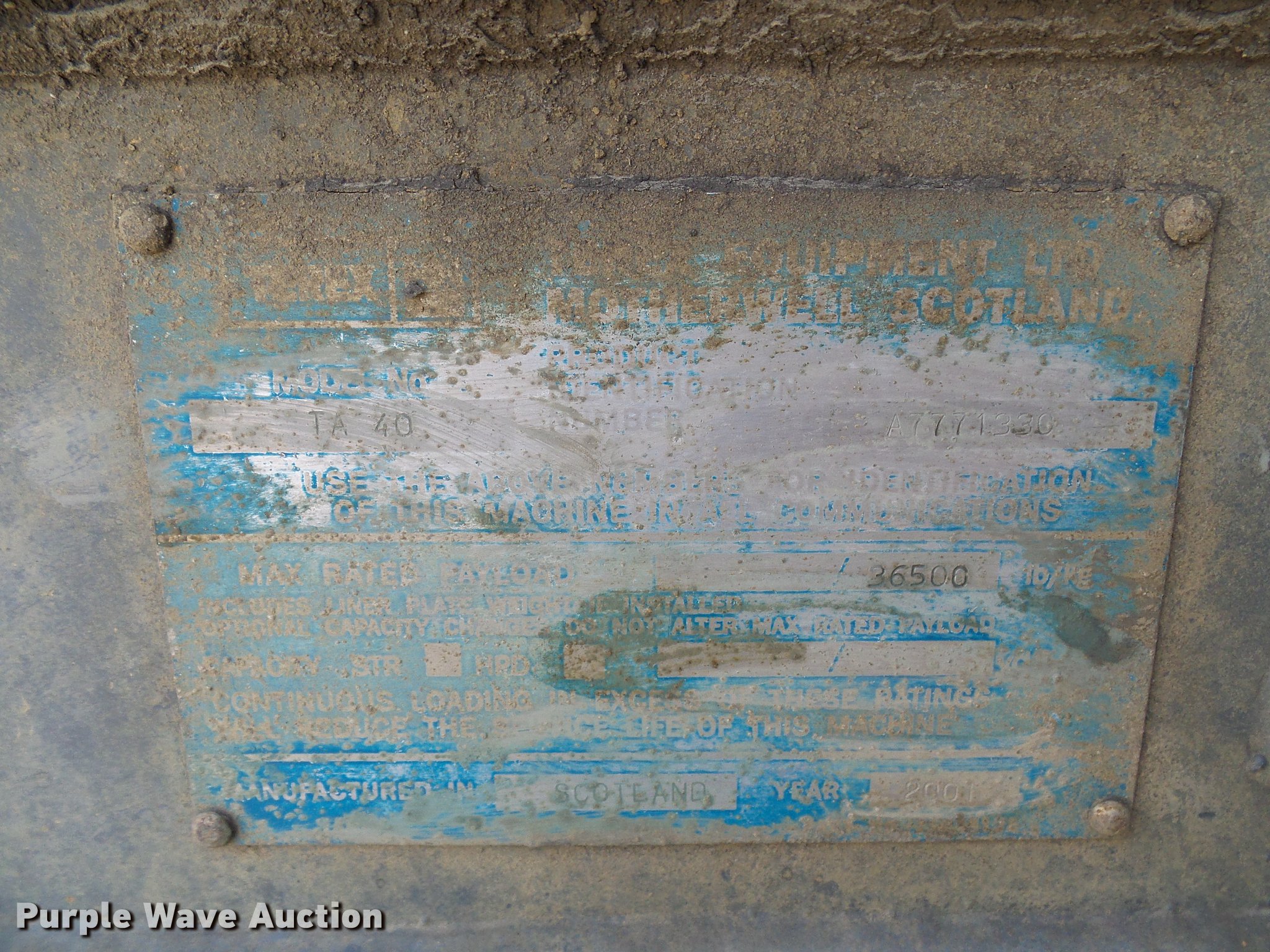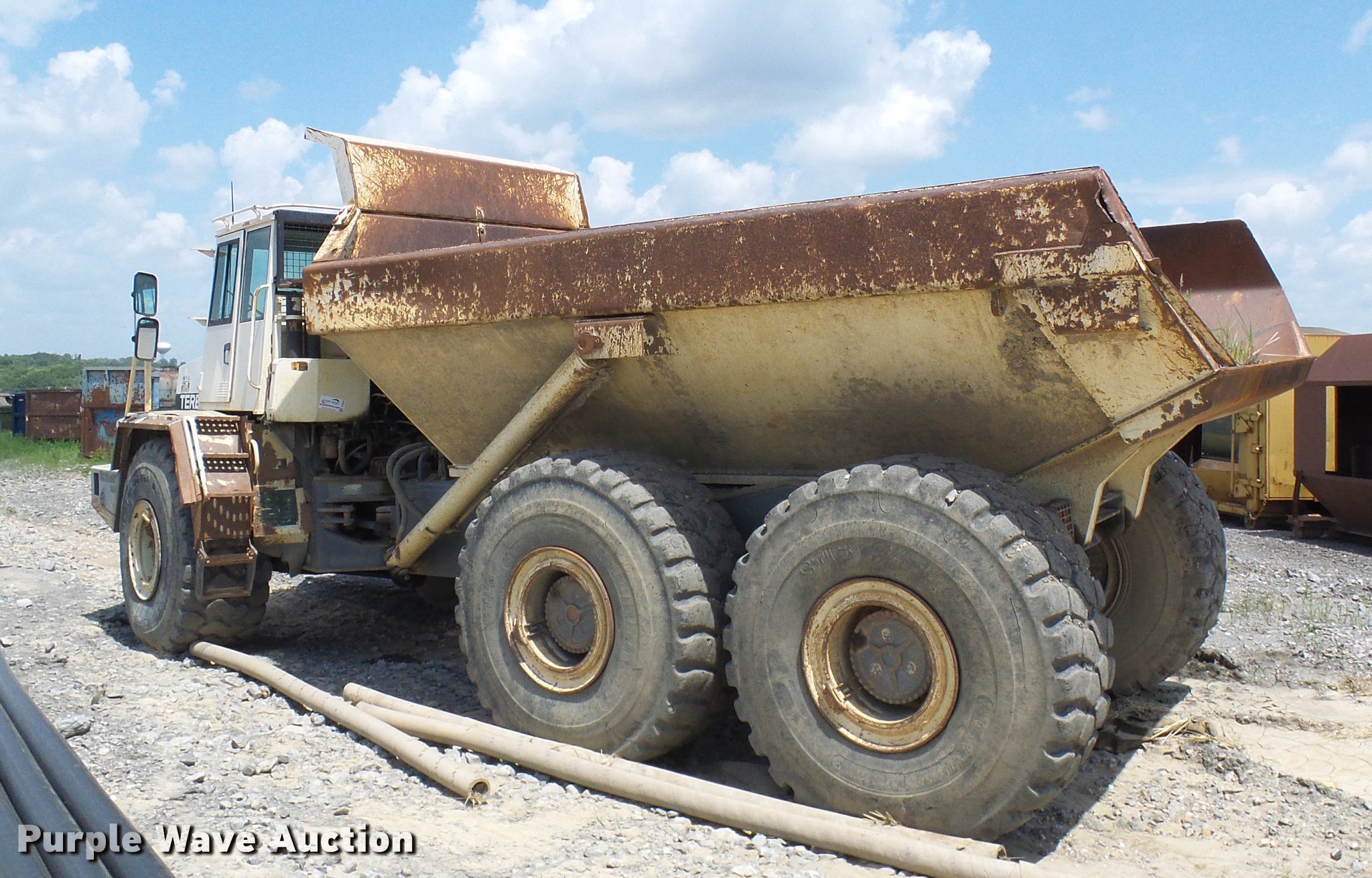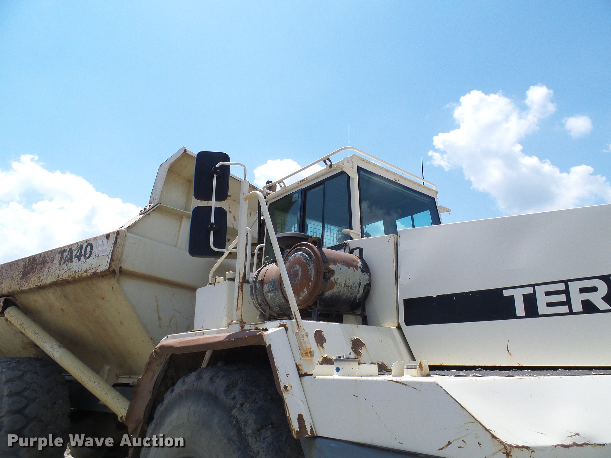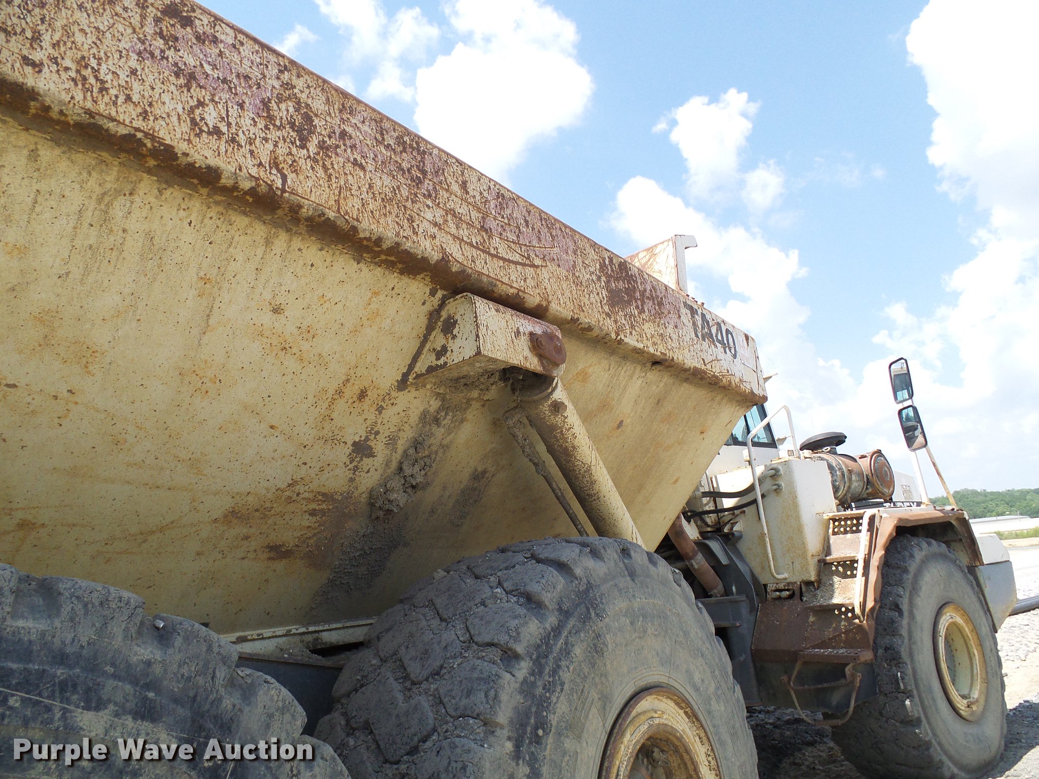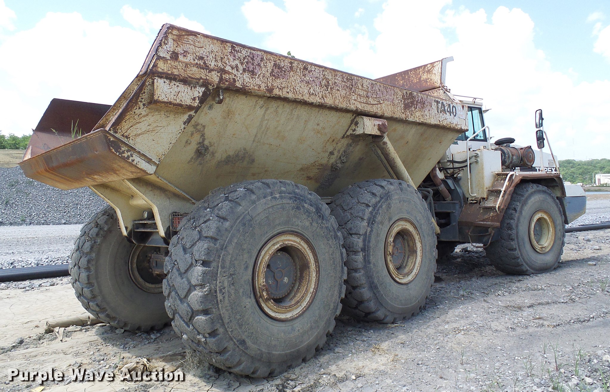 Purple Wave is selling a used Articulated Haul Truck in Missouri. This item is a 2001 Terex TA40 articulated haul truck with the following: 21 hours on meter, Detroit Diesel six cylinder turbo diesel engine, Automatic transmission, Six wheel drive, Suspension seat, Instructor's seat, 17'L dump bed, 36,500 lbs payload capacity, 29.5R25 tires, Third gear inoperable, Serial A7771330