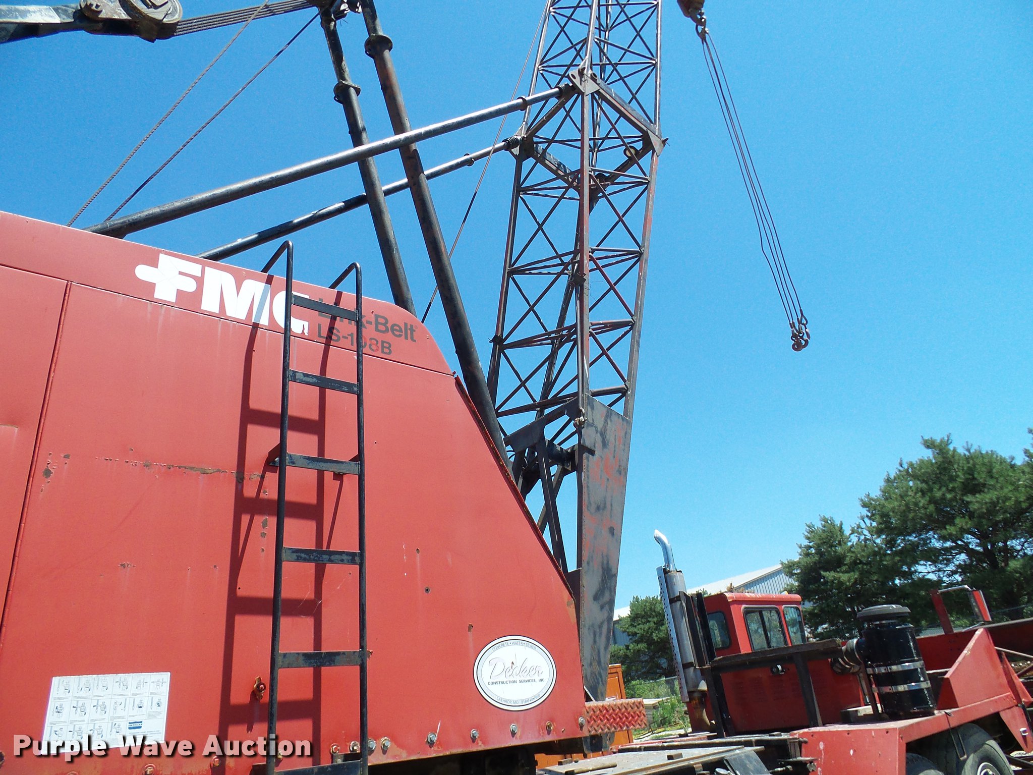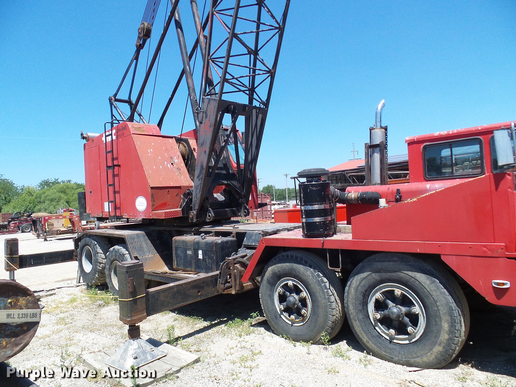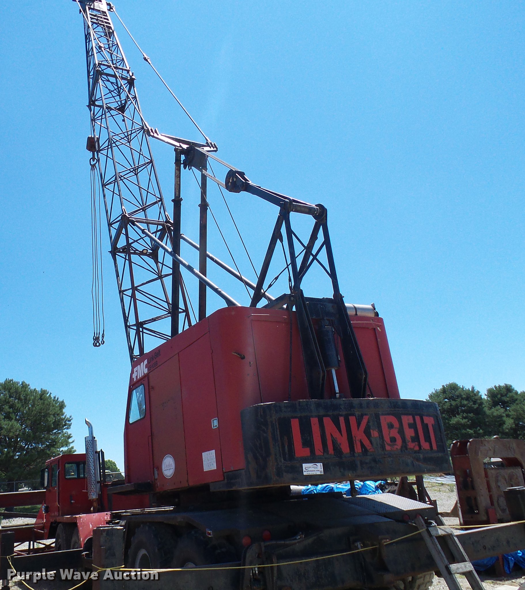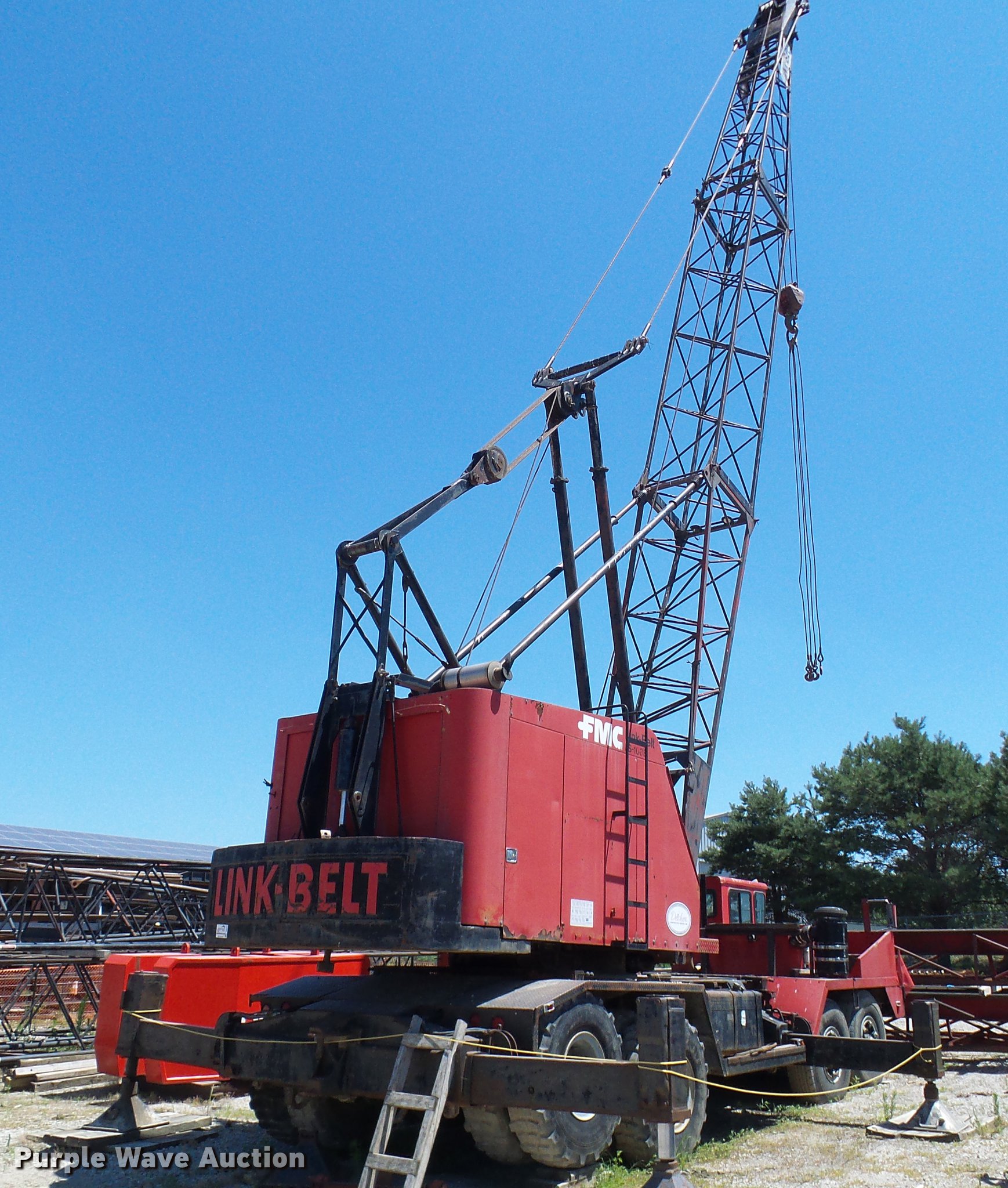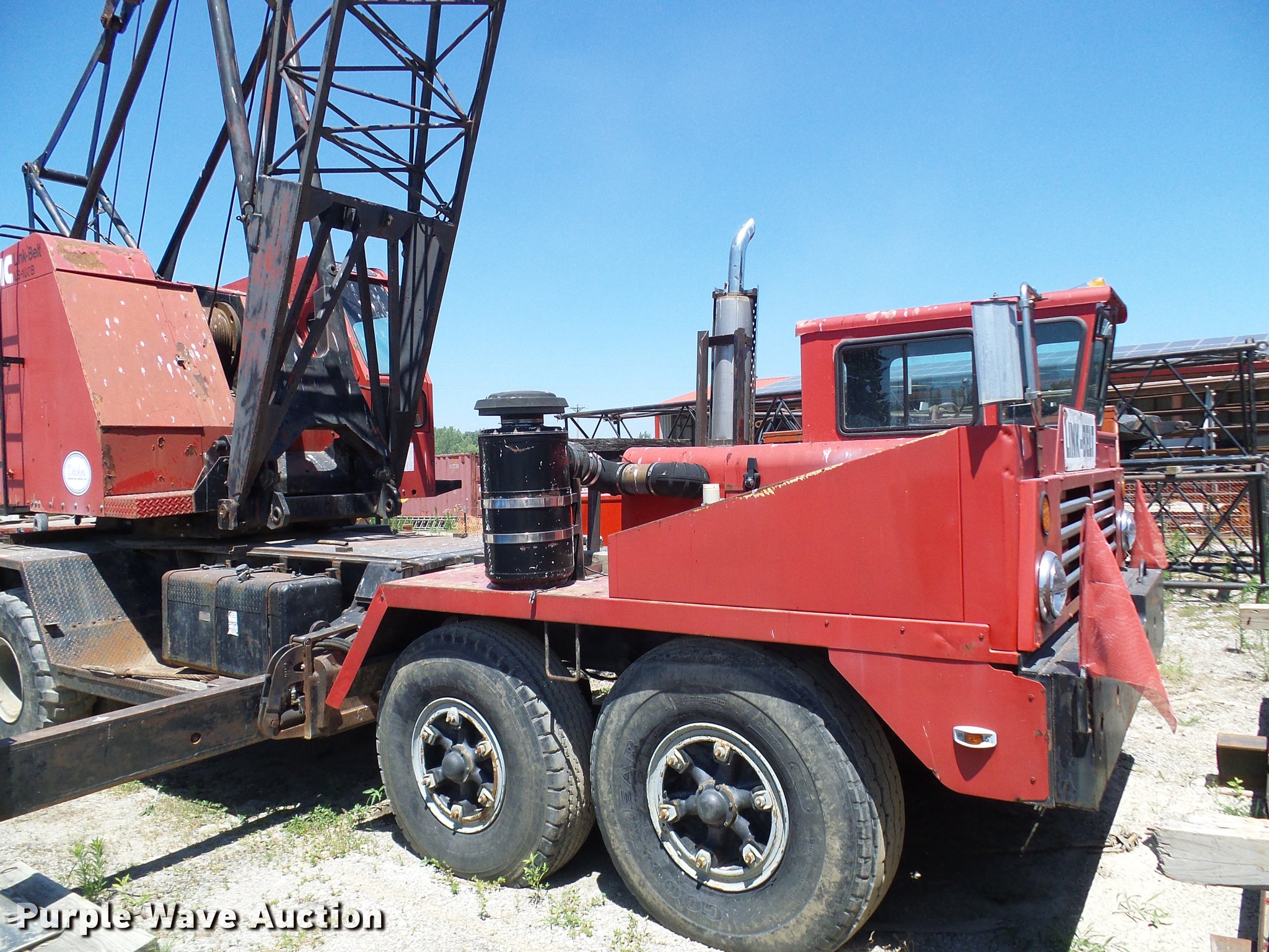 Purple Wave is selling a used Rough or All Terrain Crane in Missouri. This item is a 1966 Link Belt LS-108B lattice boom crane with the following: 5,185 miles on odometer, Detroit Diesel six cylinder turbo diesel upper engine, 1,014 hours on meter, Detroit Diesel six cylinder turbo diesel lower engine, 705 hours on meter, Four speed manual transmission, Tandem axle, (8) drive wheels, (2) steering wheels, Spring suspension seat, Work lights, Stick crane controls, 150' boom length, (8) sections, (4) 20'L sections, 10' section,, 90,000 lbs maximum lift capacity, In-cab boom controls, Crane block, Crane ball and hook, (4) Stabilizers, Spring suspension, Air brakes, 14R20 tires, Serial 9LGH3139