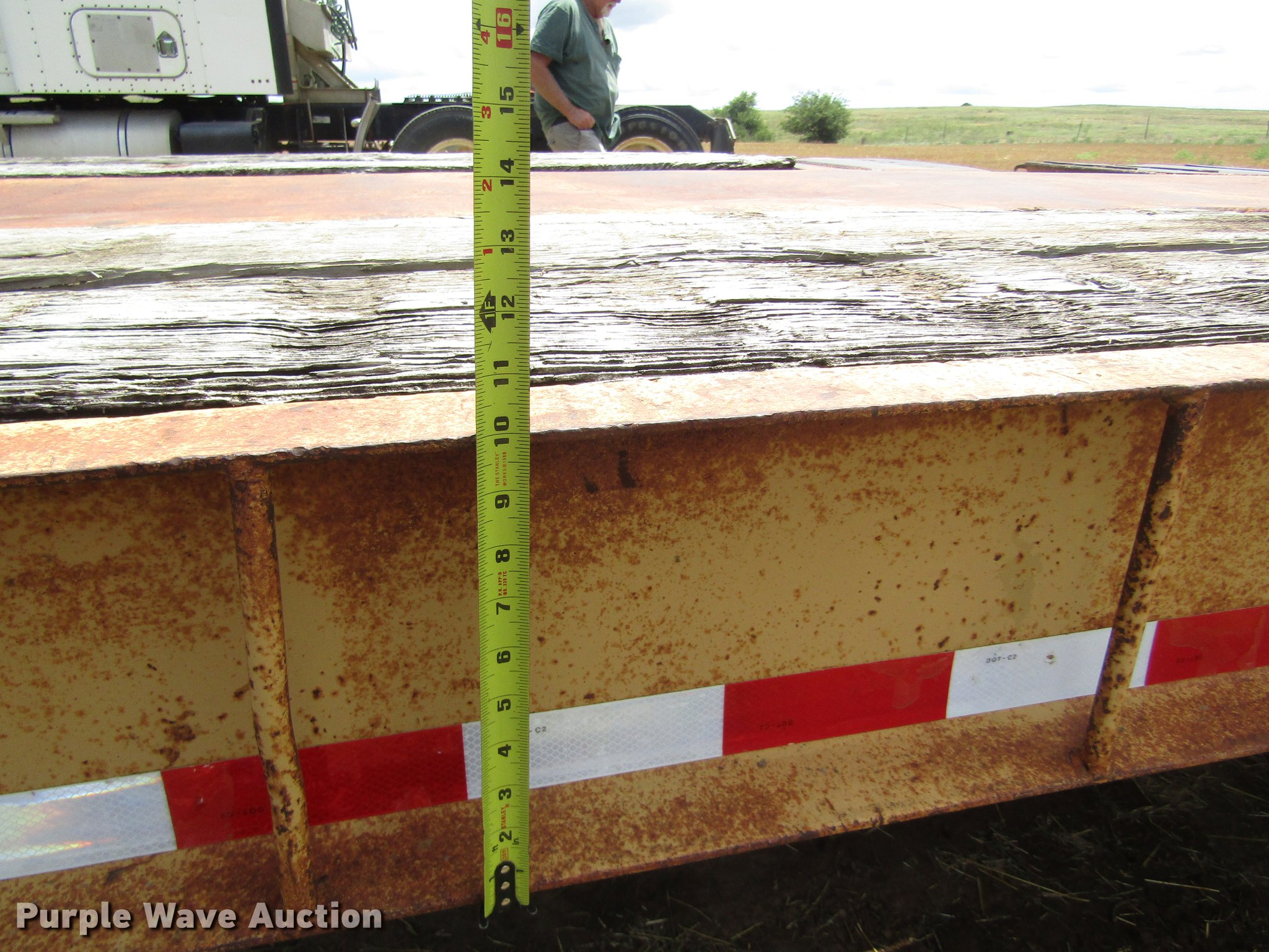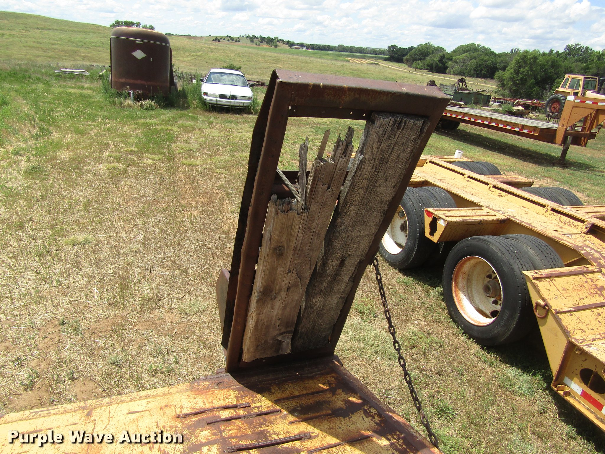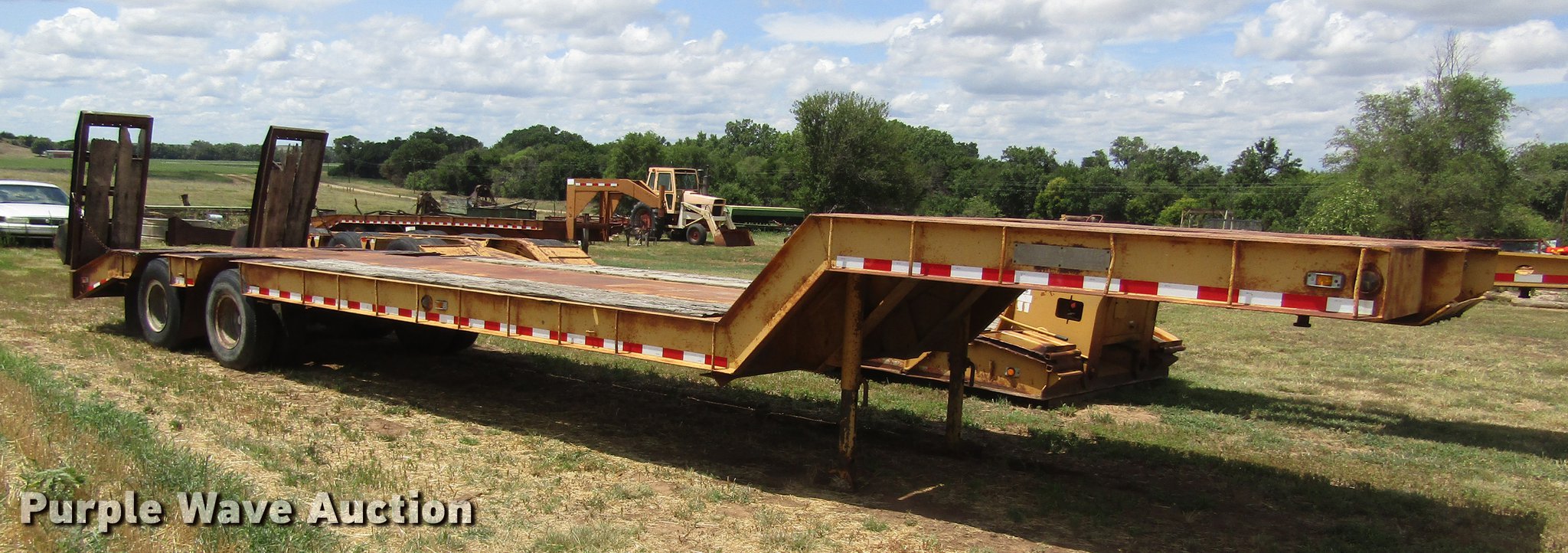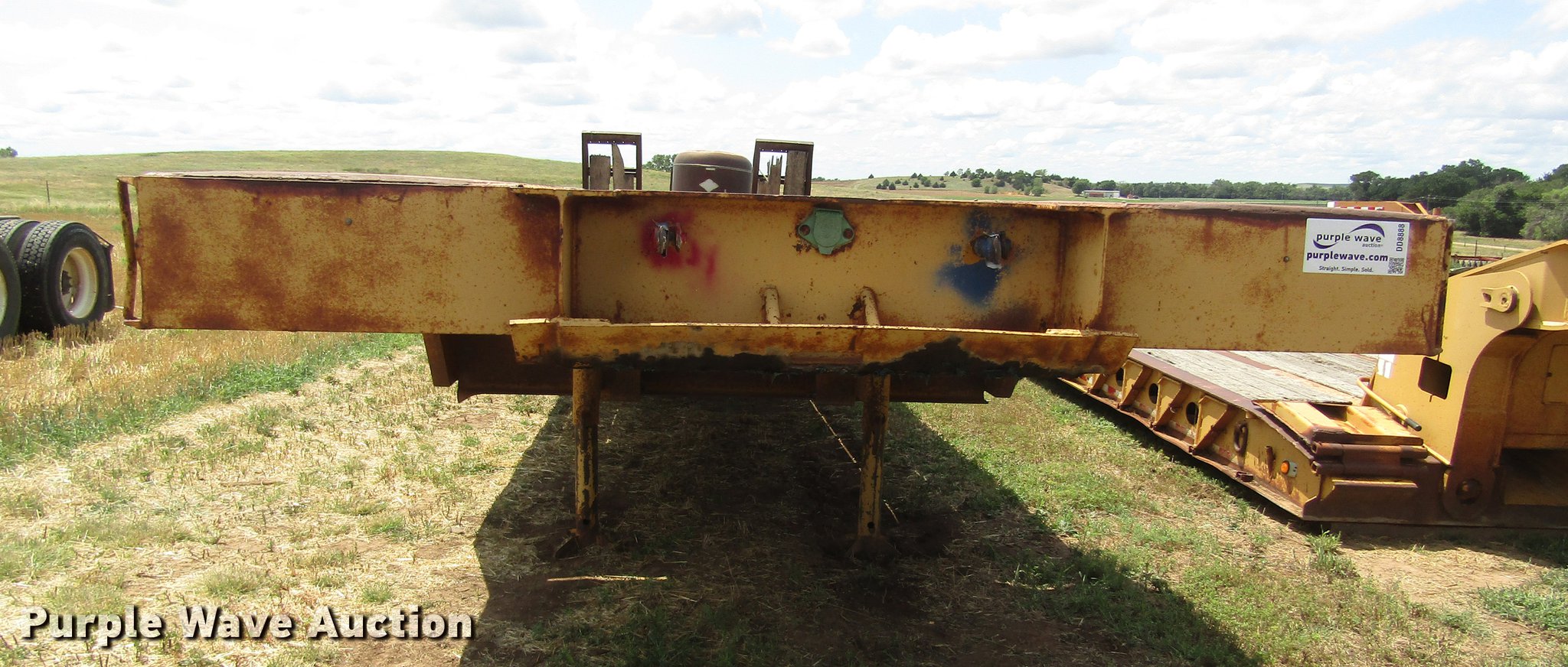 Purple Wave is selling a used Equip. Trailer in Kansas. This item is a 1973 Carrier King 4000 drop deck equipment trailer with the following: 37' overall length, 23'10"L x 95.5"W steel and wood main deck, 96"L upper deck, Dovetail, 5'L ramps, 21" x 24" upper ramps, 200" from front of trailer to tire opening, 220" from front of trailer to rear tire opening, 25 ton capacity, Fifth wheel plate, Dual leg landing gear, Spring suspension, Air brakes, Tandem axle, Steel wheels, 8.25R15TR tires