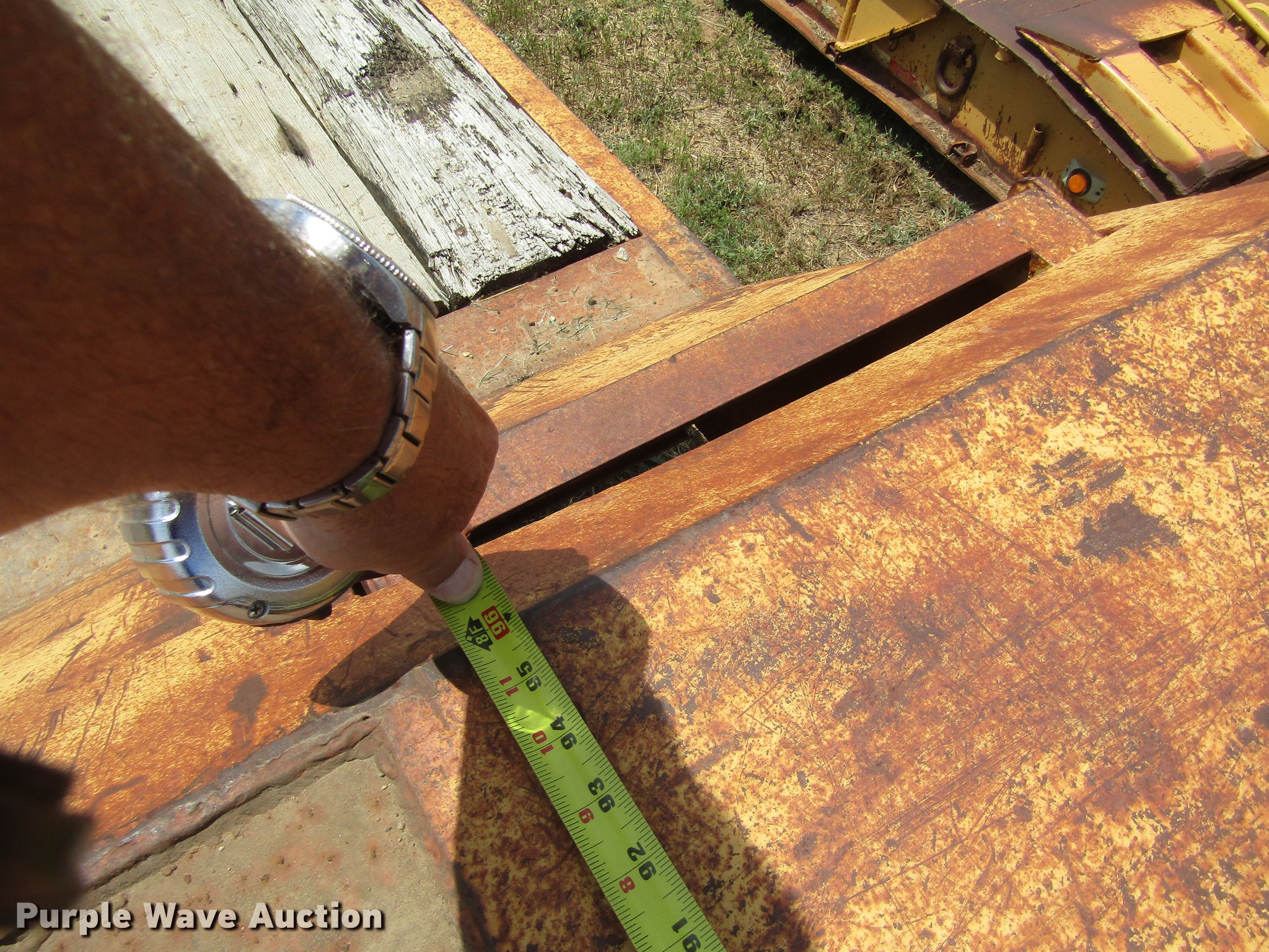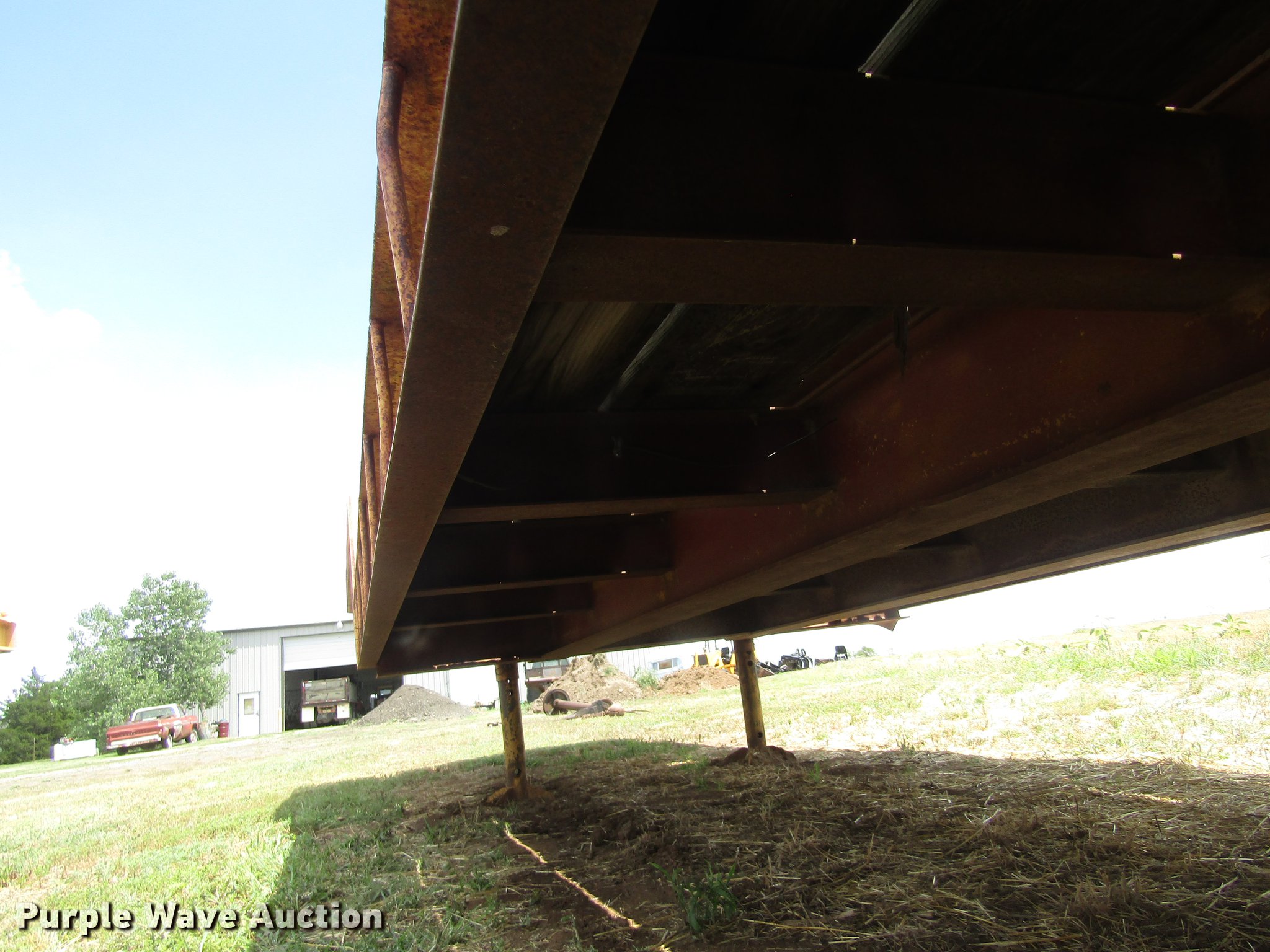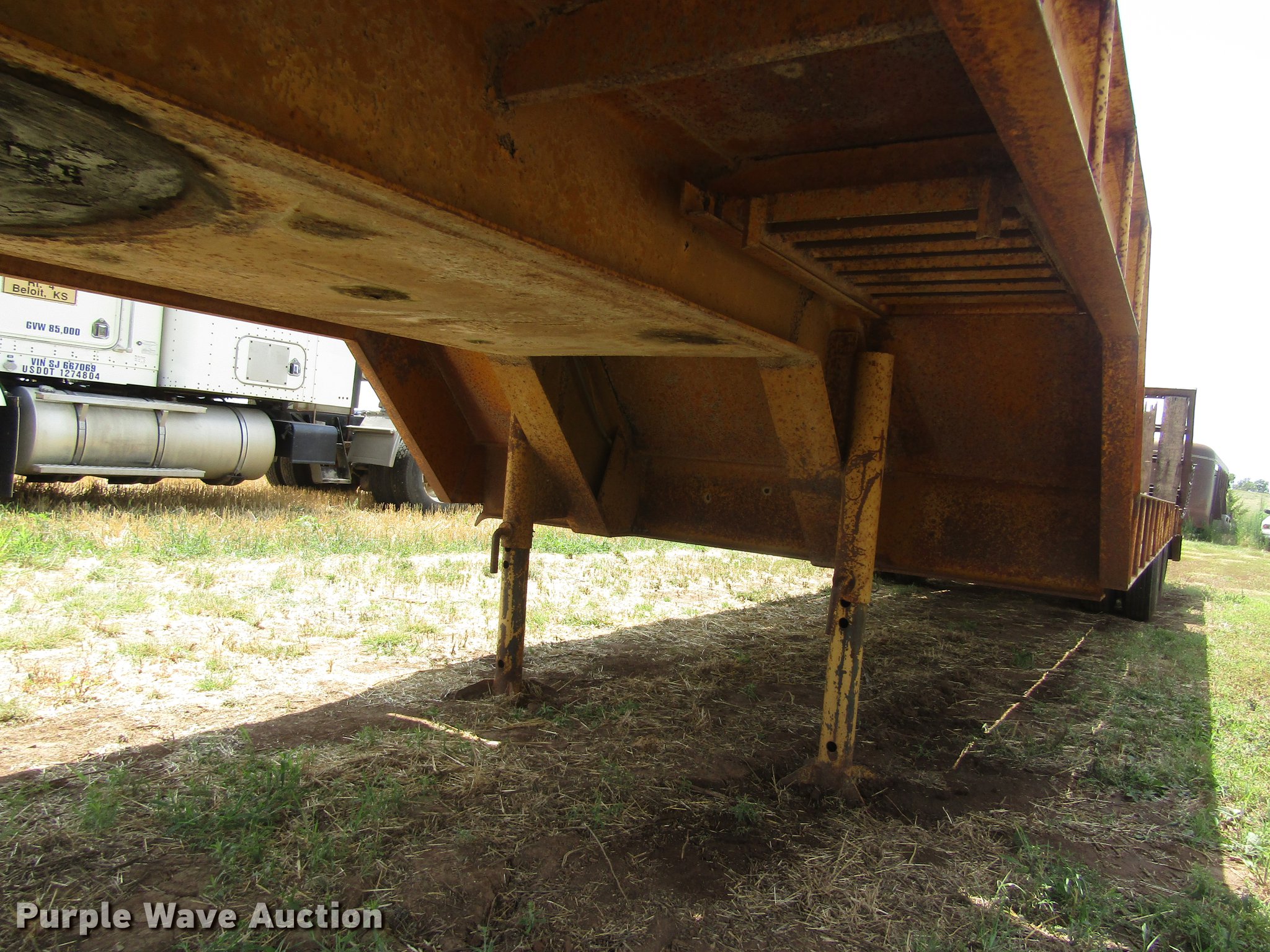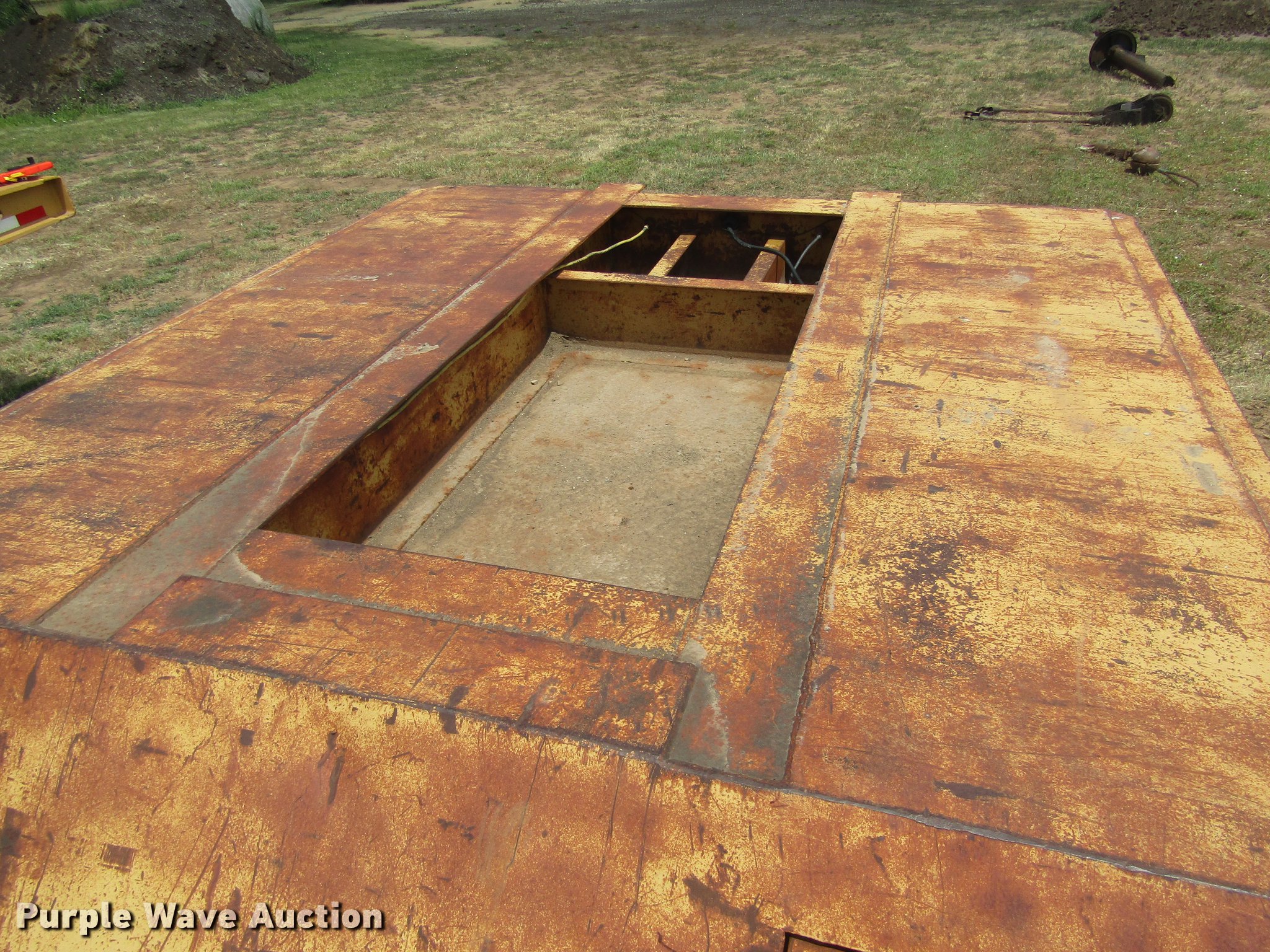 Purple Wave is selling a used Equip. Trailer in Kansas. This item is a 1973 Carrier King 4000 drop deck equipment trailer with the following: 37' overall length, 23'10"L x 95.5"W steel and wood main deck, 96"L upper deck, Dovetail, 5'L ramps, 21" x 24" upper ramps, 200" from front of trailer to tire opening, 220" from front of trailer to rear tire opening, 25 ton capacity, Fifth wheel plate, Dual leg landing gear, Spring suspension, Air brakes, Tandem axle, Steel wheels, 8.25R15TR tires
